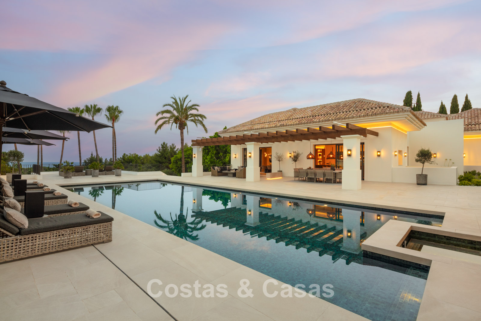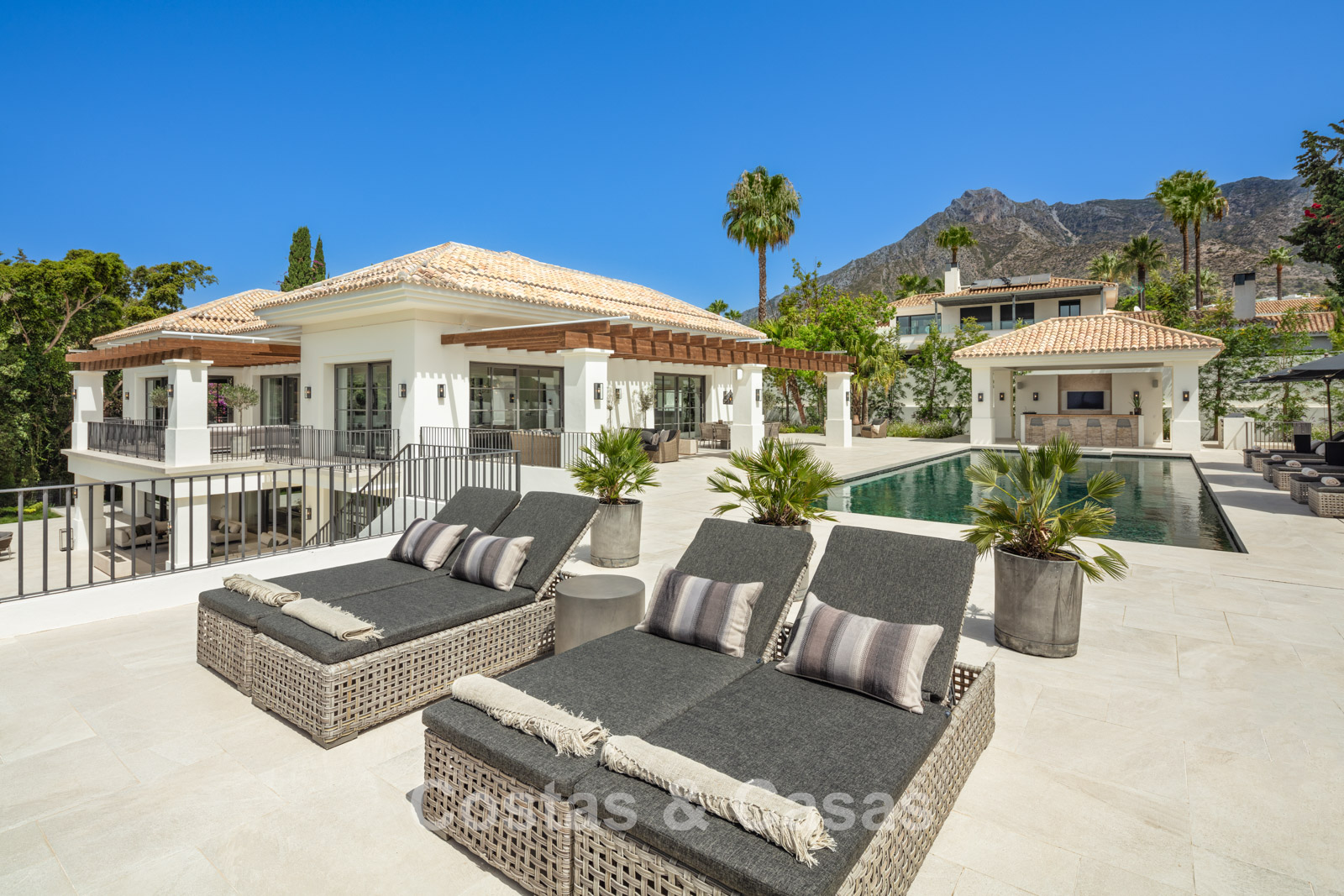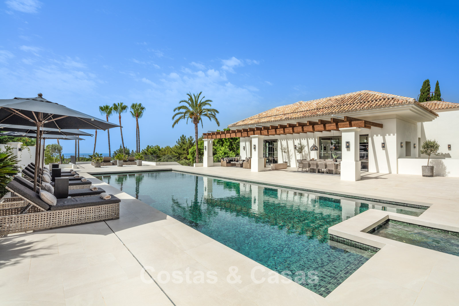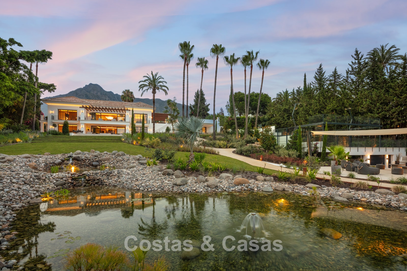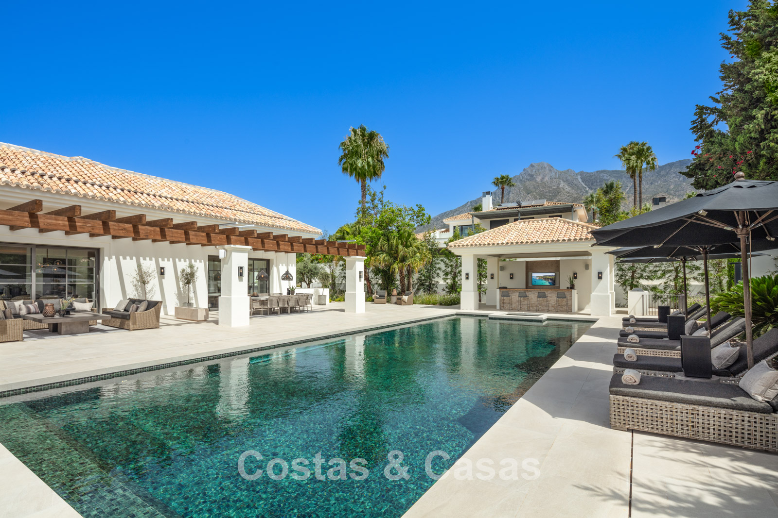 Un terrain spacieux et en pente de 6.043m², entièrement clôturé. Extérieur bien entretenu avec beaucoup de verdure, des massifs fleuris aménagés, des sentiers, des jeux d'eau et un étang. En partie basse, il y a un 2ème accès pour les invités avec une place de parking et un chemin pour buggy jusqu'à la maison. Terrain de pétanque. Piscine d'eau salée géante et chauffée de 17 x 6,50 m avec jacuzzi intégré avec hydromassage et fenêtre sous-marine qui éclaire la zone SPA. Pool house avec bar, cuisine entièrement équipée avec barbecue, douche et toilette. Plusieurs coins salon et salle à manger extérieurs. Propre court de padel et un demi-terrain de basket. Orientée sud avec une belle vue sur les montagnes et la mer. Construit dans une architecture méditerranéenne moderne. Style d'intérieur contemporain élégant et chaleureux.