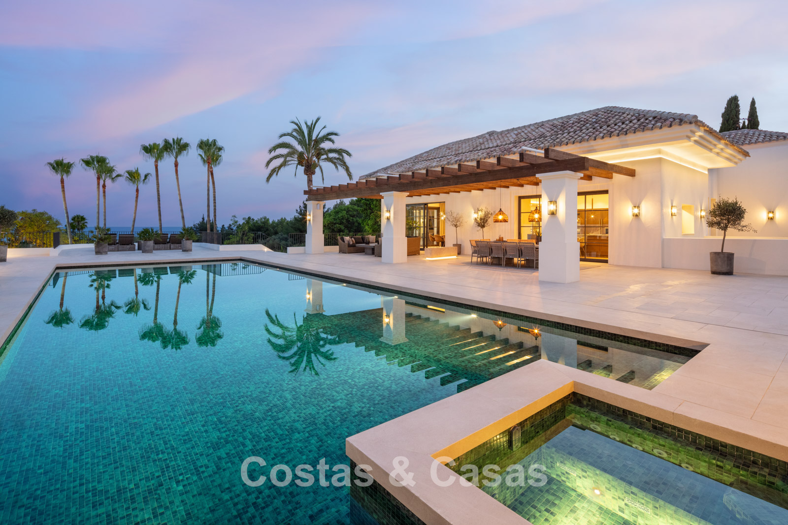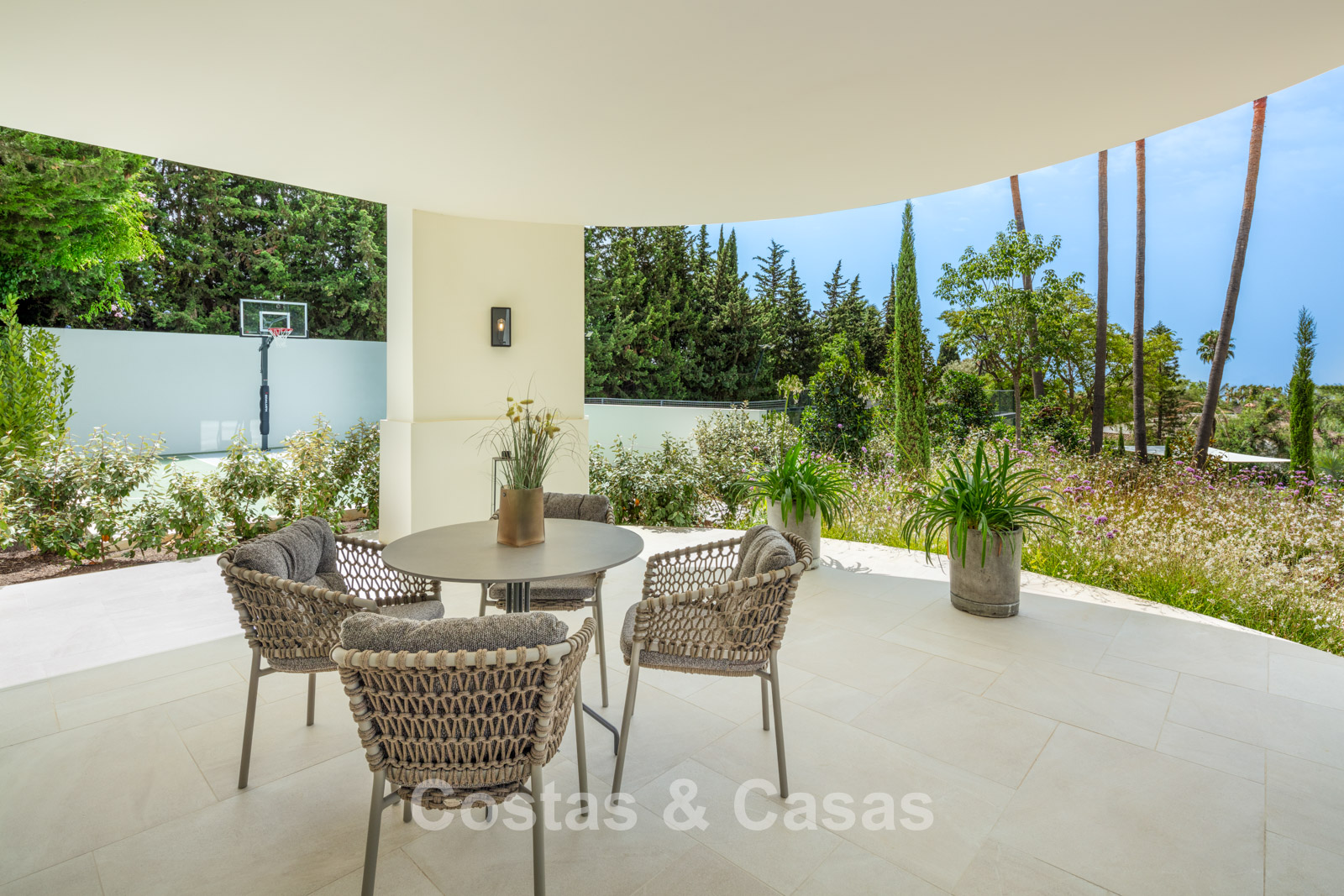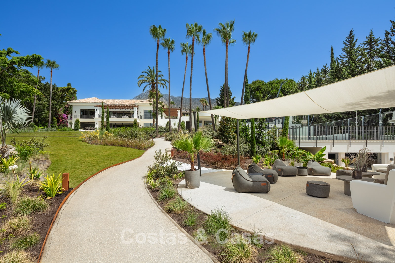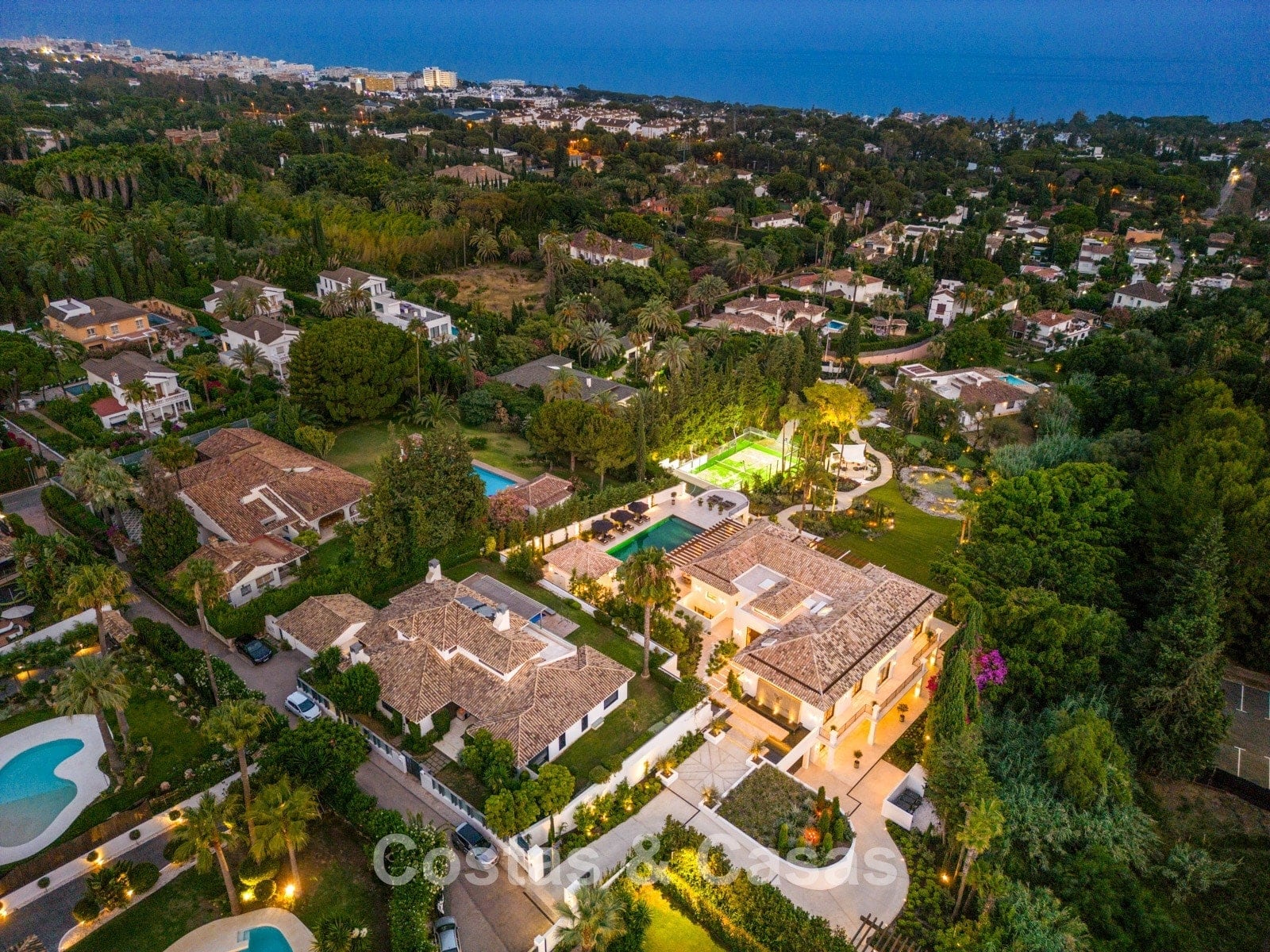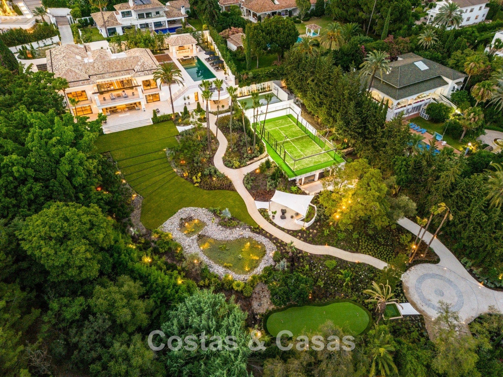 Un terrain spacieux et en pente de 6.043m², entièrement clôturé. Extérieur bien entretenu avec beaucoup de verdure, des massifs fleuris aménagés, des sentiers, des jeux d'eau et un étang. En partie basse, il y a un 2ème accès pour les invités avec une place de parking et un chemin pour buggy jusqu'à la maison. Terrain de pétanque. Piscine d'eau salée géante et chauffée de 17 x 6,50 m avec jacuzzi intégré avec hydromassage et fenêtre sous-marine qui éclaire la zone SPA. Pool house avec bar, cuisine entièrement équipée avec barbecue, douche et toilette. Plusieurs coins salon et salle à manger extérieurs. Propre court de padel et un demi-terrain de basket. Orientée sud avec une belle vue sur les montagnes et la mer. Construit dans une architecture méditerranéenne moderne. Style d'intérieur contemporain élégant et chaleureux.