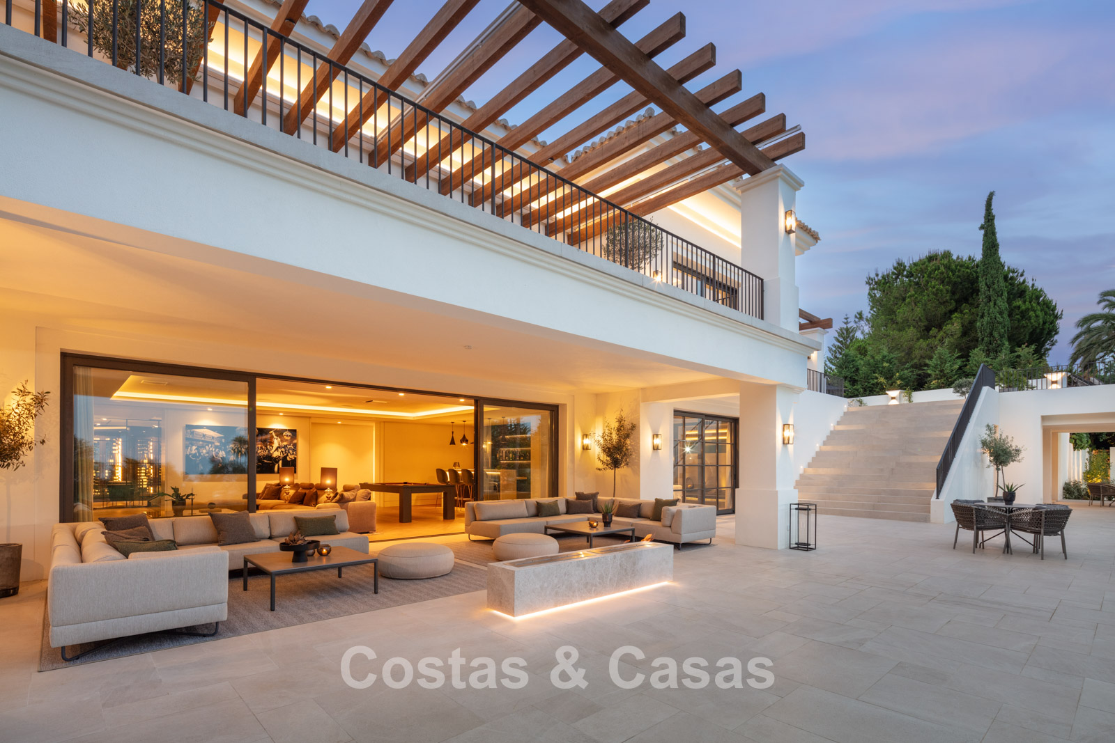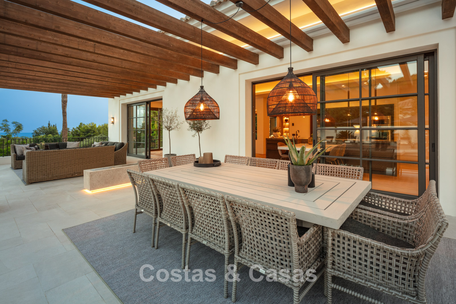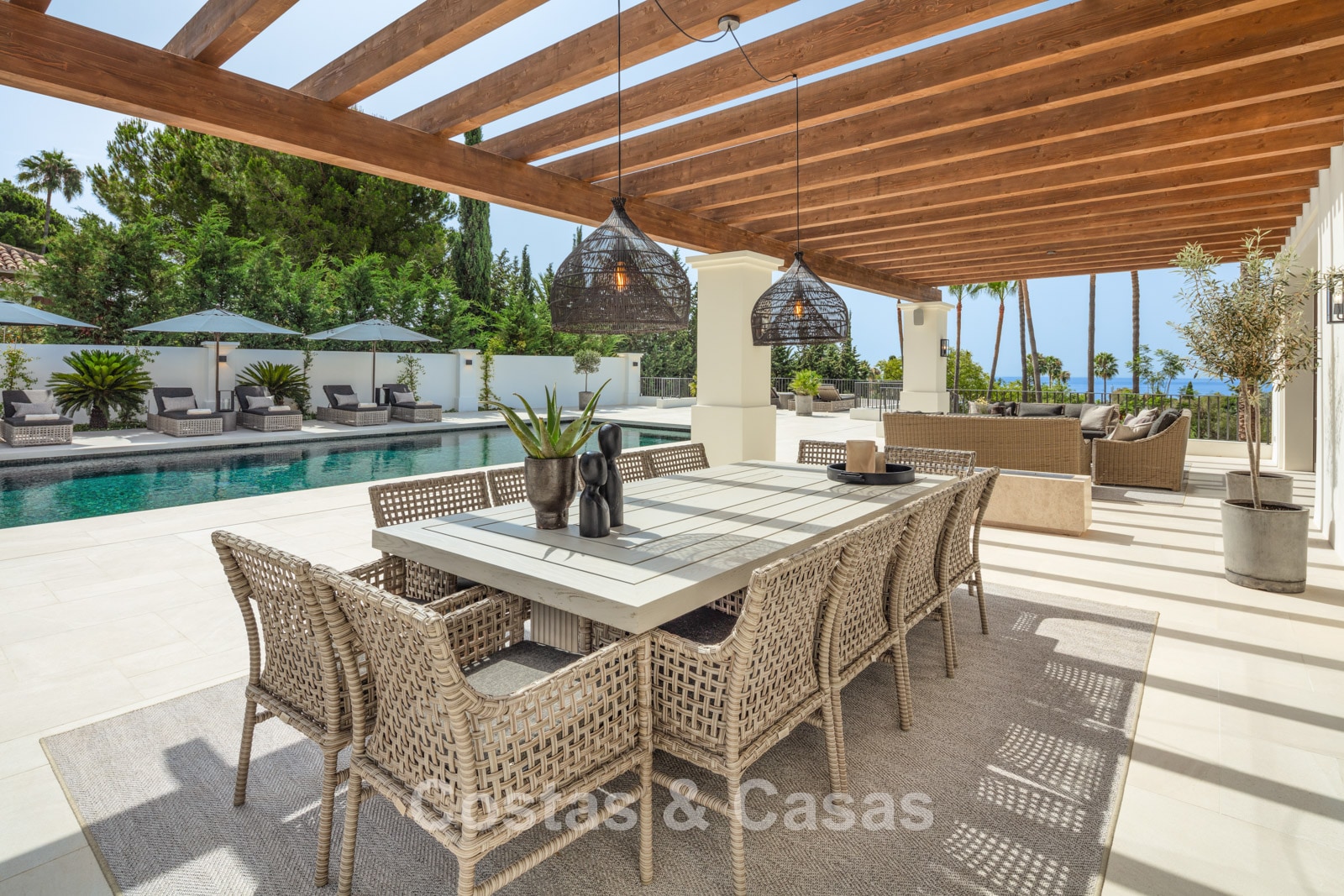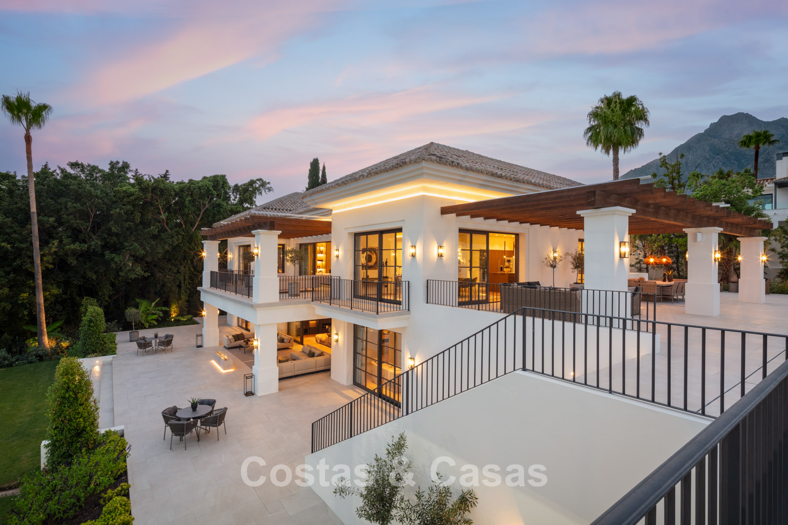 Un terrain spacieux et en pente de 6.043m², entièrement clôturé. Extérieur bien entretenu avec beaucoup de verdure, des massifs fleuris aménagés, des sentiers, des jeux d'eau et un étang. En partie basse, il y a un 2ème accès pour les invités avec une place de parking et un chemin pour buggy jusqu'à la maison. Terrain de pétanque. Piscine d'eau salée géante et chauffée de 17 x 6,50 m avec jacuzzi intégré avec hydromassage et fenêtre sous-marine qui éclaire la zone SPA. Pool house avec bar, cuisine entièrement équipée avec barbecue, douche et toilette. Plusieurs coins salon et salle à manger extérieurs. Propre court de padel et un demi-terrain de basket. Orientée sud avec une belle vue sur les montagnes et la mer. Construit dans une architecture méditerranéenne moderne. Style d'intérieur contemporain élégant et chaleureux.