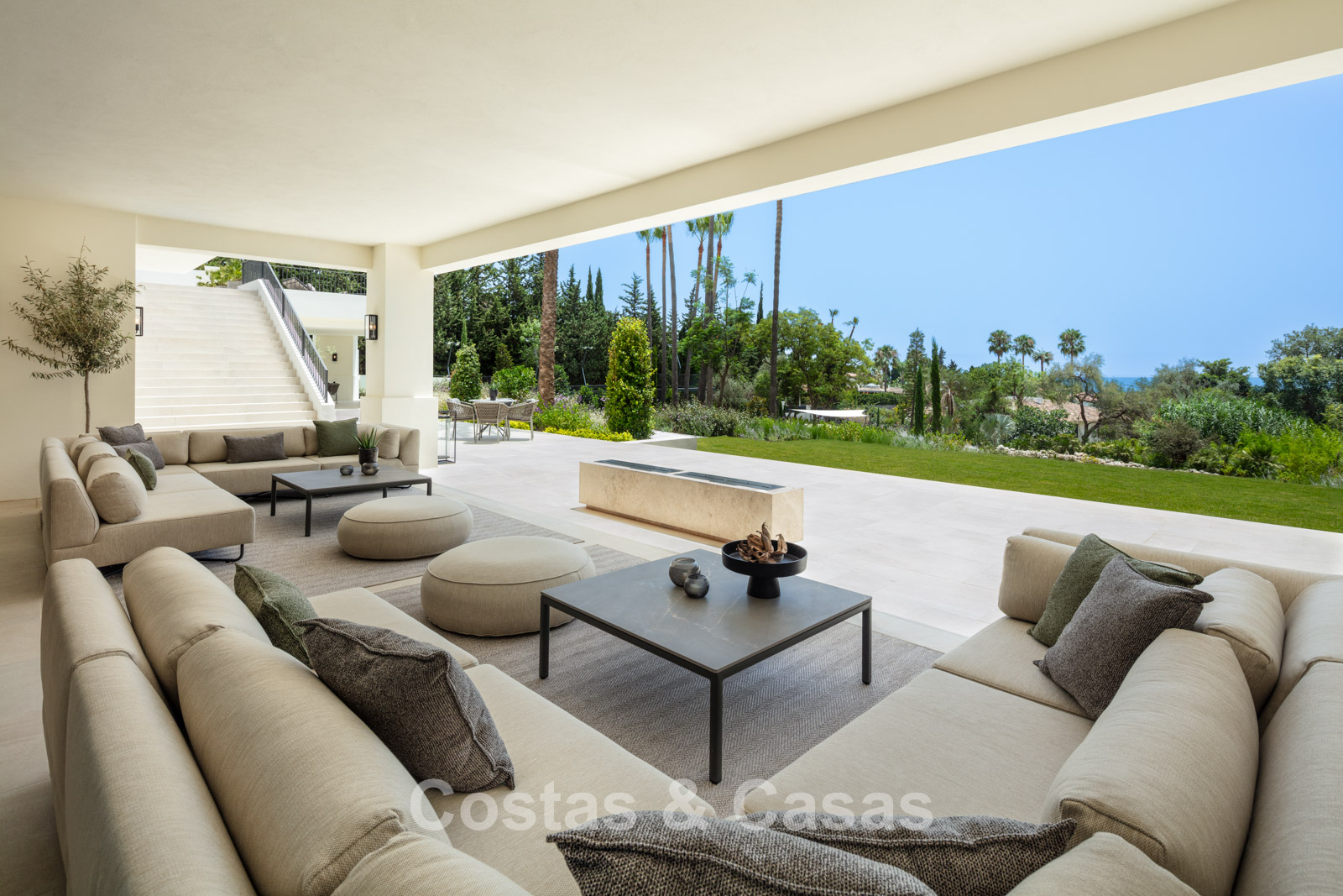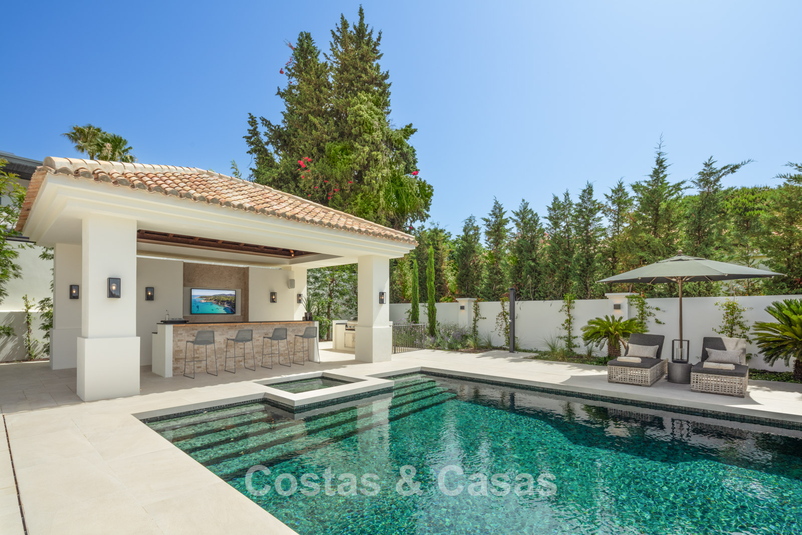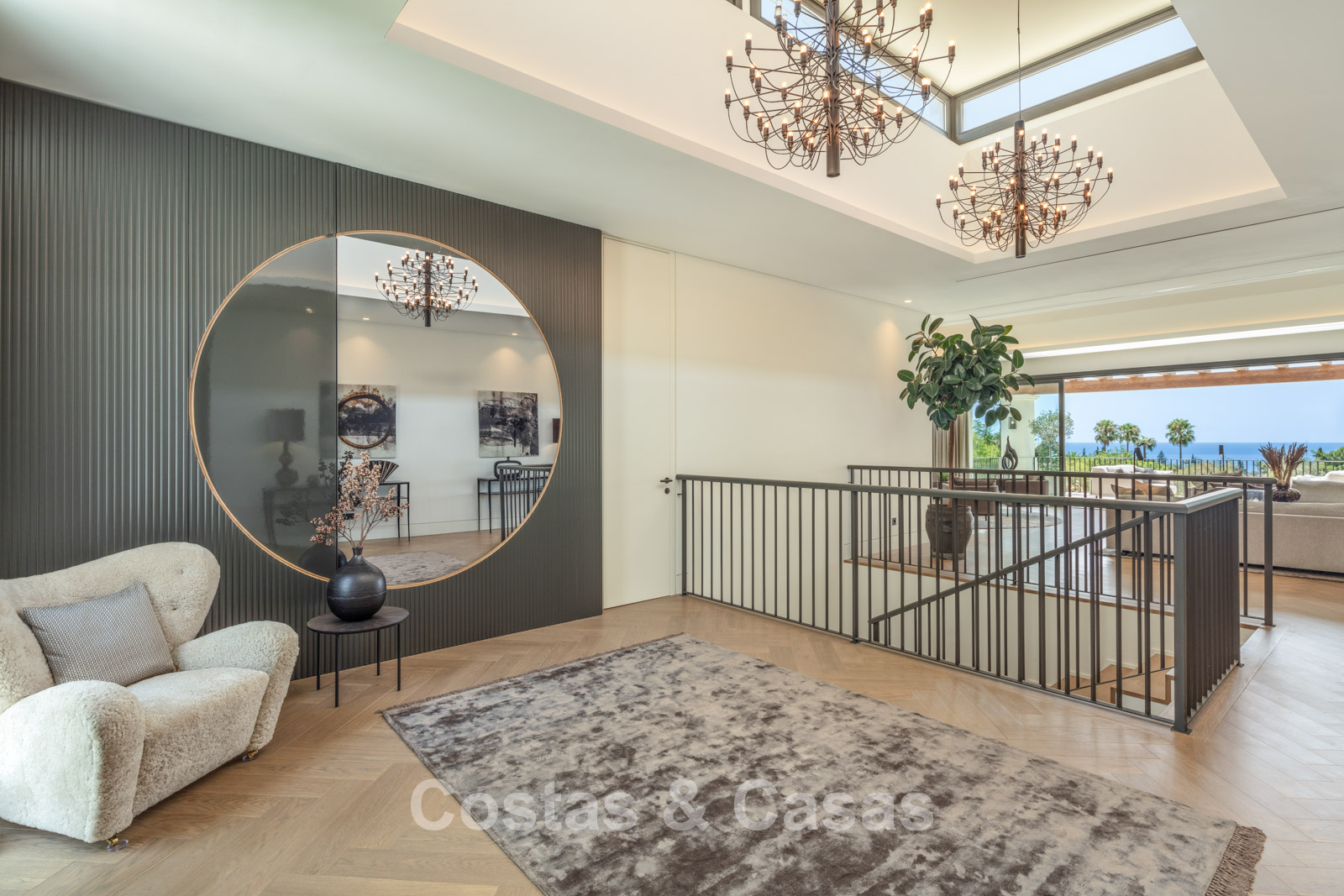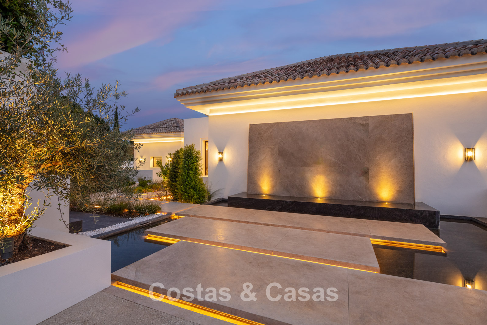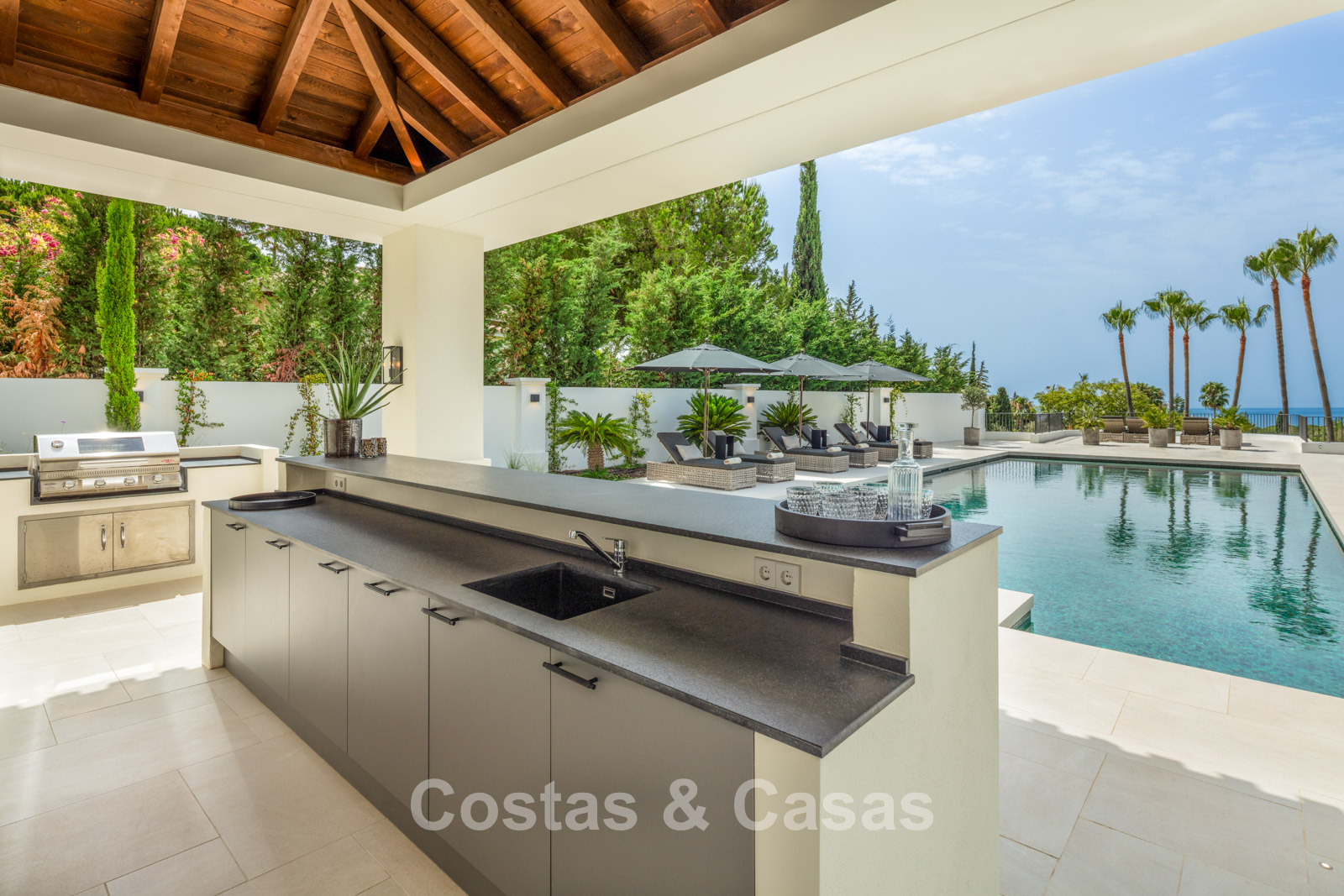 Un terrain spacieux et en pente de 6.043m², entièrement clôturé. Extérieur bien entretenu avec beaucoup de verdure, des massifs fleuris aménagés, des sentiers, des jeux d'eau et un étang. En partie basse, il y a un 2ème accès pour les invités avec une place de parking et un chemin pour buggy jusqu'à la maison. Terrain de pétanque. Piscine d'eau salée géante et chauffée de 17 x 6,50 m avec jacuzzi intégré avec hydromassage et fenêtre sous-marine qui éclaire la zone SPA. Pool house avec bar, cuisine entièrement équipée avec barbecue, douche et toilette. Plusieurs coins salon et salle à manger extérieurs. Propre court de padel et un demi-terrain de basket. Orientée sud avec une belle vue sur les montagnes et la mer. Construit dans une architecture méditerranéenne moderne. Style d'intérieur contemporain élégant et chaleureux.