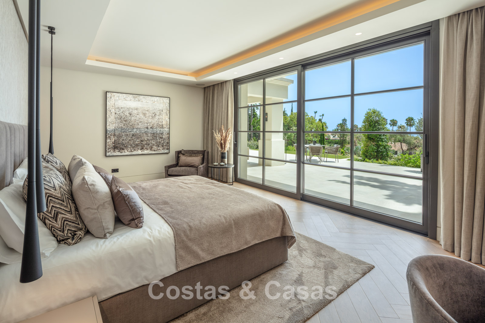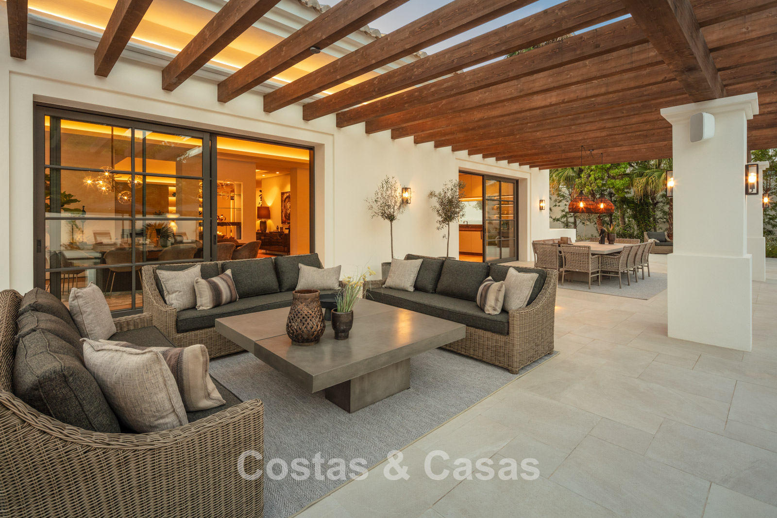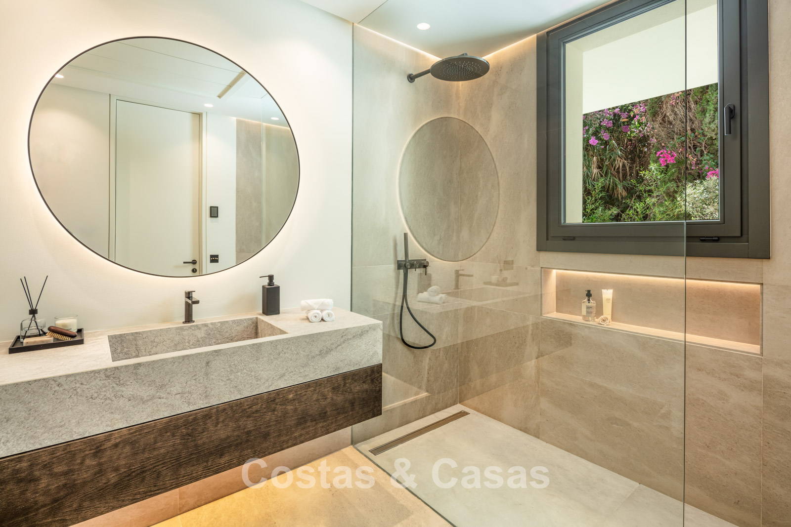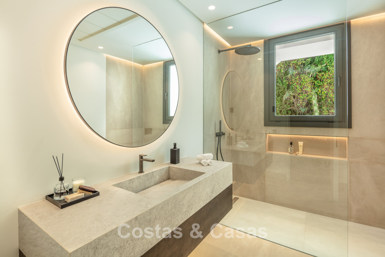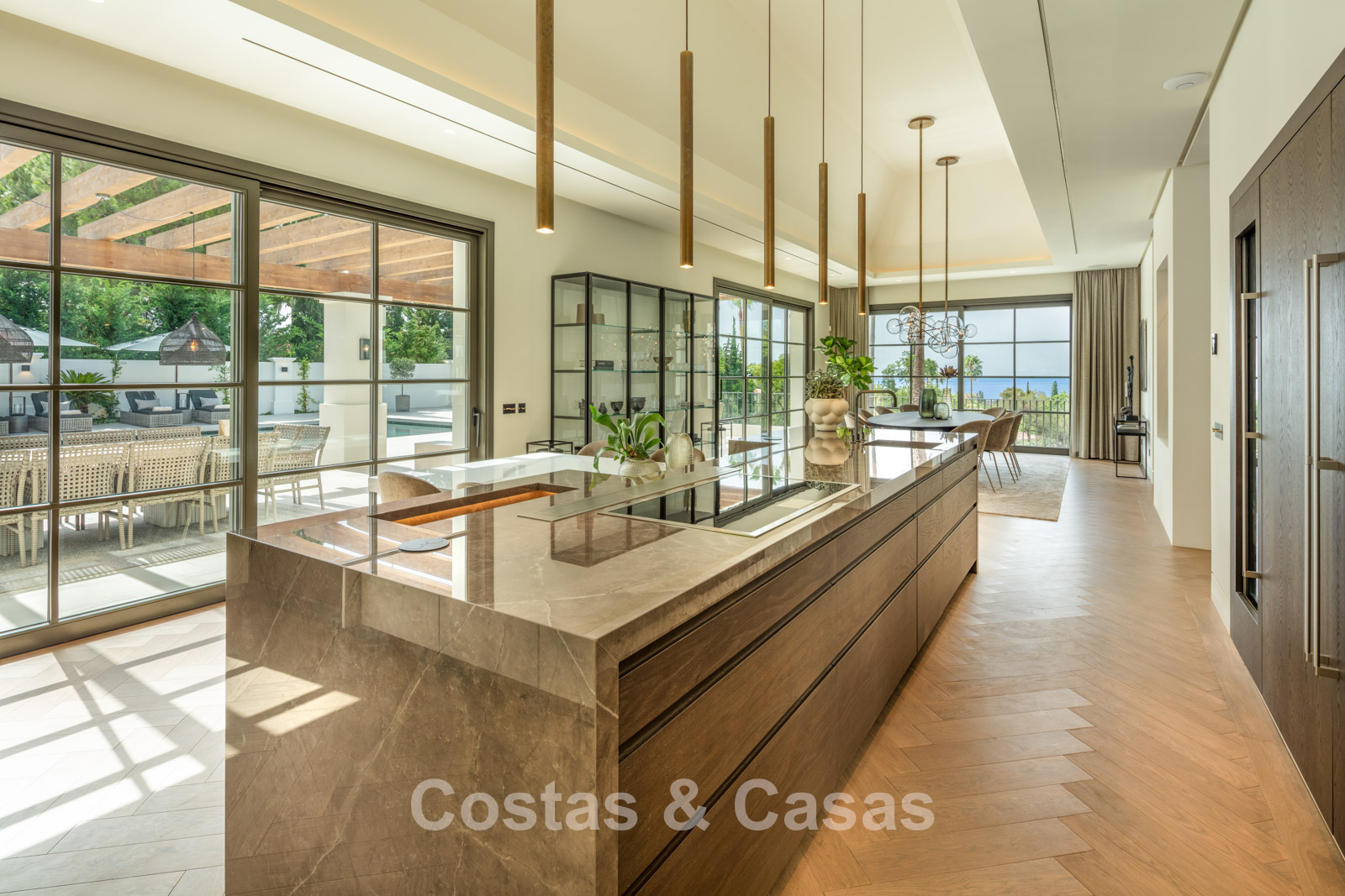 Un terrain spacieux et en pente de 6.043m², entièrement clôturé. Extérieur bien entretenu avec beaucoup de verdure, des massifs fleuris aménagés, des sentiers, des jeux d'eau et un étang. En partie basse, il y a un 2ème accès pour les invités avec une place de parking et un chemin pour buggy jusqu'à la maison. Terrain de pétanque. Piscine d'eau salée géante et chauffée de 17 x 6,50 m avec jacuzzi intégré avec hydromassage et fenêtre sous-marine qui éclaire la zone SPA. Pool house avec bar, cuisine entièrement équipée avec barbecue, douche et toilette. Plusieurs coins salon et salle à manger extérieurs. Propre court de padel et un demi-terrain de basket. Orientée sud avec une belle vue sur les montagnes et la mer. Construit dans une architecture méditerranéenne moderne. Style d'intérieur contemporain élégant et chaleureux.