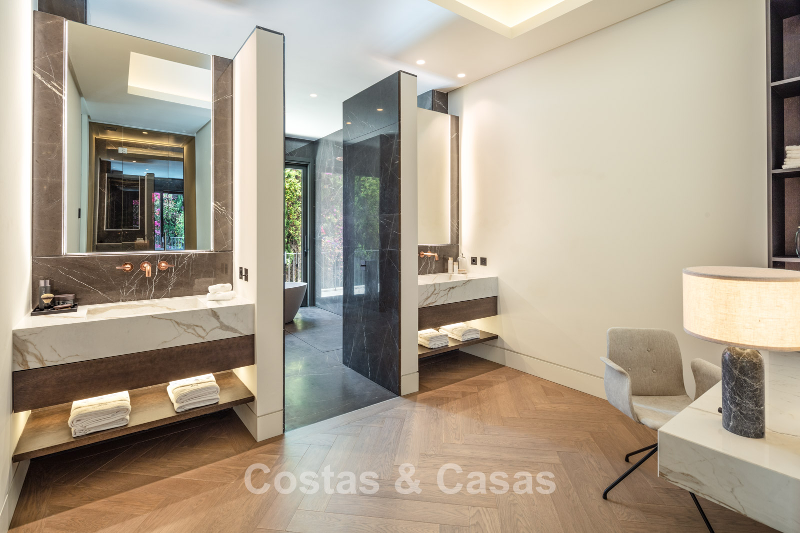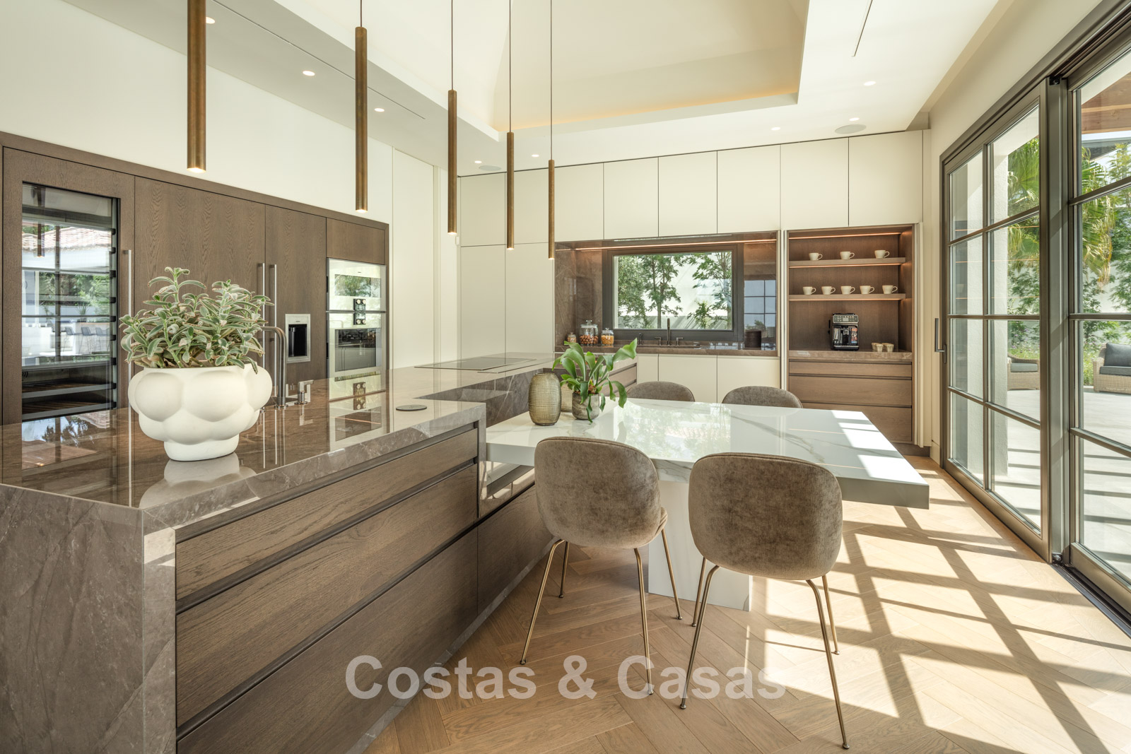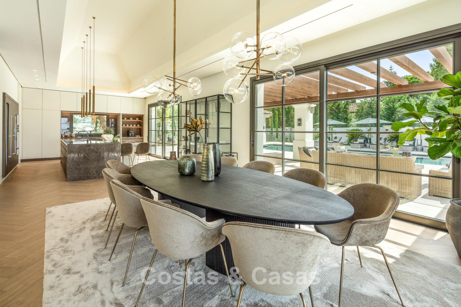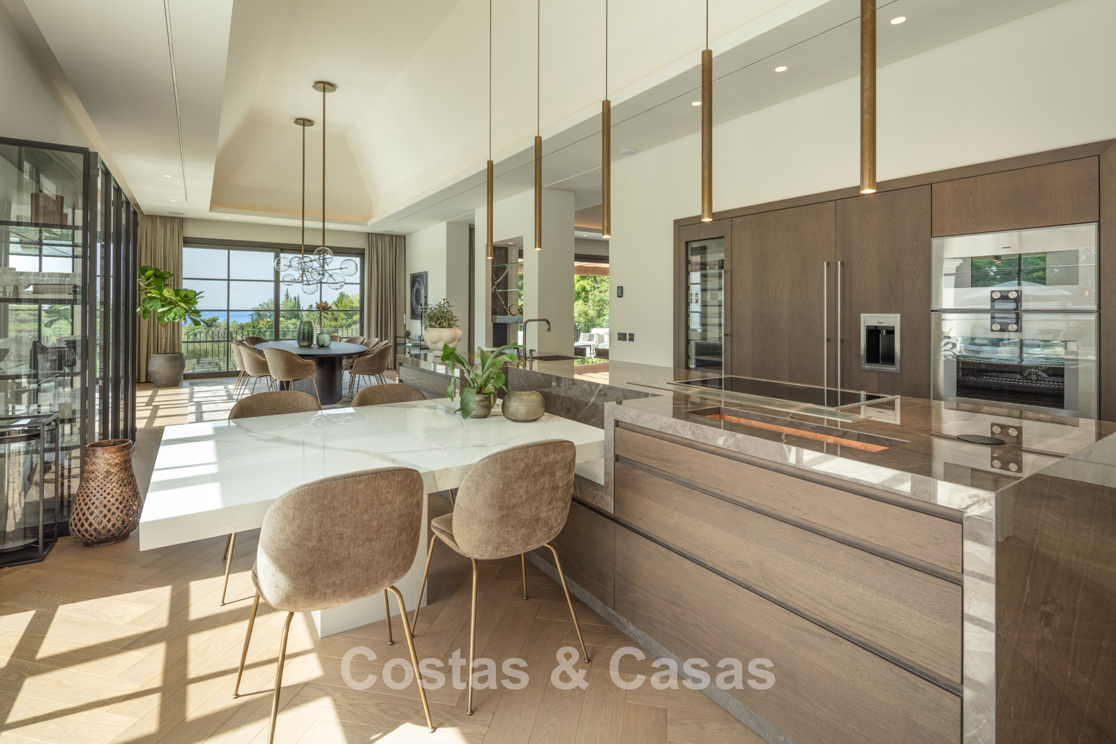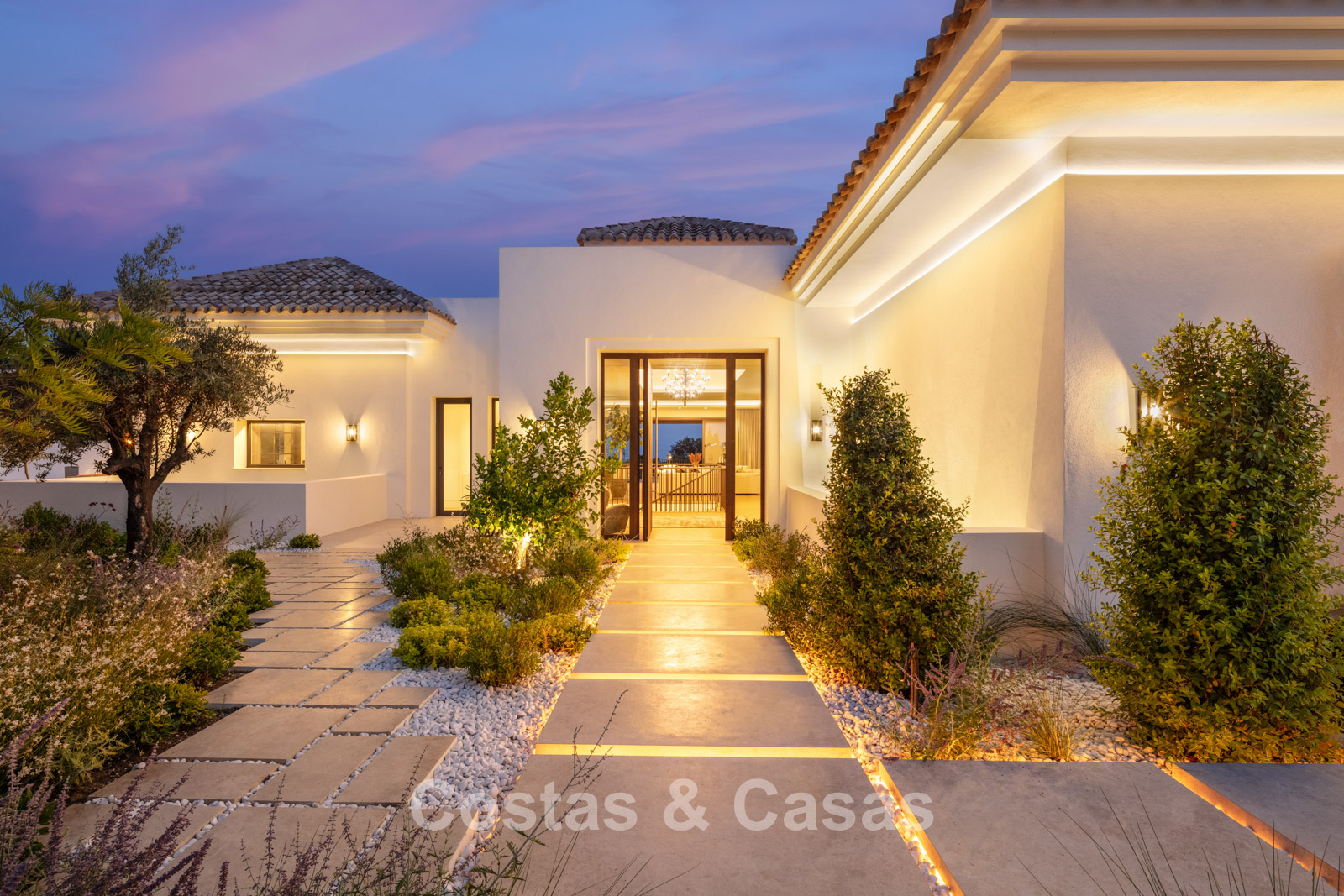 Un terrain spacieux et en pente de 6.043m², entièrement clôturé. Extérieur bien entretenu avec beaucoup de verdure, des massifs fleuris aménagés, des sentiers, des jeux d'eau et un étang. En partie basse, il y a un 2ème accès pour les invités avec une place de parking et un chemin pour buggy jusqu'à la maison. Terrain de pétanque. Piscine d'eau salée géante et chauffée de 17 x 6,50 m avec jacuzzi intégré avec hydromassage et fenêtre sous-marine qui éclaire la zone SPA. Pool house avec bar, cuisine entièrement équipée avec barbecue, douche et toilette. Plusieurs coins salon et salle à manger extérieurs. Propre court de padel et un demi-terrain de basket. Orientée sud avec une belle vue sur les montagnes et la mer. Construit dans une architecture méditerranéenne moderne. Style d'intérieur contemporain élégant et chaleureux.