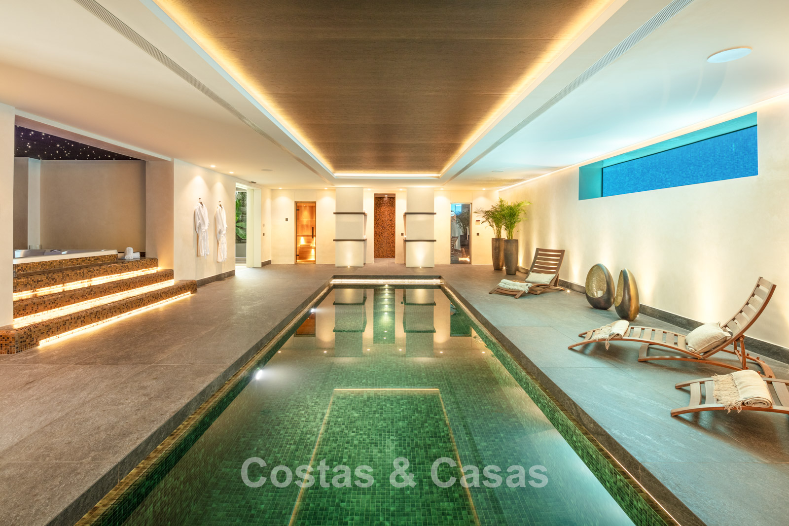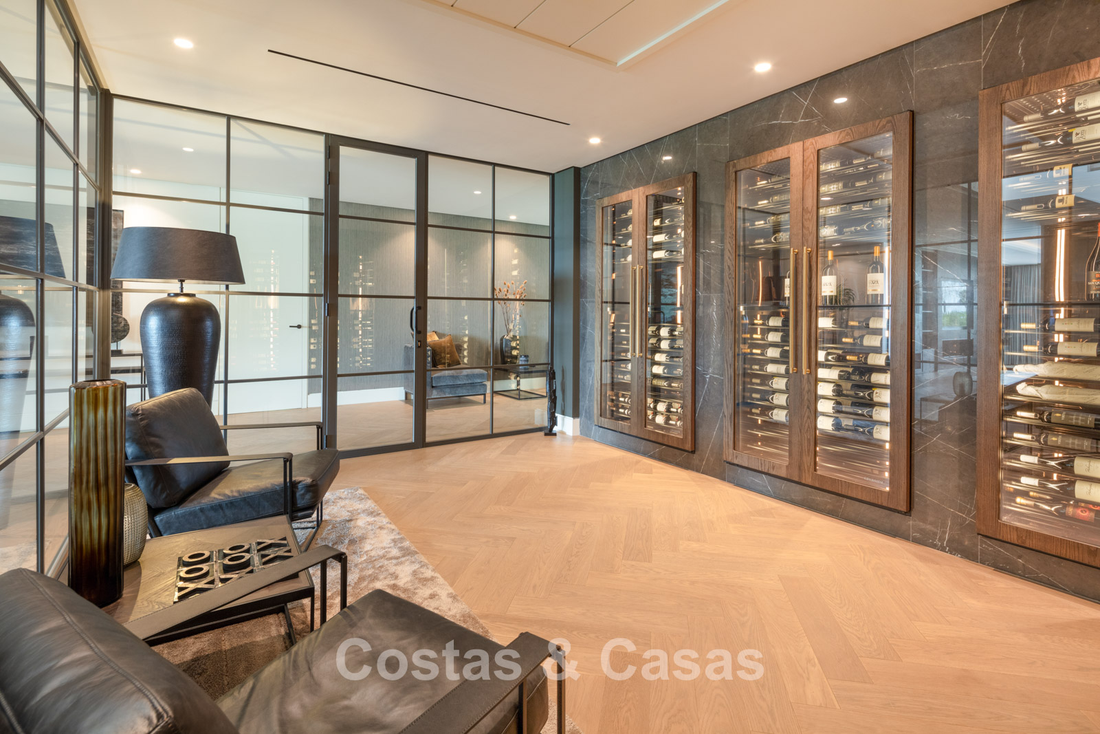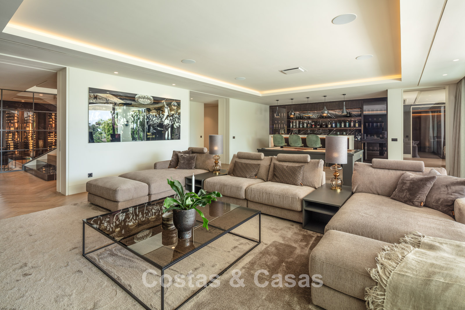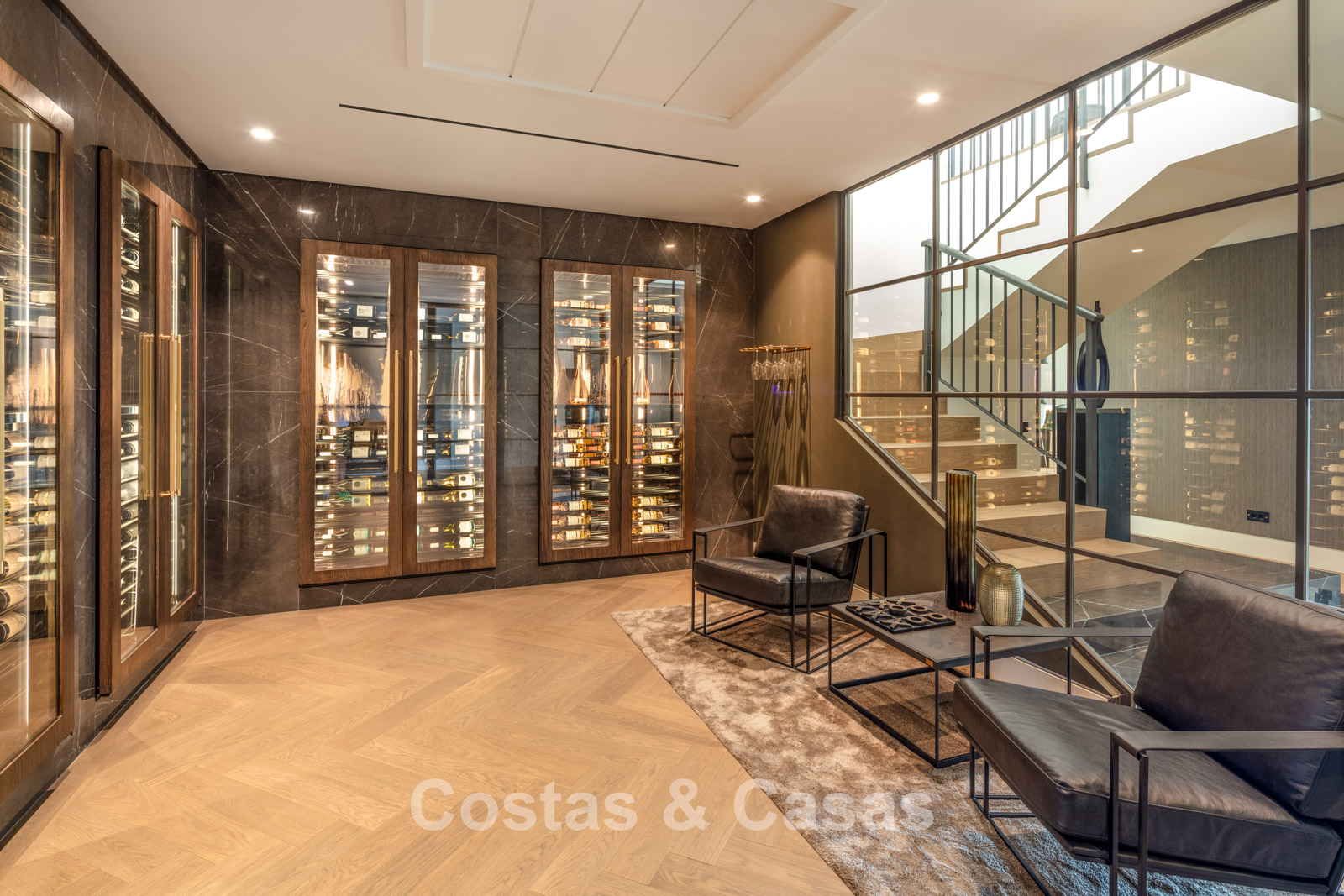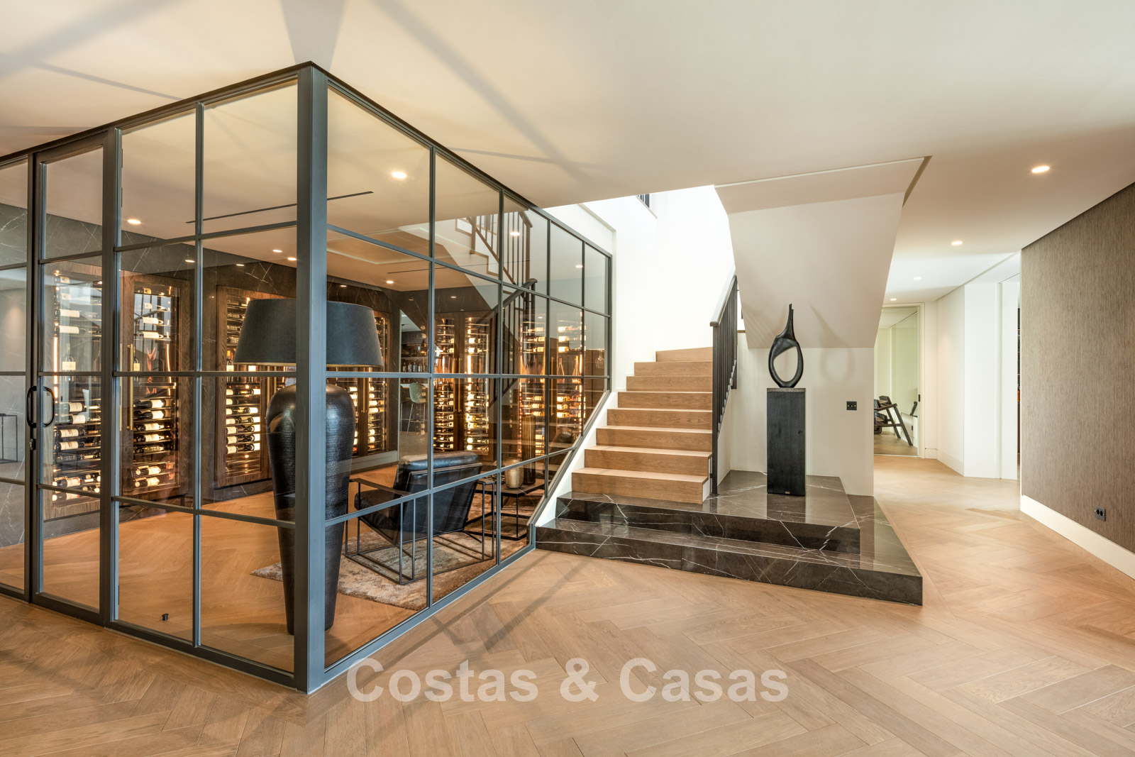 Rez-de-chaussée 0 Toilette invités. Espace récréatif de 92m² équipé d'un chill-out, table de poker et bar. Espace bien-être avec piscine intérieure chauffée intégrée de 9x3m, bain turc, sauna, douche, jacuzzi et salle de massage avec salon de coiffure. Bodega à vin en verre avec contrôle indépendant de la température. Salle de remise en forme équipée. 4 chambres en suite. Local technique, débarras. Buanderie avec 2 lave-linge Miele et 2 sèche-linge Miele. Garage intérieur pour 6 voitures maximum. Abri pour une voiture. Parking invités pour 4 voitures.