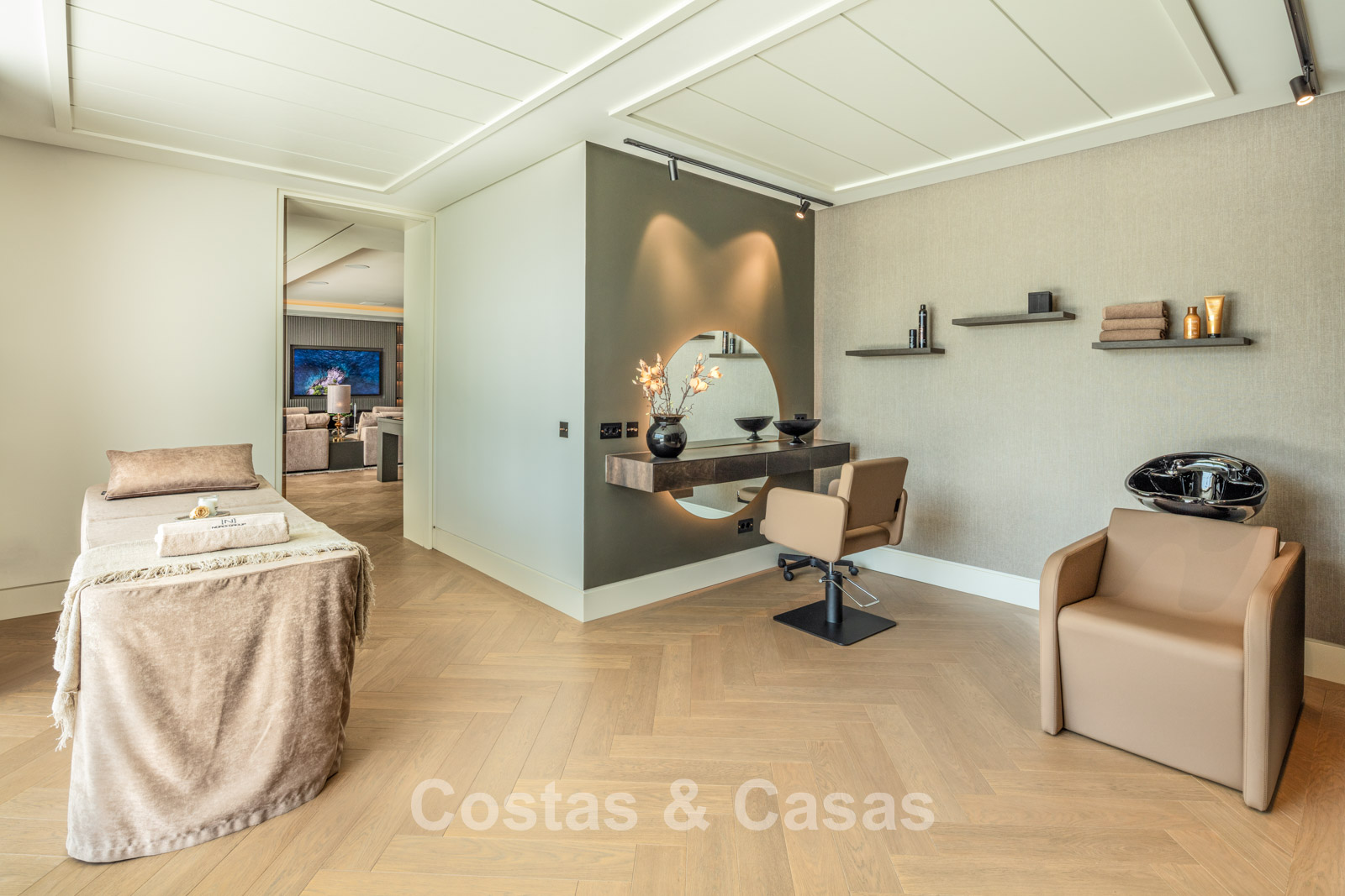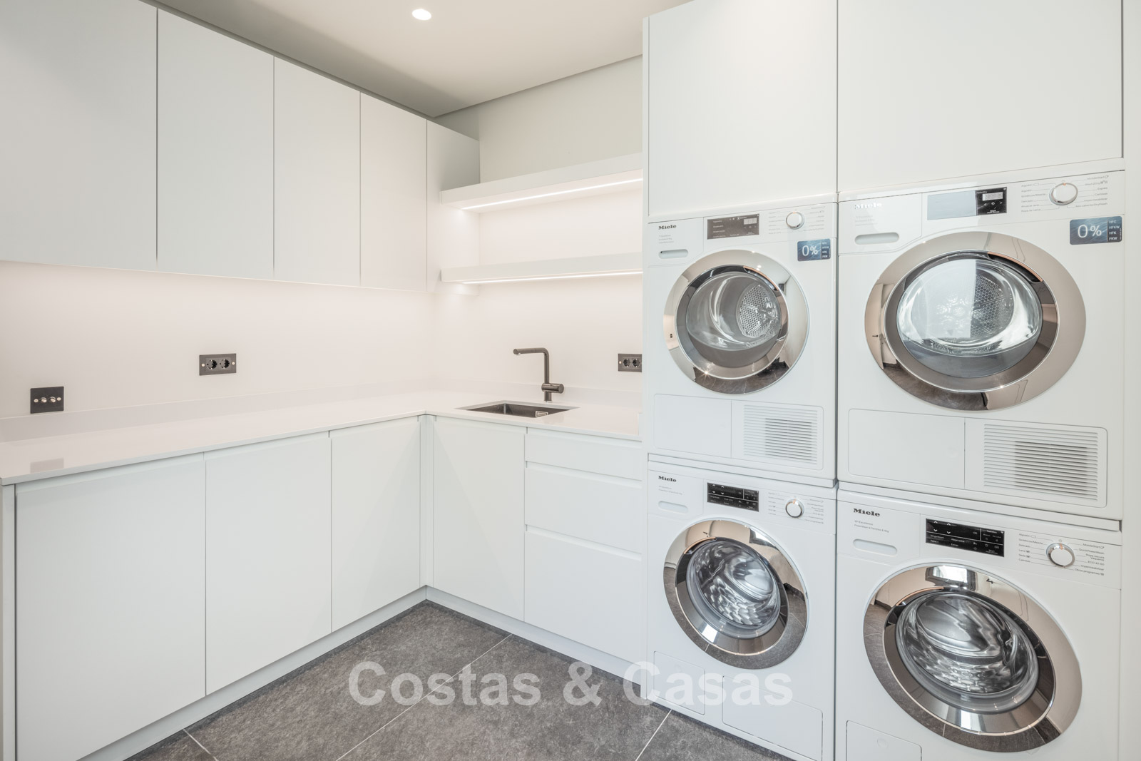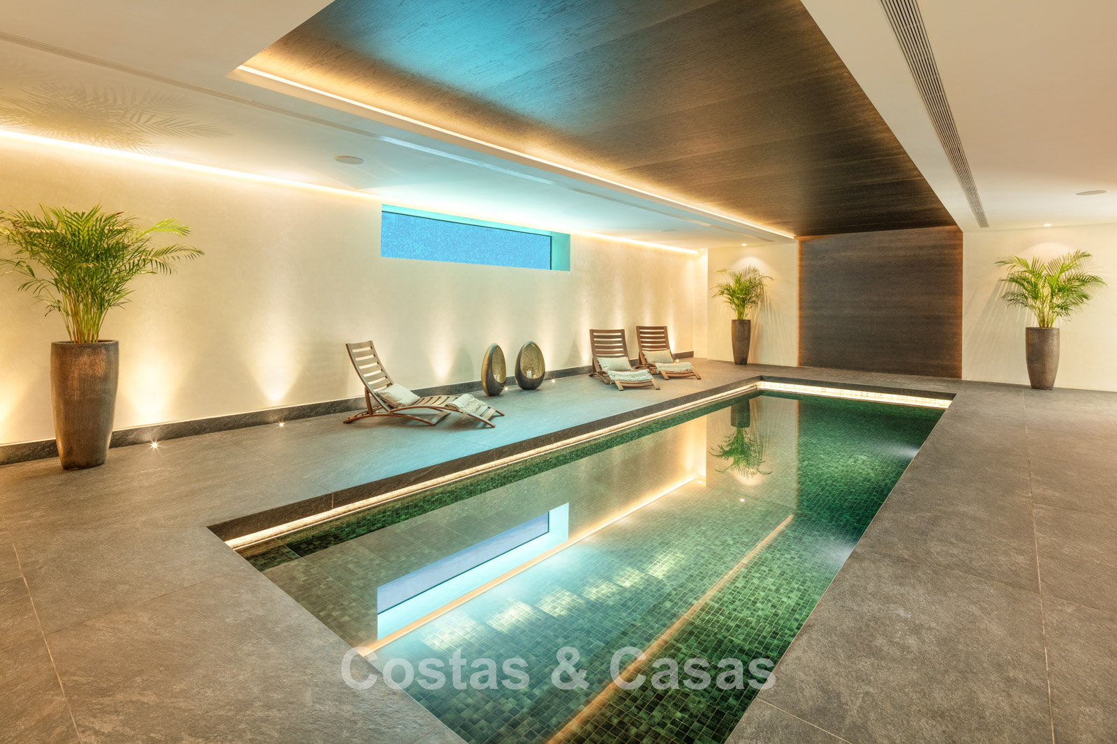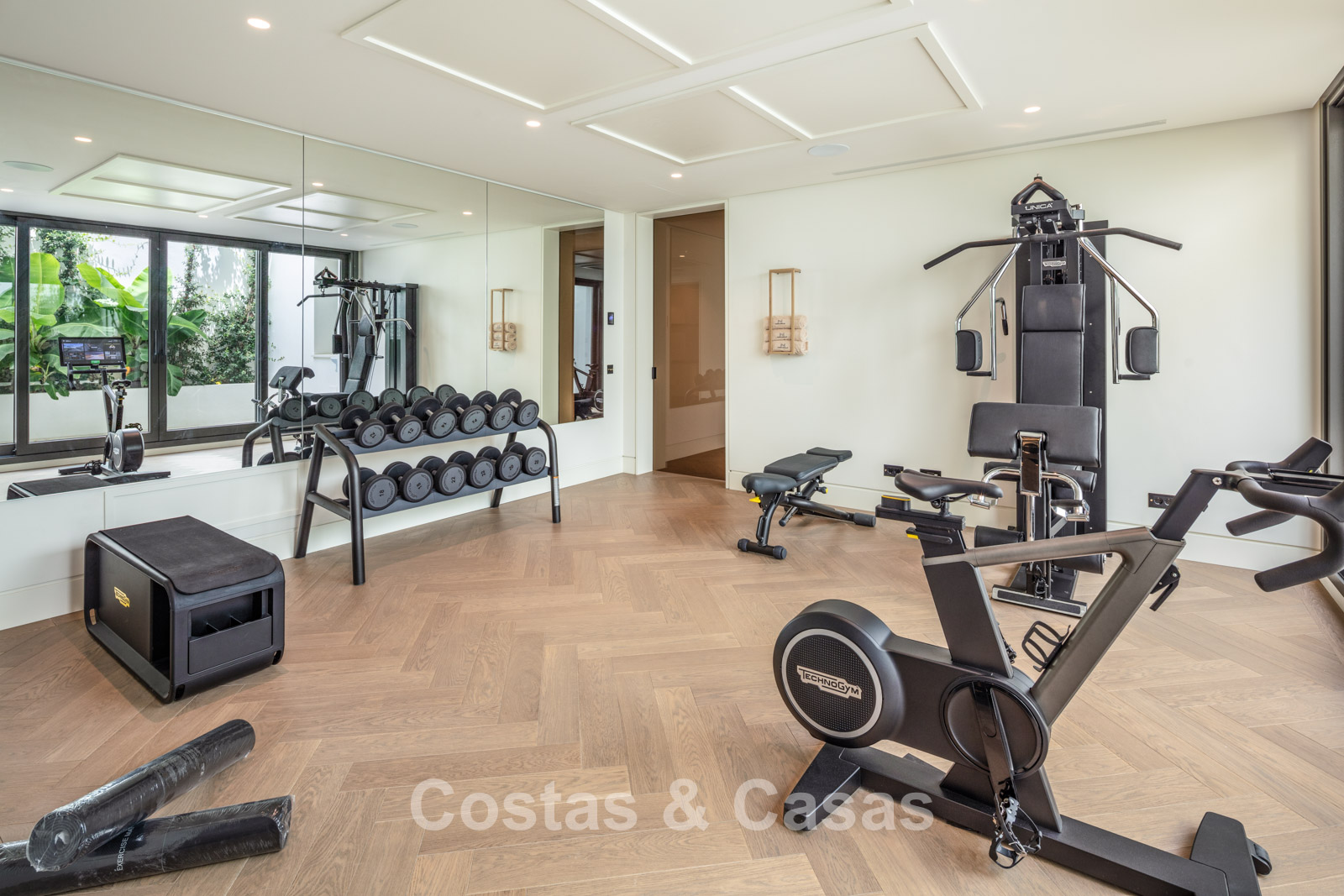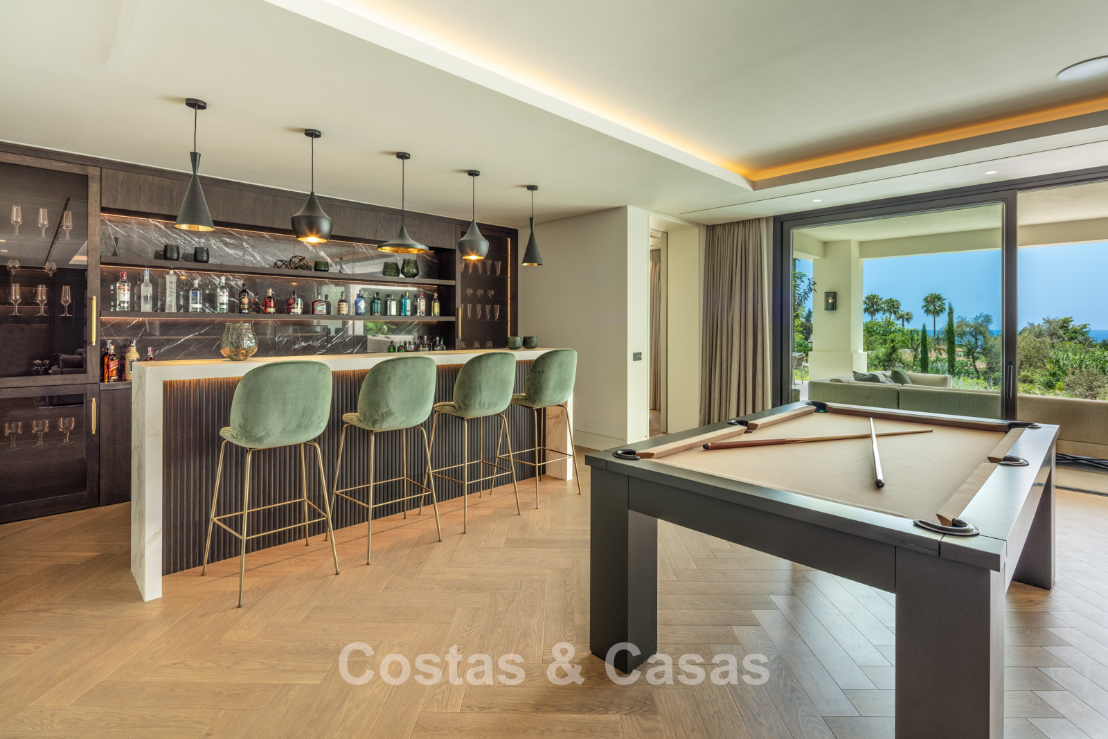 Rez-de-chaussée 0 Toilette invités. Espace récréatif de 92m² équipé d'un chill-out, table de poker et bar. Espace bien-être avec piscine intérieure chauffée intégrée de 9x3m, bain turc, sauna, douche, jacuzzi et salle de massage avec salon de coiffure. Bodega à vin en verre avec contrôle indépendant de la température. Salle de remise en forme équipée. 4 chambres en suite. Local technique, débarras. Buanderie avec 2 lave-linge Miele et 2 sèche-linge Miele. Garage intérieur pour 6 voitures maximum. Abri pour une voiture. Parking invités pour 4 voitures.