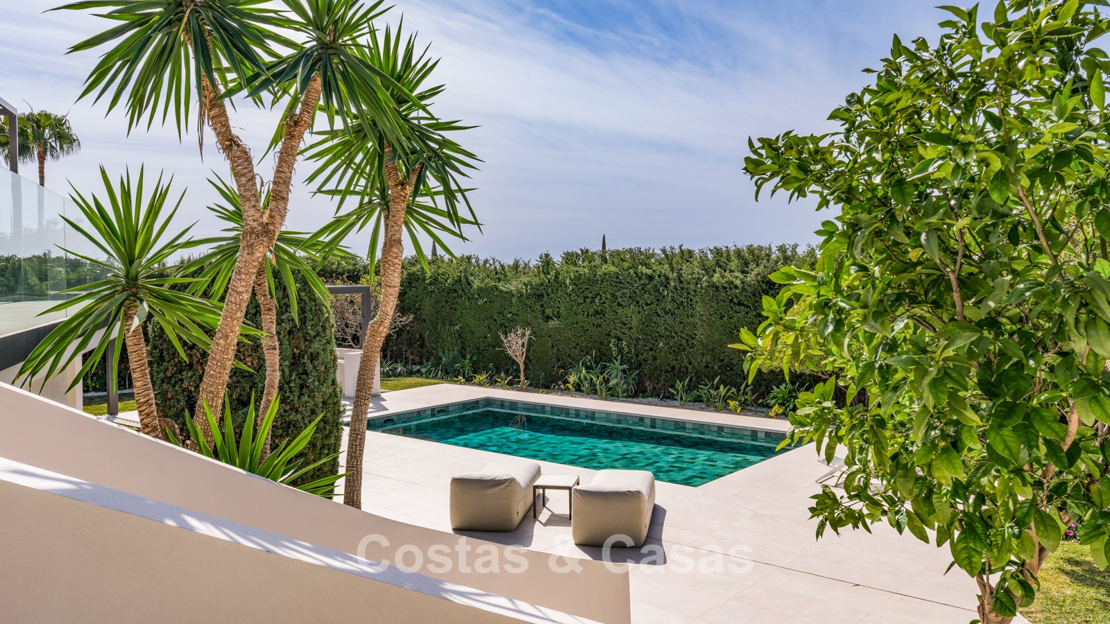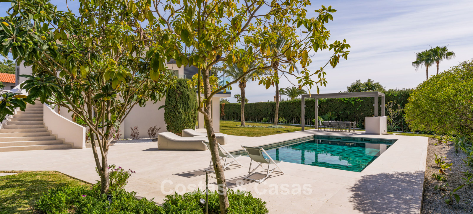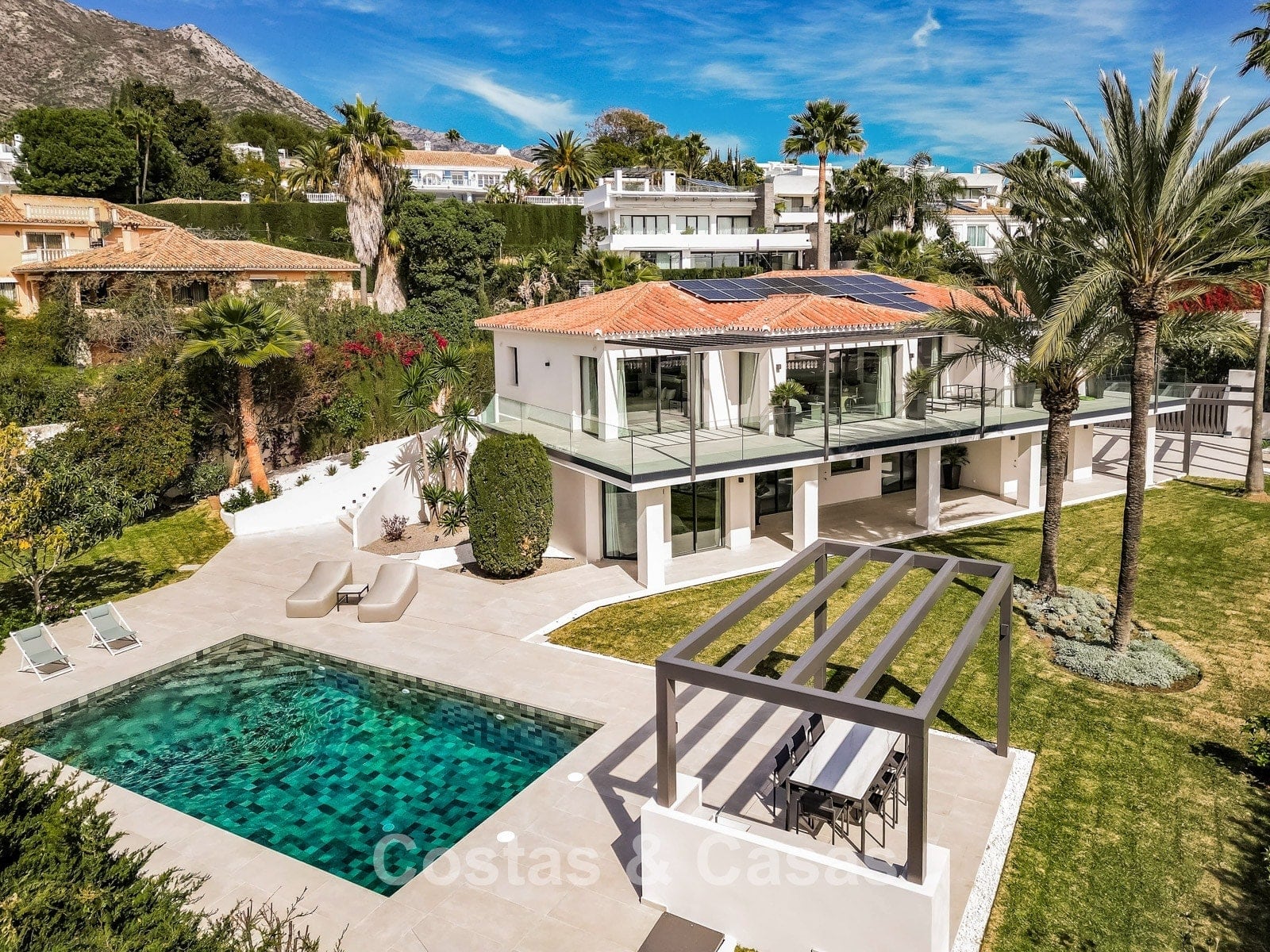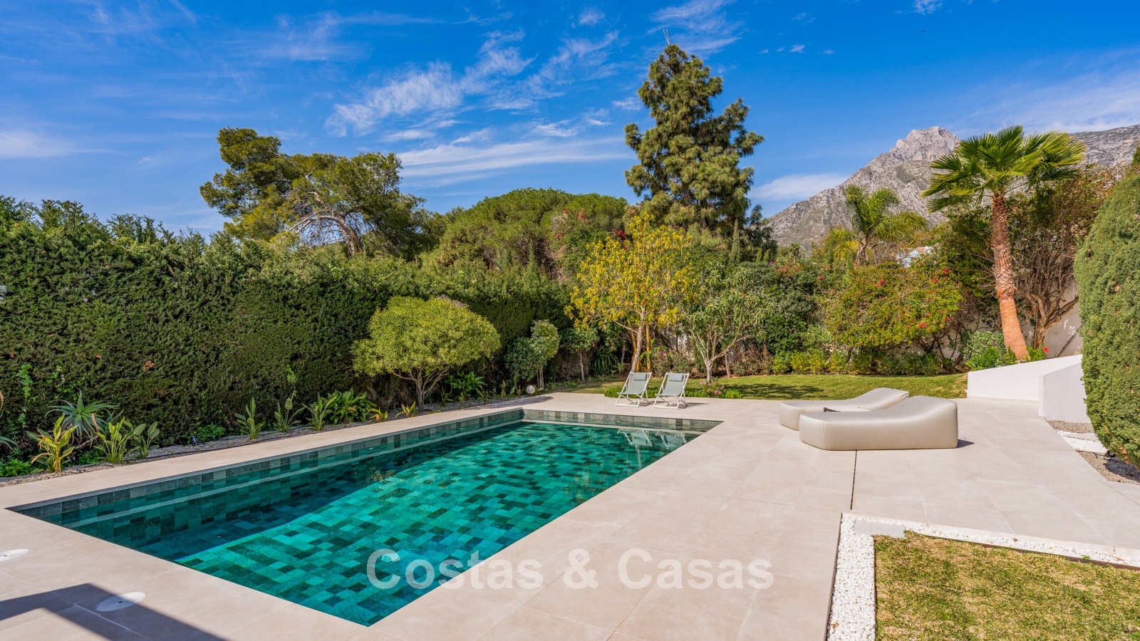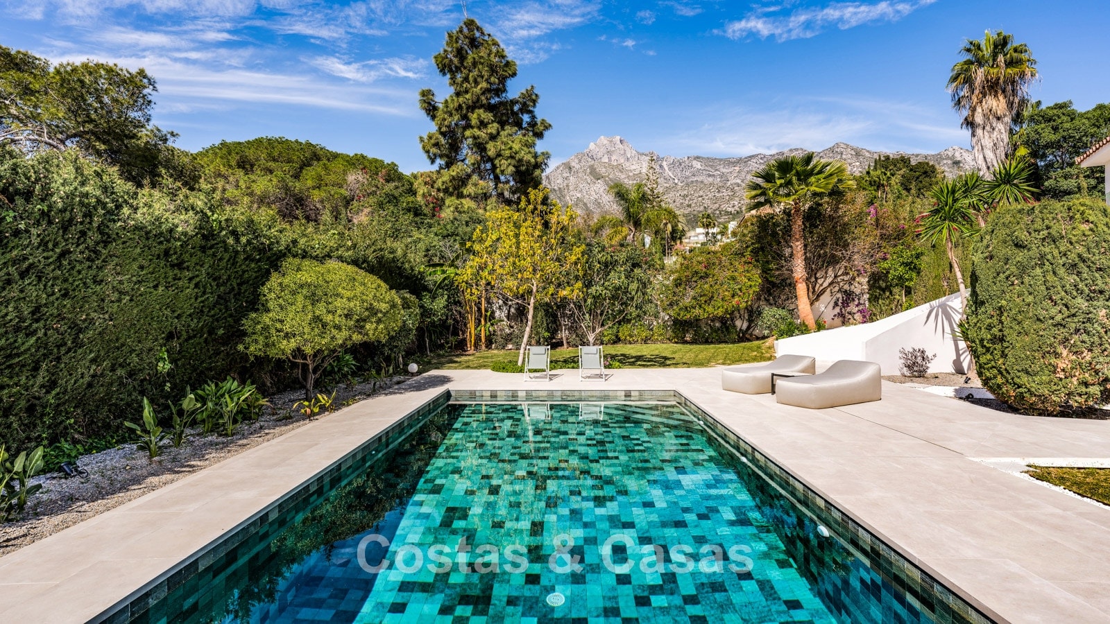Terrain spacieux. Le jardin luxuriant et verdoyant rayonne de tranquillité et d'exclusivité et offre une intimité totale pour profiter du plein air sans être dérangé. Piscine de près de 50m², entourée d'une terrasse ensoleillée. Une cuisine extérieure avec un coin repas en plein air offre le cadre idéal pour savourer de délicieux repas en plein air dans le confort et le style. Des terrasses couvertes et ensoleillées offrent un espace pour installer des équipements de détente. Orientation sud-ouest. Vue sur le paysage de montagne et la mer Méditerranée.