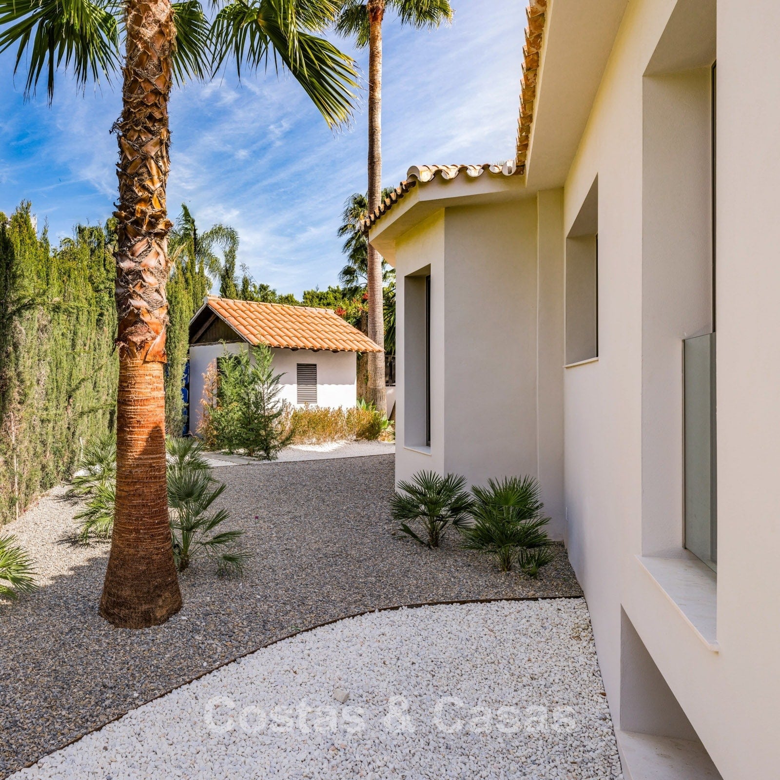 Villa individuelle de style architectural méditerranéen. Les murs blancs sont typiques de l'architecture méditerranéenne, tandis que les tuiles en terre cuite donnent une touche espagnole traditionnelle. Utilisation de matériaux de qualité et d'une finition de haute qualité. Les grandes fenêtres et les balustrades en verre maximisent la lumière naturelle et créent une transition harmonieuse entre l'intérieur et l'extérieur. Intérieur très lumineux. L'étage principal est situé sur un niveau surélevé, permettant au salon de bénéficier de plus de lumière et de vues, tandis que les chambres sont idéalement situées au rez-de-chaussée. Espace de vie ouvert avec un coin salon et salle à manger. Cuisine ouverte avec électroménagers Siemens de qualité et un îlot de cuisson où vous pourrez prendre votre petit-déjeuner. Coin repas intégré. 5 chambres, 5 salles de bains et une toilette séparée pour les invités. Un espace multifonctionnel peut être aménagé librement. Sols de qualité de couleur crème. Buanderie équipée. Débarras. Parking pour 3 voitures.