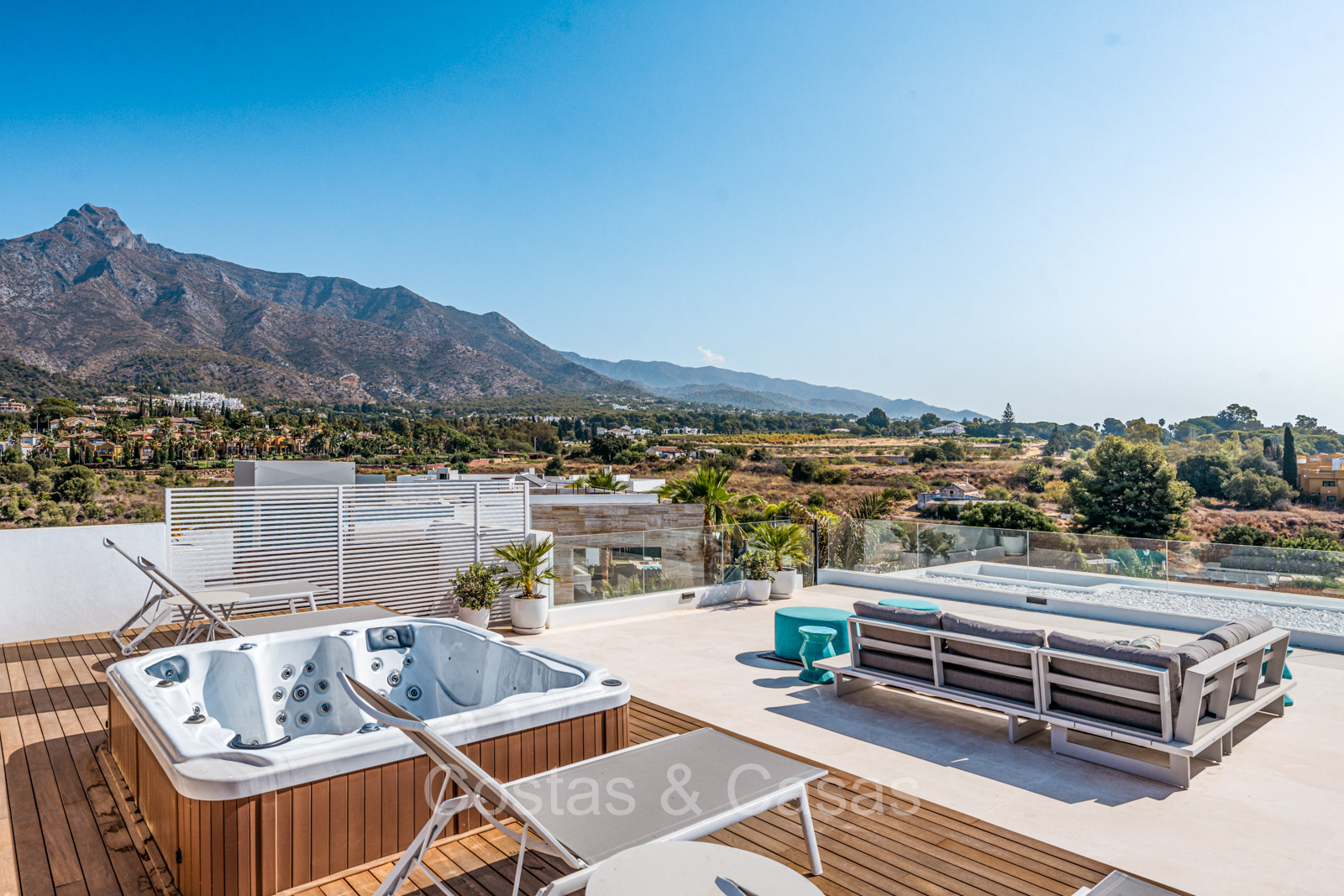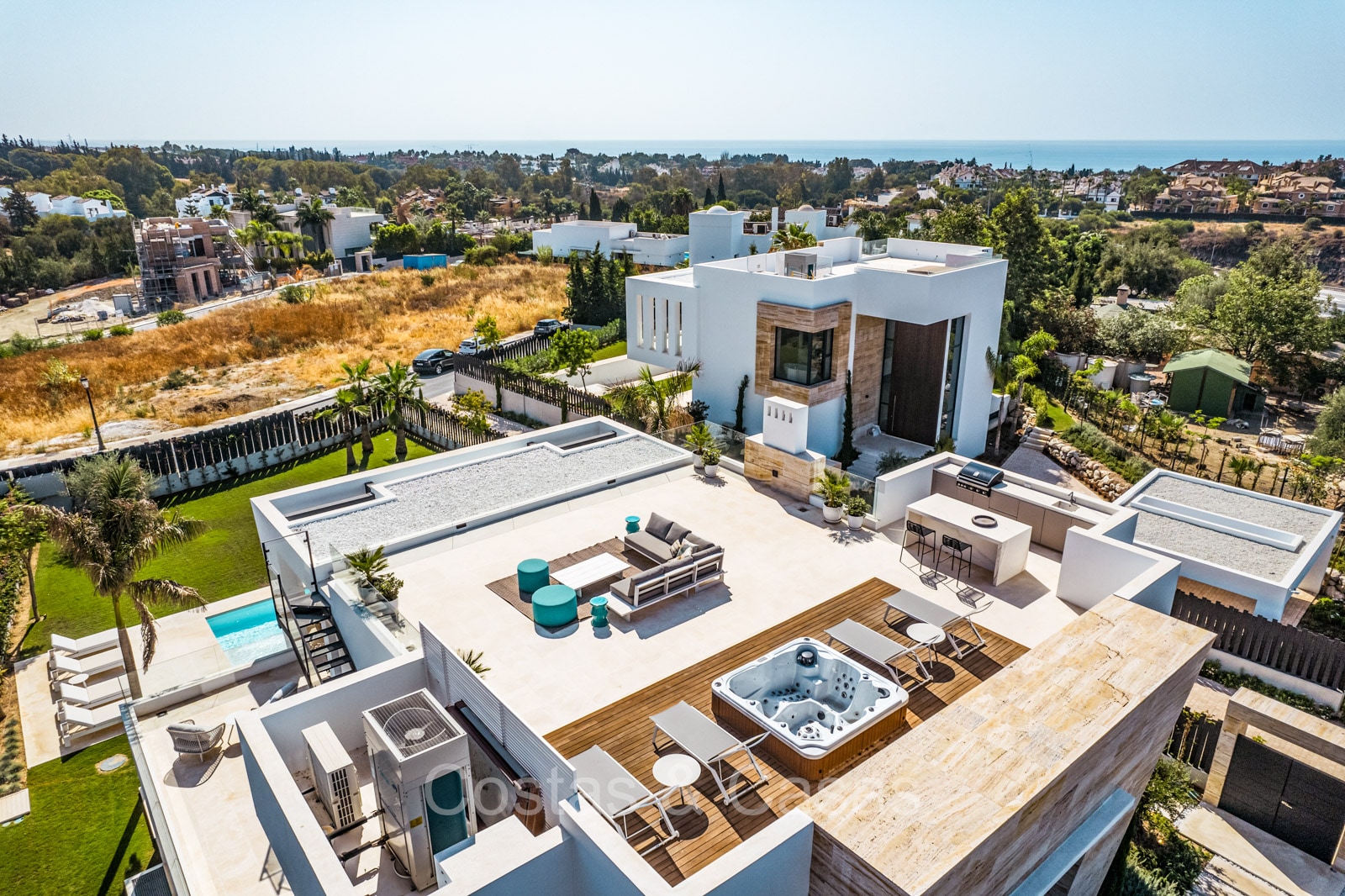 Située sur un terrain plat entièrement clôturé. Jardin paysager bien entretenu avec beaucoup de pelouse et de plantations tropicales. Piscine privée. Des terrasses ouvertes et ombragées offrent la possibilité de profiter de l'agréable climat méditerranéen. Spacieux solarium équipé d'une cuisine extérieure avec bar, jacuzzi et salon. Vues sur les environs avec la montagne de La Concha et la mer Méditerranée en arrière-plan depuis le solarium.