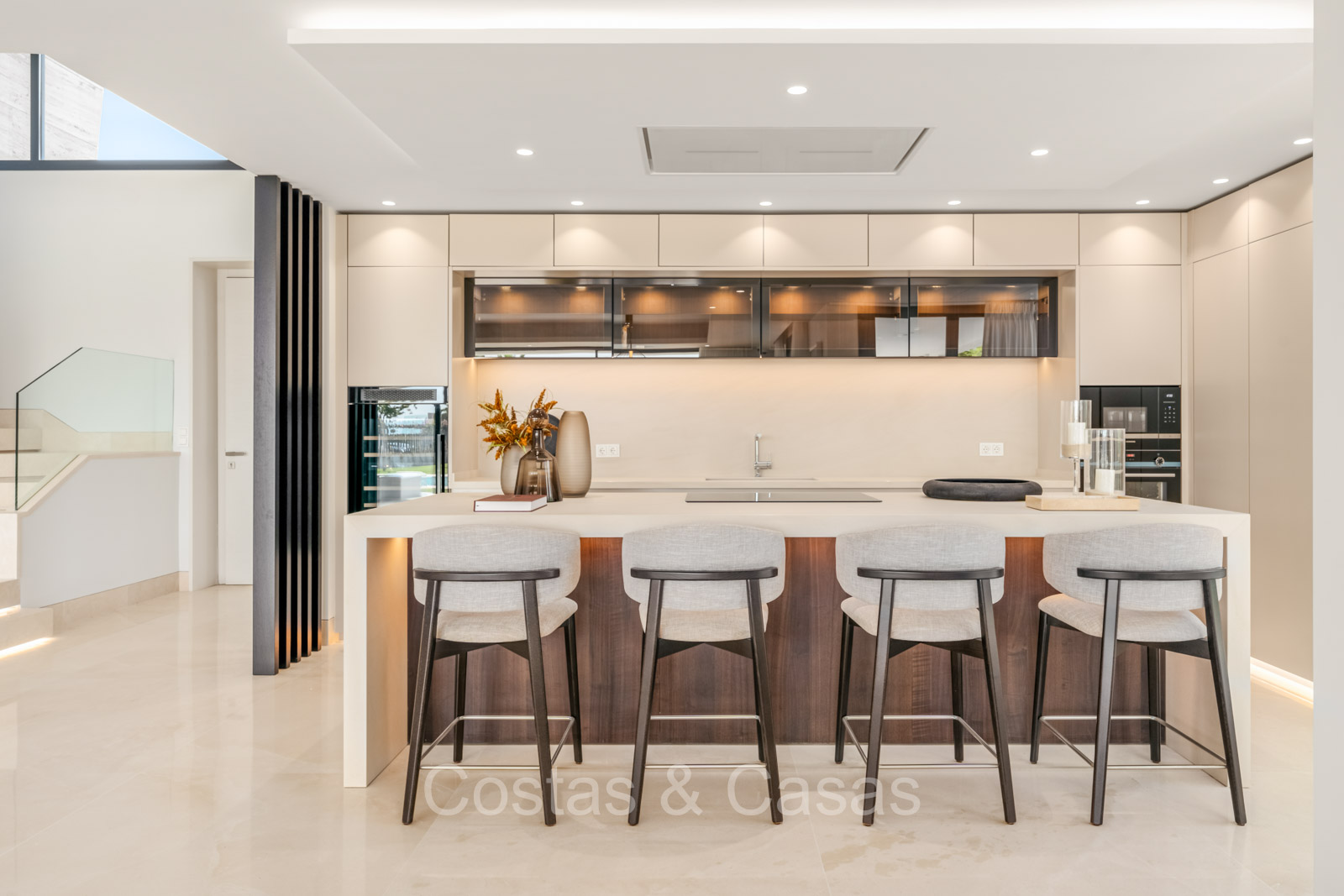 Villa de luxe élégante et blanche à l'architecture contemporaine. Conçue en 2024 avec un luxe inégalé et un design moderne. Une allée mène à une allée spacieuse avec un parking privé à l'arrière de la villa. Le hall d'entrée comprend la cage d'escalier, le vestiaire et une toilette invités. Séjour ouvert avec espace salon et salle à manger. Les hautes fenêtres coulissantes du sol au plafond laissent entrer beaucoup de lumière naturelle. Cuisine/salle à manger pratique, entièrement équipée d'appareils Siemens et d'un îlot de sièges. 5 chambres, 5 salles de bains. La suite parentale au premier étage dispose d'une luxueuse salle de bains et d'un dressing. A l’étage inférieur se trouve une salle multifonctionnelle pouvant être utilisée comme salle de sport, home cinéma ou salle de jeux. Buanderie. Local technique. Garage intérieur pour 3 voitures.