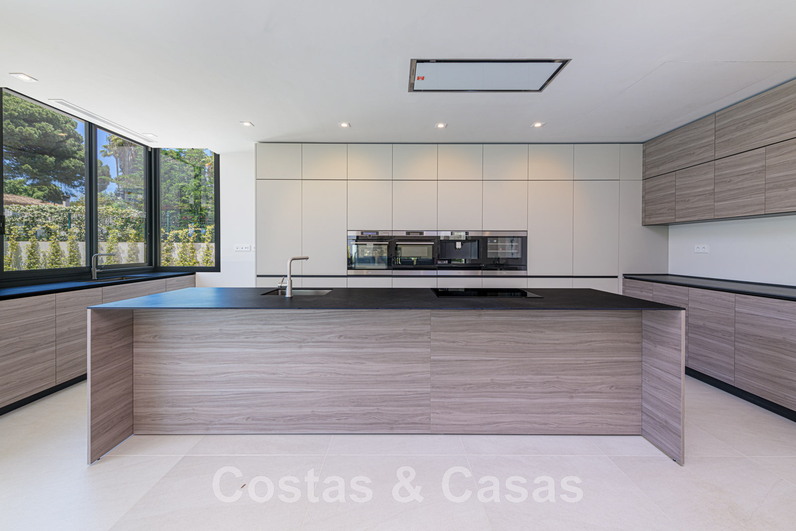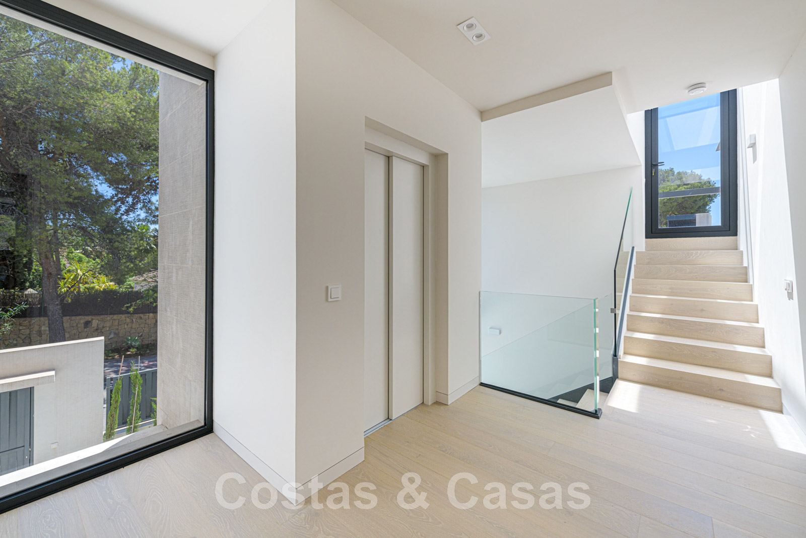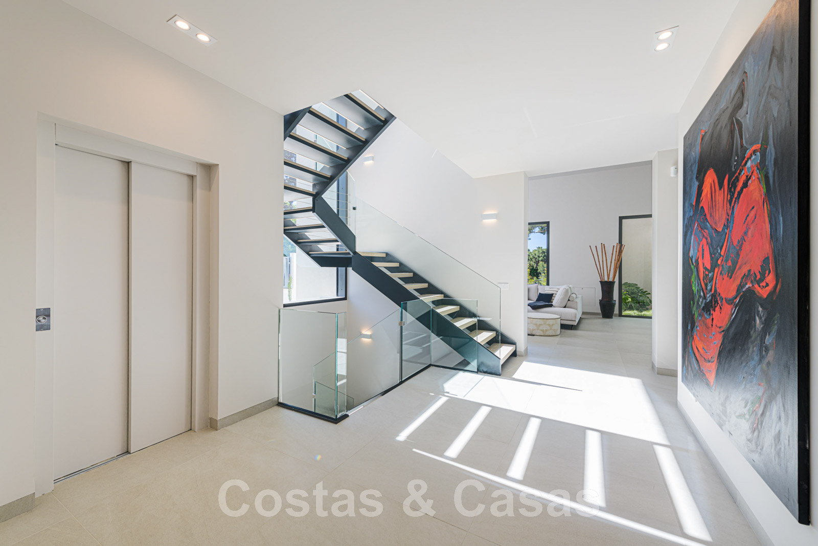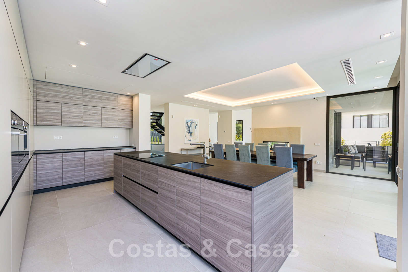 Villa indépendante au style contemporain. Conçue avec des matériaux de haute qualité et une finition raffinée. Un intérieur élégant. Un portail électrique donne accès à un parking pour plusieurs voitures. Allée descendante vers le garage intérieur. Entrée avec ascenseur et escaliers. Toilette pour invités. Cuisine design ouverte avec un grand îlot de cuisson et une salle à manger intégrée. Une cloison avec une cheminée transparente sépare le salon moderne de la salle à manger et de la cuisine. La salle de séjour se compose d'un salon TV et d'un second salon confortable près de la cheminée. Des fenêtres coulissantes dans toute la villa permettent de profiter de la lumière naturelle et d'assurer une transition harmonieuse entre l'intérieur et l'extérieur. Carrelage en porcelaine 80 x 80 cm dans toute la villa, à l'exception du garage et de certaines chambres. Sols en bois dans ces chambres. 5 chambres et 6 salles de bain. La suite principale, avec sa salle de bains, est dotée d'une cheminée moderne et de fenêtres coulissantes du sol au plafond qui donnent sur une terrasse privée. Étage inférieur: Ascenseur et escaliers. Cave à vin. Home cinéma. Chambre à coucher avec salle de bain. Gymnase équipé d'une salle de bain. Buanderie, local technique et local de stockage. Garage pour 2 voitures. Solarium: Ascenseur et escaliers. Cuisine extérieure avec coin barbecue. Pergola avec un espace suffisant pour une table à manger. Jacuzzi. Vaste terrasse.