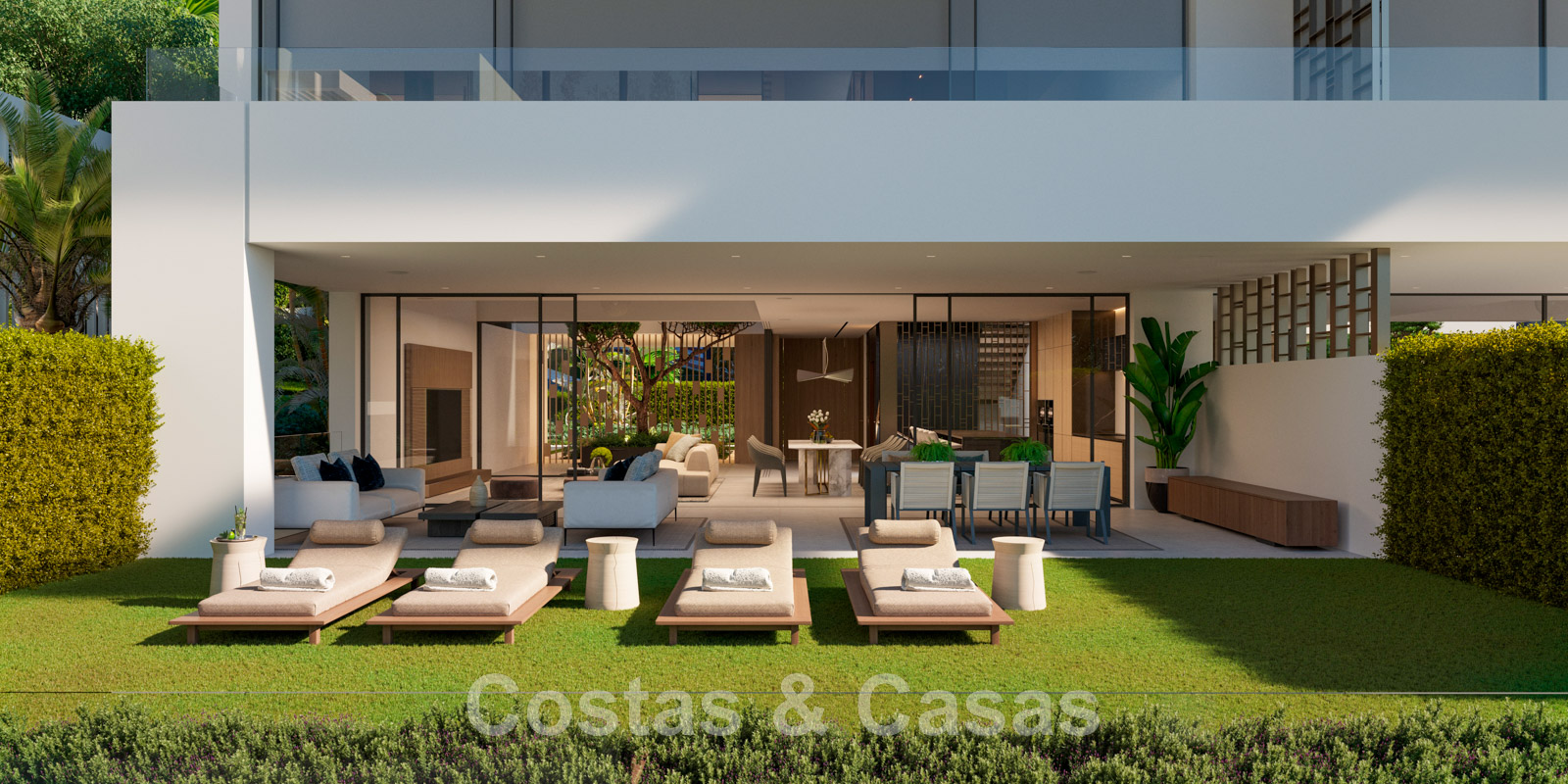 Jardin privé entretenu avec accès direct au jardin paysager commun et à la piscine à débordement. Terrasse principale spacieuse et couverte, pouvant être aménagée avec une table à manger et un lounge. Le solarium offre une vue magnifique sur les environs et la mer Méditerranée.