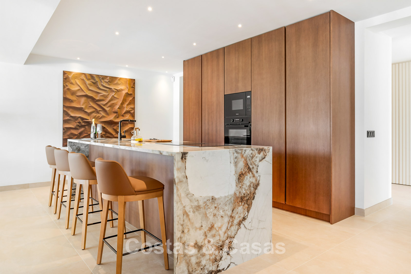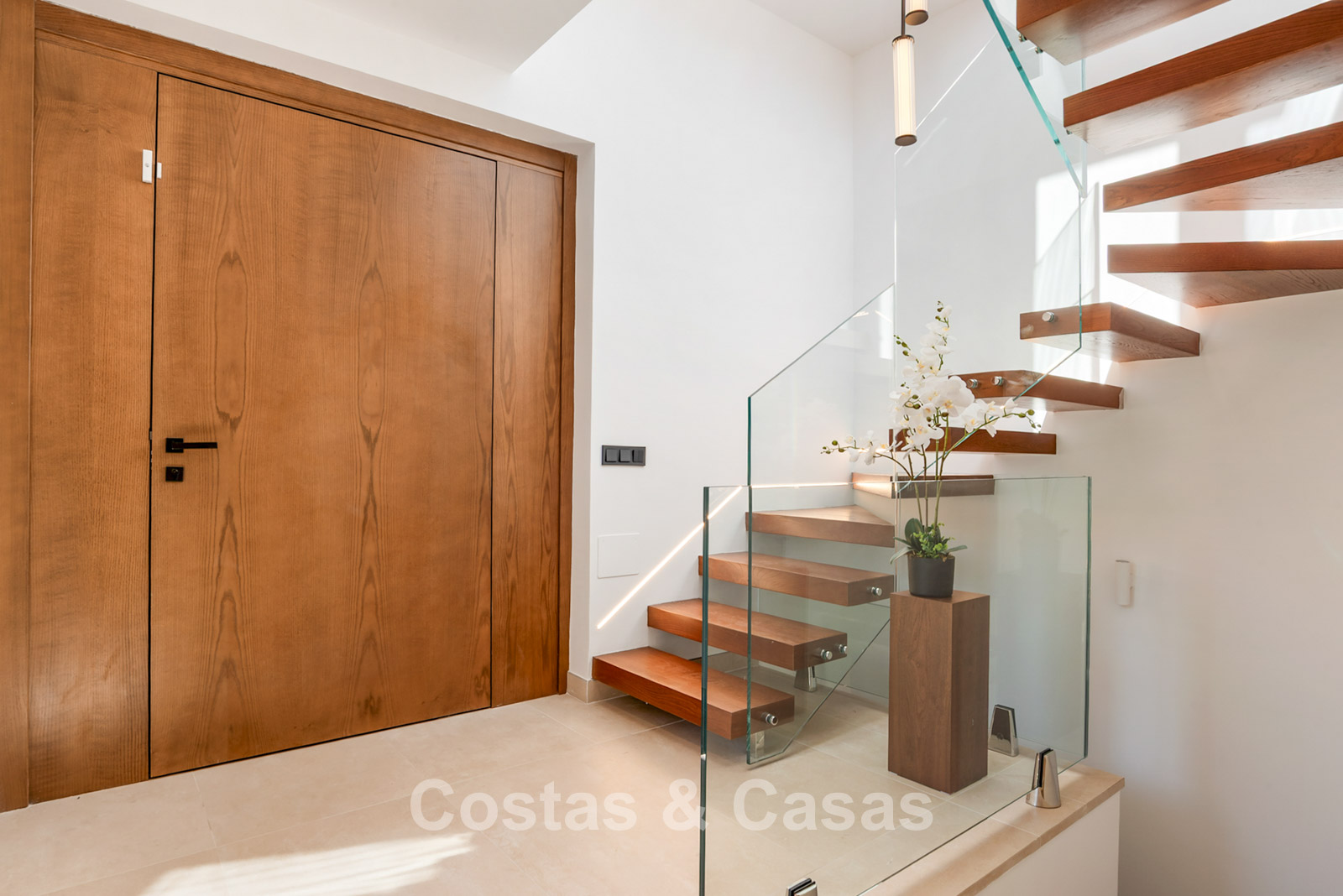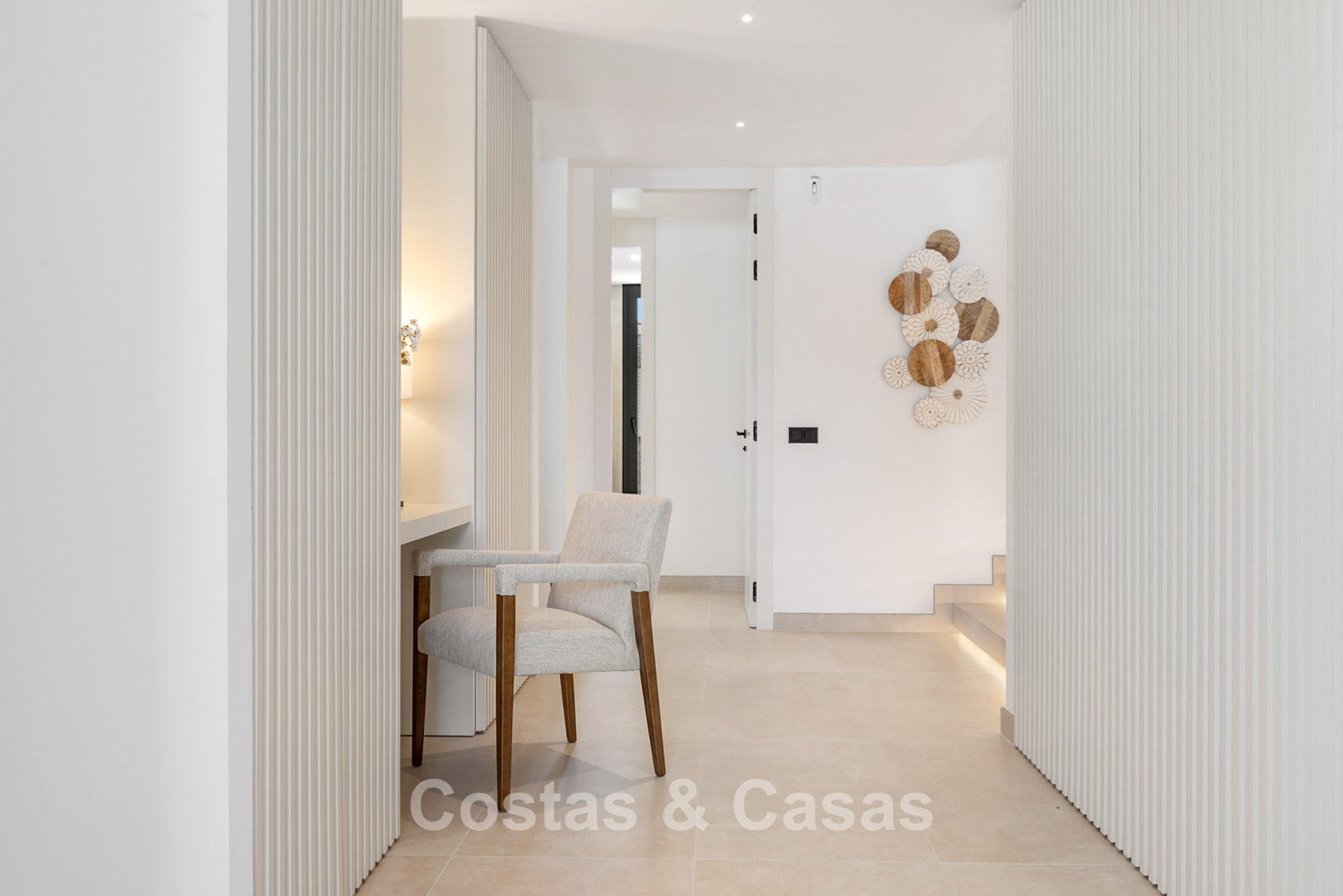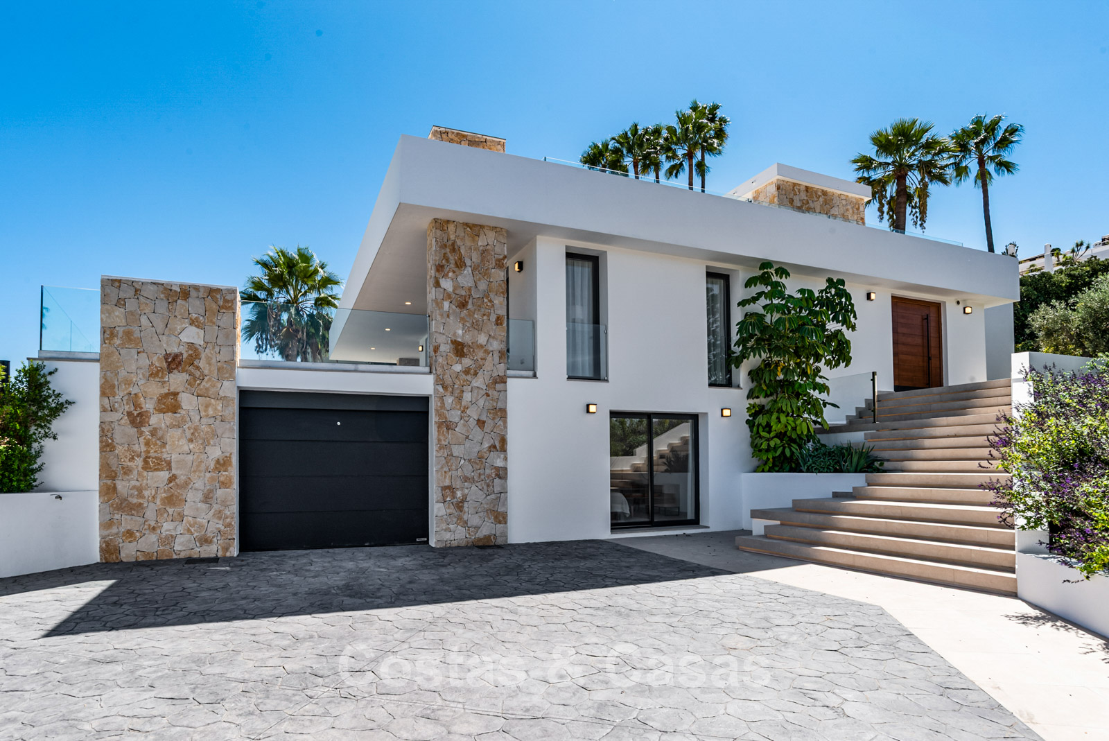 La villa se distingue par son design moderne aux lignes épurées et l'utilisation de détails en pierre naturelle, qui créent une atmosphère chaleureuse et contemporaine. Récemment rénovée avec un savoir-faire exceptionnel et des matériaux de haute qualité. Hall d'entrée avec escalier flottant. De hautes fenêtres coulissantes aux profils encastrés, réparties dans toute la villa, créent une transition harmonieuse entre l'intérieur et l'extérieur, laissant entrer une abondante lumière naturelle. L'intérieur élégant et tendance dégage un design chic et luxueux. Un séjour ouvert et lumineux allie un élégant salon TV à un coin lecture convivial. Une salle à manger intégrée dispose d'une grande table pour 8 personnes. Une cuisine design minimaliste est équipée d'électroménagers Miele de haute qualité et d'un îlot central pour s'asseoir. La villa comprend 4 chambres, 4 salles de bains et une toilette invitée. Buanderie. Sols carrelés en porcelaine. Garage intégré pour 2 voitures. Parking supplémentaire sur la propriété pour 2 voitures.