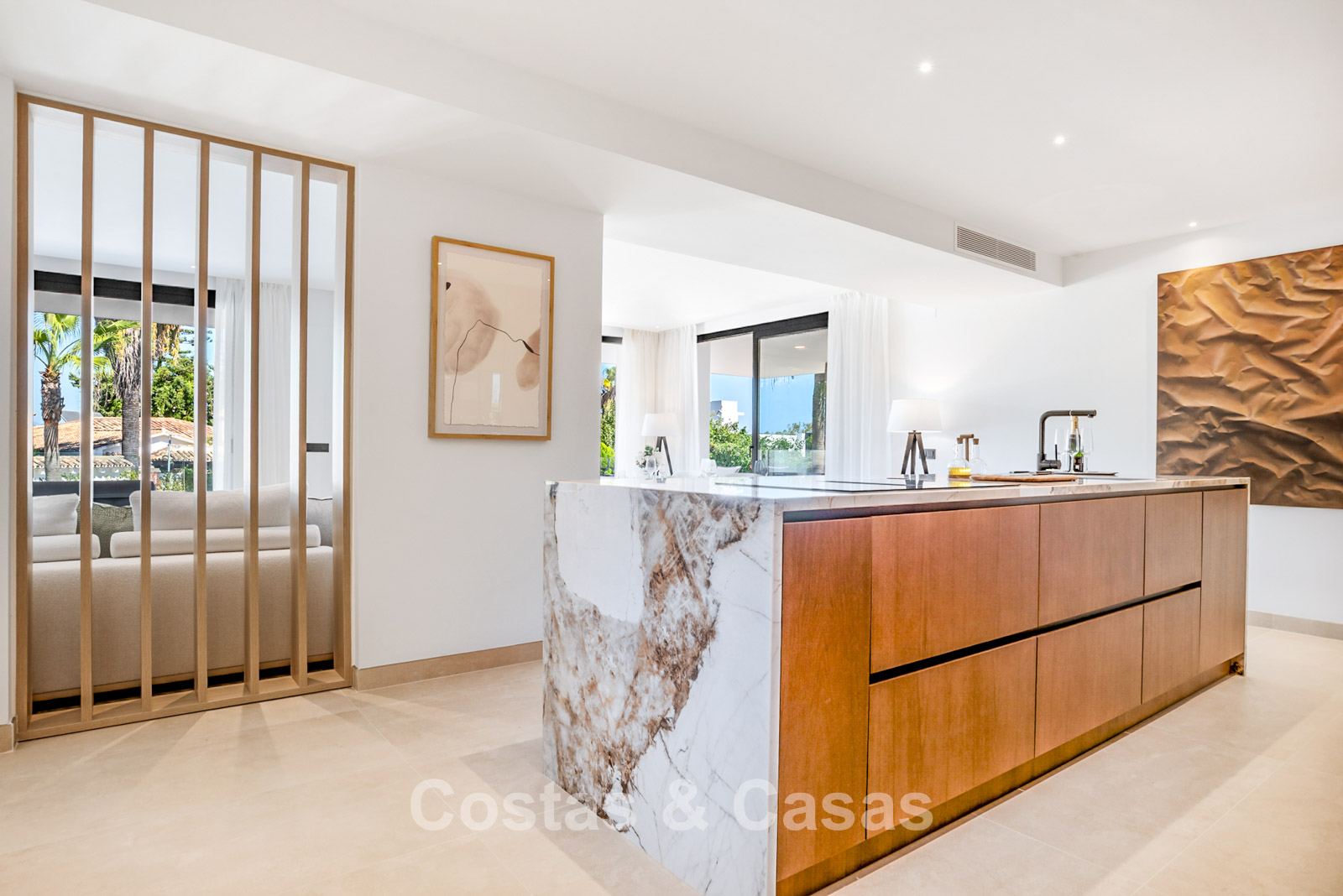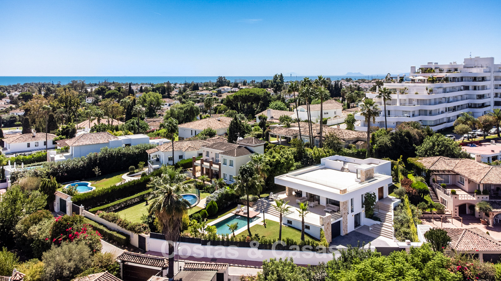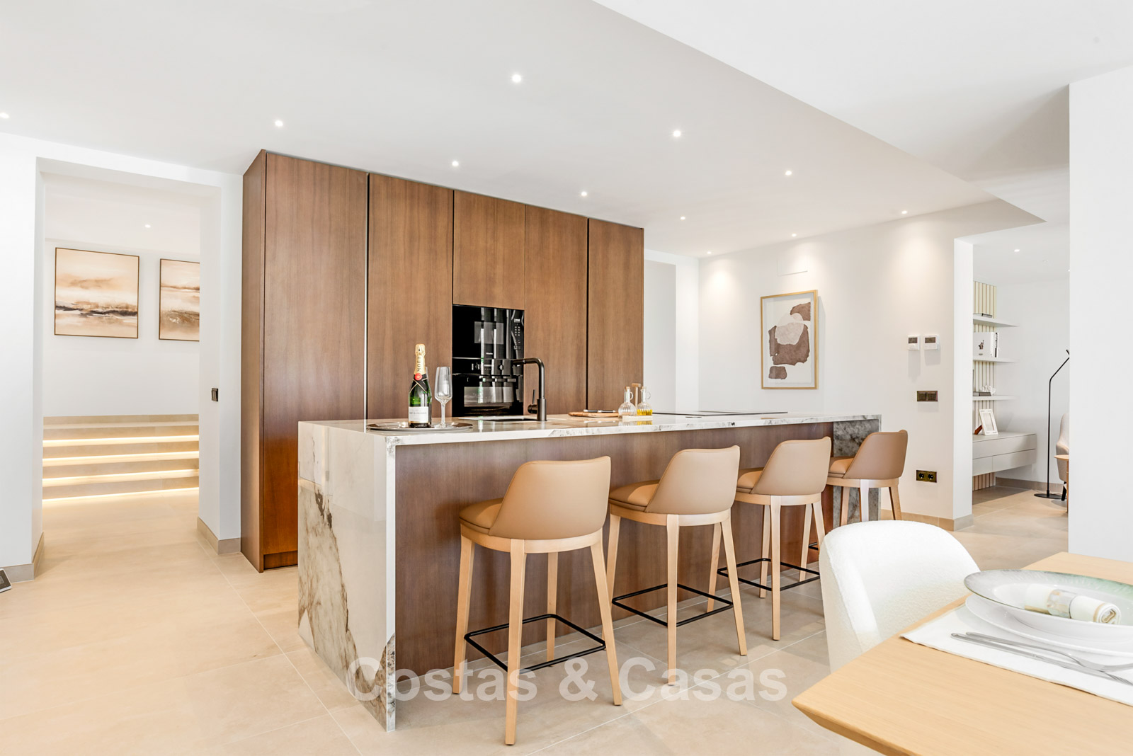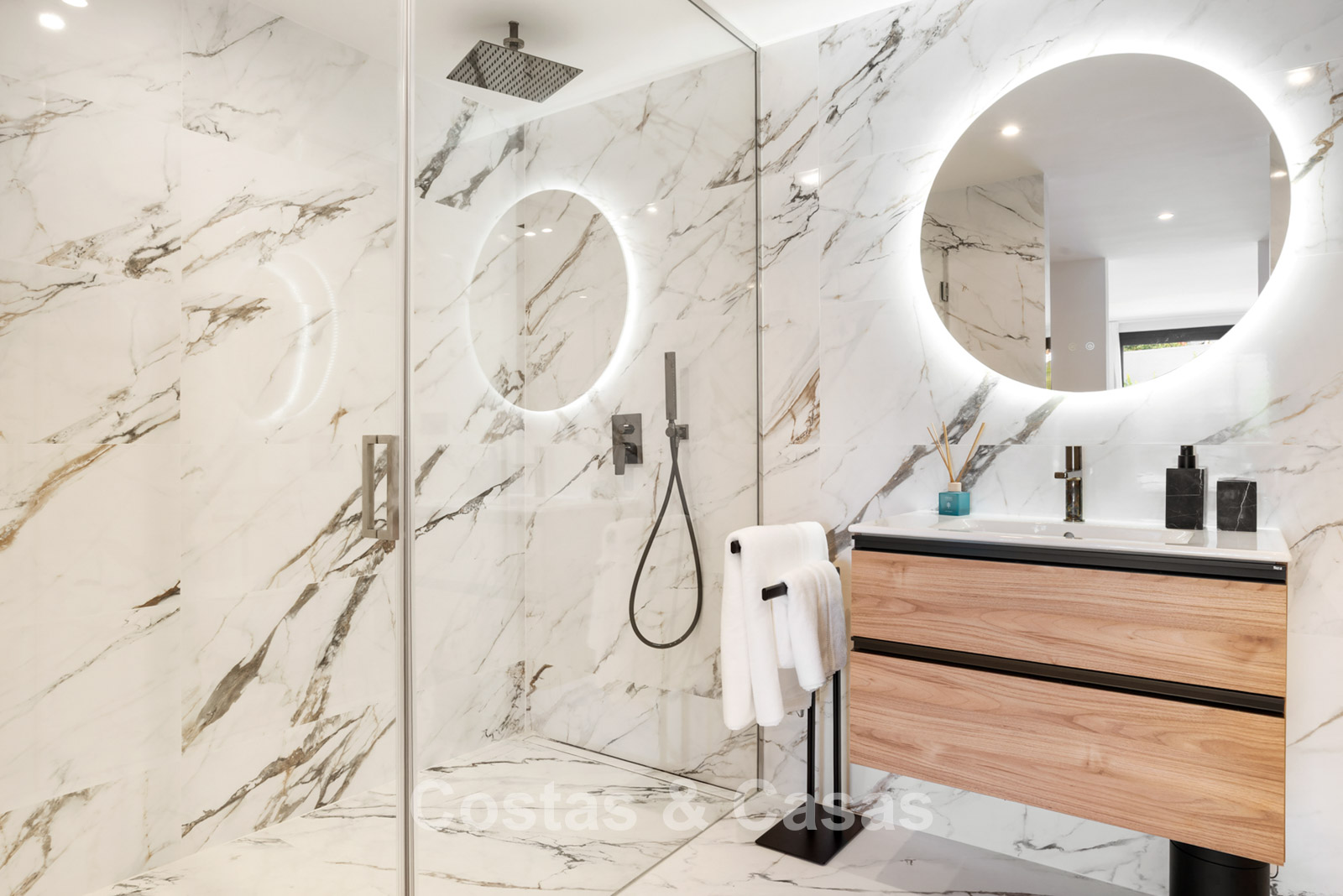 La villa se distingue par son design moderne aux lignes épurées et l'utilisation de détails en pierre naturelle, qui créent une atmosphère chaleureuse et contemporaine. Récemment rénovée avec un savoir-faire exceptionnel et des matériaux de haute qualité. Hall d'entrée avec escalier flottant. De hautes fenêtres coulissantes aux profils encastrés, réparties dans toute la villa, créent une transition harmonieuse entre l'intérieur et l'extérieur, laissant entrer une abondante lumière naturelle. L'intérieur élégant et tendance dégage un design chic et luxueux. Un séjour ouvert et lumineux allie un élégant salon TV à un coin lecture convivial. Une salle à manger intégrée dispose d'une grande table pour 8 personnes. Une cuisine design minimaliste est équipée d'électroménagers Miele de haute qualité et d'un îlot central pour s'asseoir. La villa comprend 4 chambres, 4 salles de bains et une toilette invitée. Buanderie. Sols carrelés en porcelaine. Garage intégré pour 2 voitures. Parking supplémentaire sur la propriété pour 2 voitures.