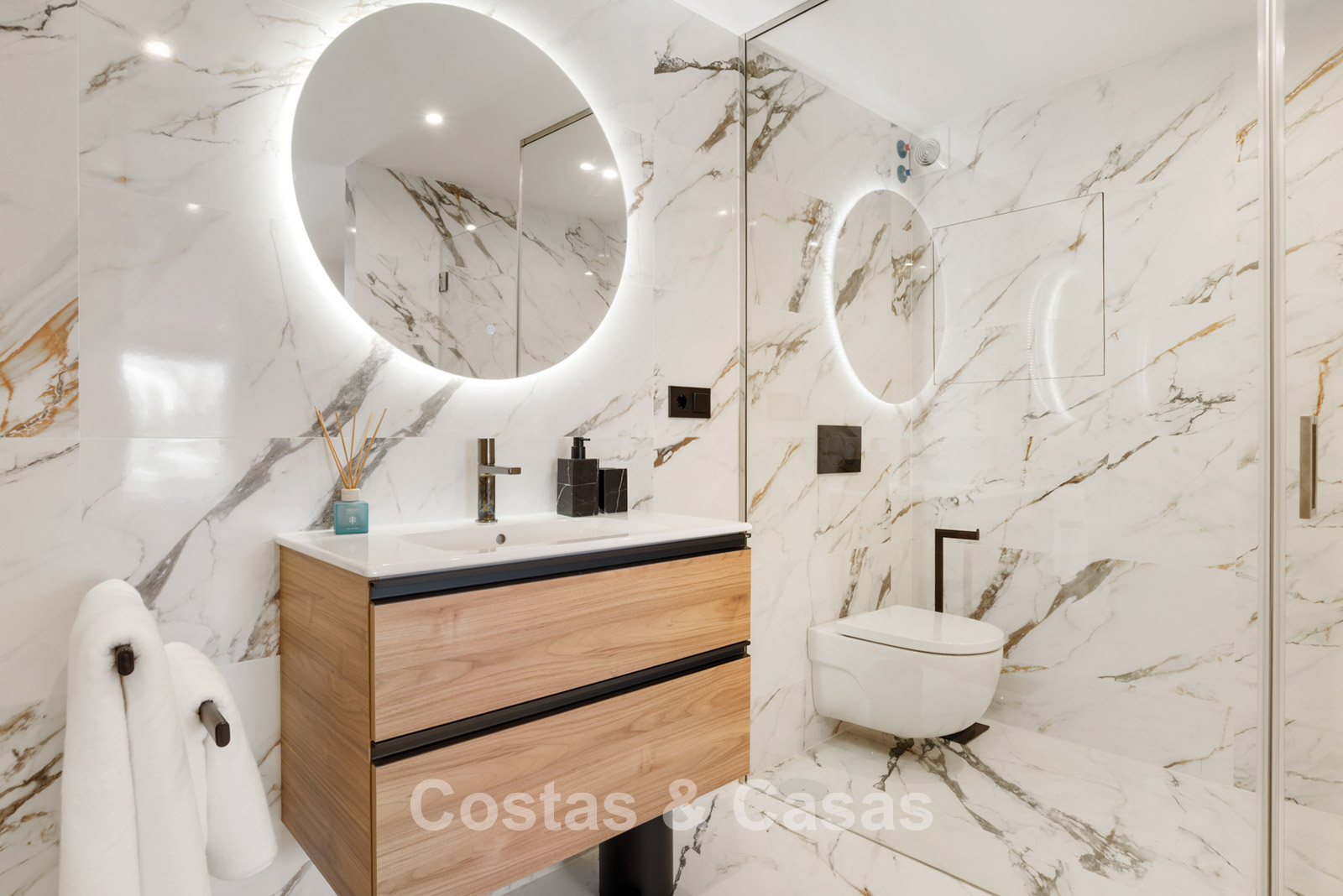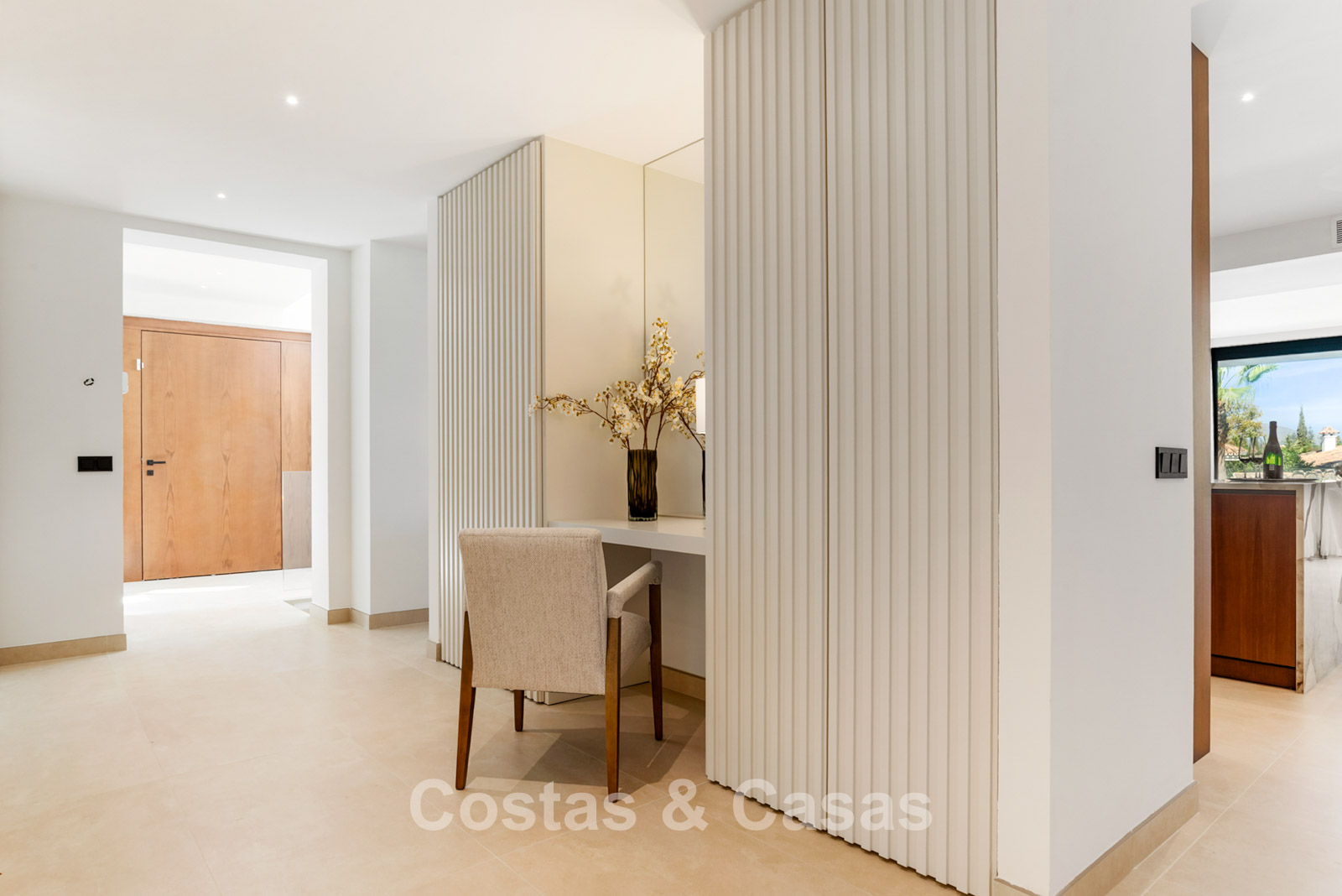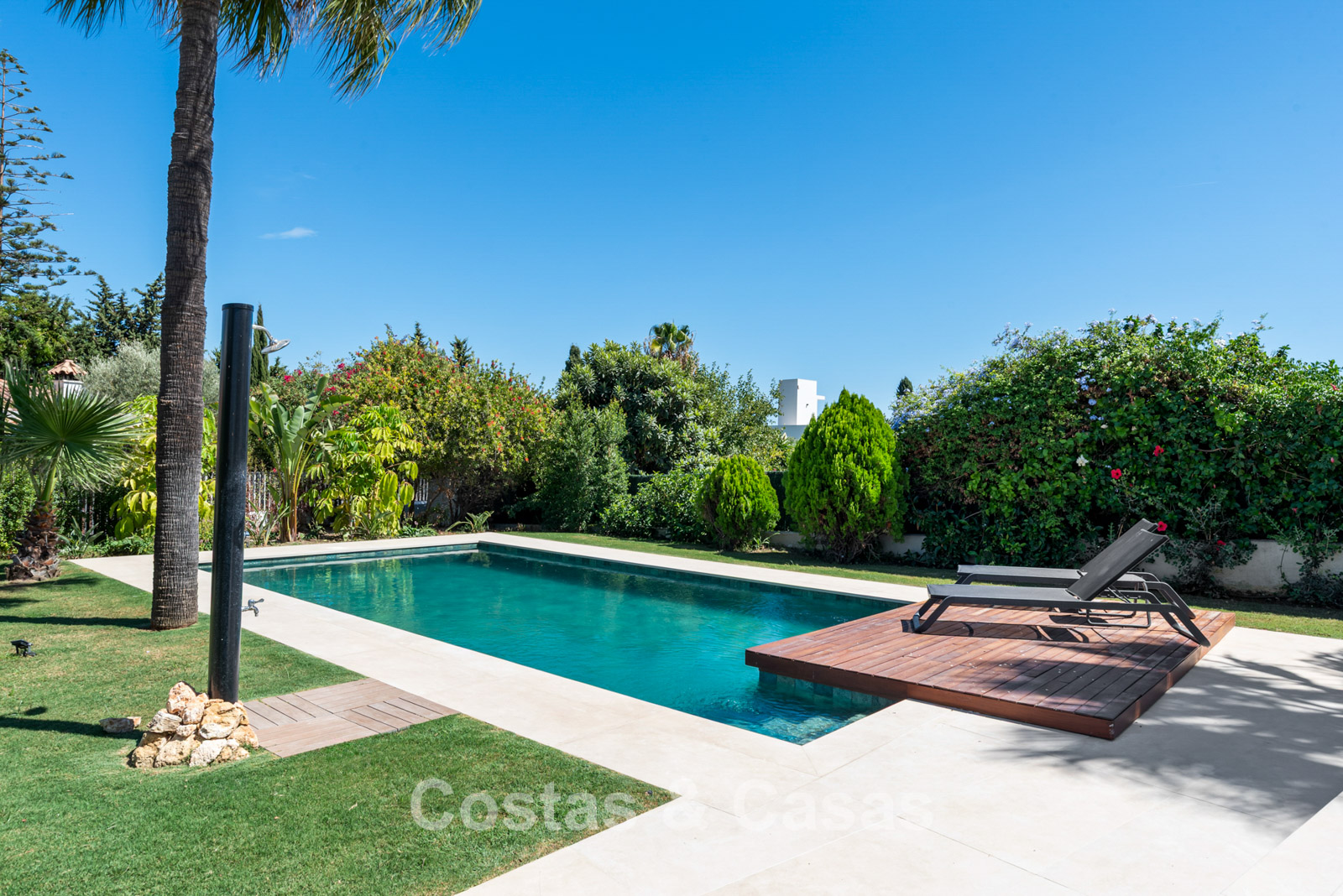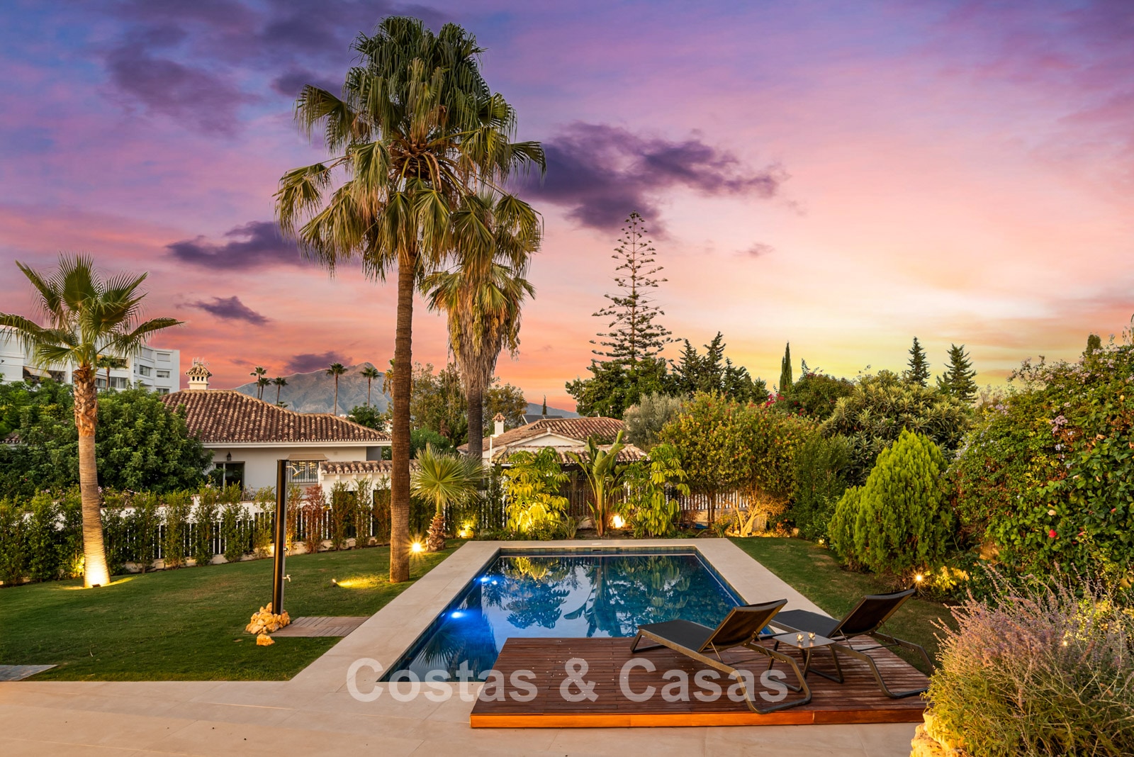 La villa se distingue par son design moderne aux lignes épurées et l'utilisation de détails en pierre naturelle, qui créent une atmosphère chaleureuse et contemporaine. Récemment rénovée avec un savoir-faire exceptionnel et des matériaux de haute qualité. Hall d'entrée avec escalier flottant. De hautes fenêtres coulissantes aux profils encastrés, réparties dans toute la villa, créent une transition harmonieuse entre l'intérieur et l'extérieur, laissant entrer une abondante lumière naturelle. L'intérieur élégant et tendance dégage un design chic et luxueux. Un séjour ouvert et lumineux allie un élégant salon TV à un coin lecture convivial. Une salle à manger intégrée dispose d'une grande table pour 8 personnes. Une cuisine design minimaliste est équipée d'électroménagers Miele de haute qualité et d'un îlot central pour s'asseoir. La villa comprend 4 chambres, 4 salles de bains et une toilette invitée. Buanderie. Sols carrelés en porcelaine. Garage intégré pour 2 voitures. Parking supplémentaire sur la propriété pour 2 voitures.