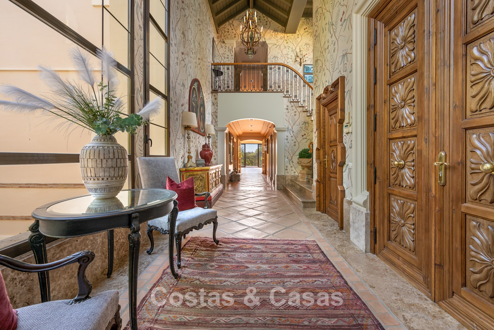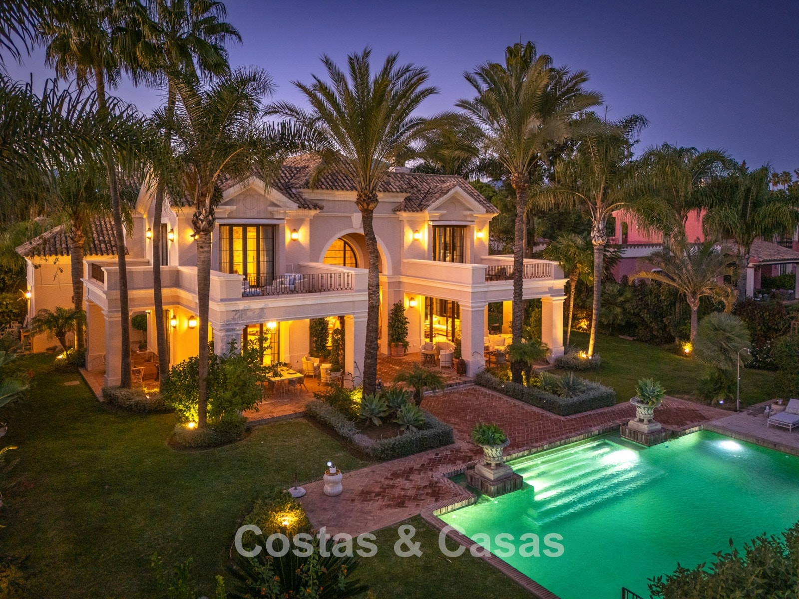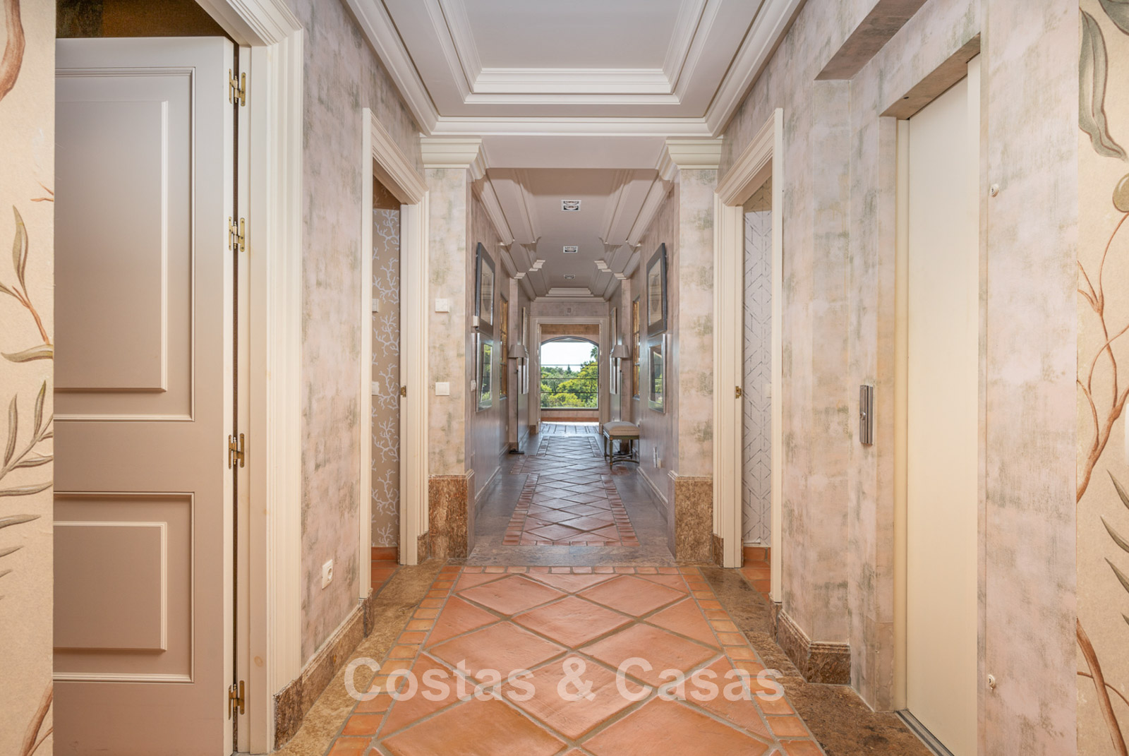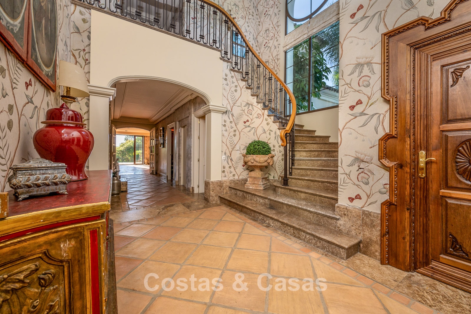 Magnifique maison au design classique d'inspiration américaine. Utiliser des matériaux luxueux. Le hall d'entrée avec plafond voûté à double hauteur est un mélange d'éléments classiques et rustiques et offre un élégant escalier à l'étage. Les murs sont décorés d'un motif subtil et artistique qui ajoute une touche de caractère à n'importe quelle pièce. Plusieurs coins salons. Cuisine entièrement équipée avec coin repas. Une salle à manger séparée et formelle, idéale pour les occasions spéciales. 8 chambres spacieuses, chacune avec sa propre salle de bain. Une résidence pour le personnel ou les invités à l’étage inférieur. Des sols en terre cuite en pierre naturelle décorent l'intérieur de la plupart des pièces. Sols en marbre dans certaines chambres. Buanderie. Débarras. Local technique. Garage intérieur pour 4 voitures. Parking supplémentaire sur place pour 7 voitures.