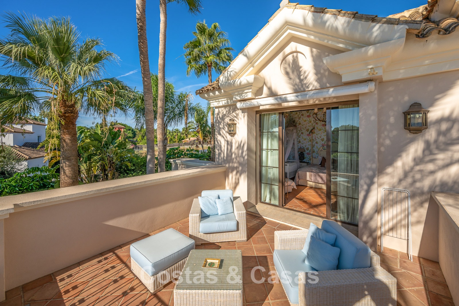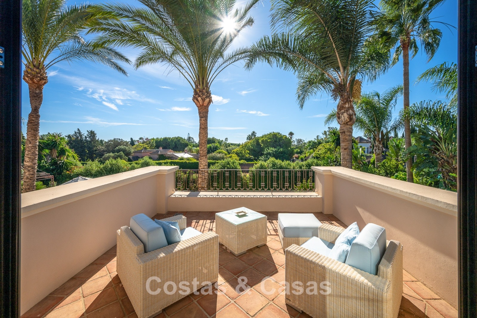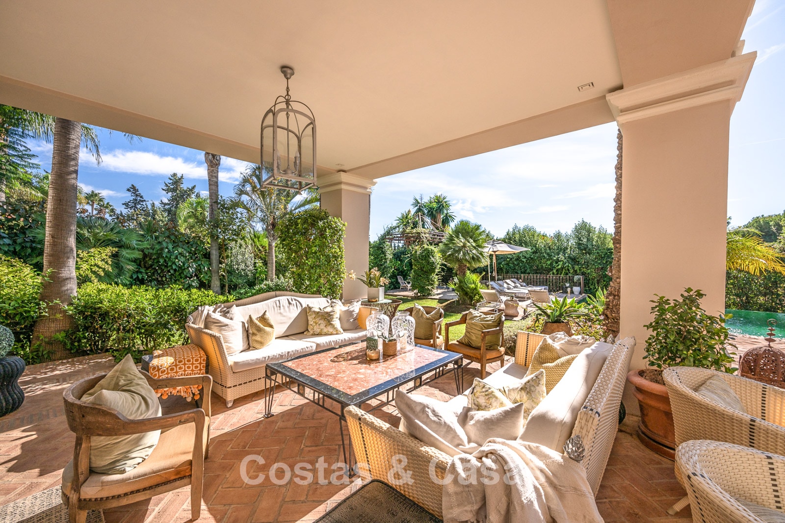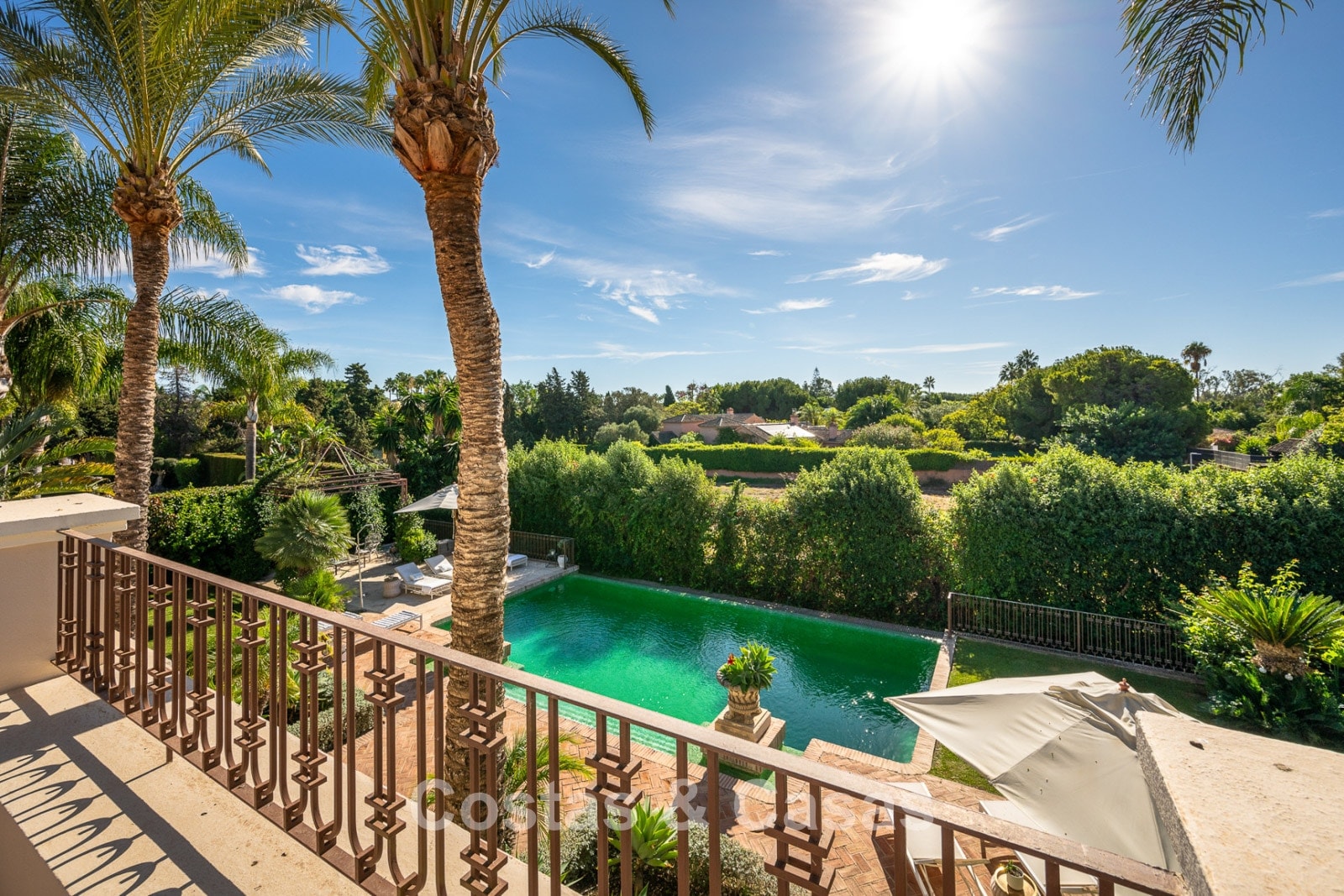 Terrain spacieux et clôturé. La villa spacieuse est entourée de palmiers et de jardins luxuriants, créant une atmosphère exotique et sereine. Piscine à eau salée avec pré-installation pour pompe à chaleur. Les terrasses généreuses offrent de l'espace pour installer des équipements de détente, tels que des salons confortables, des jacuzzis ou une cuisine extérieure, et créent également un cadre idéal pour profiter du plein air dans le luxe et l'intimité. Vue sur le jardin et les environs verdoyants.