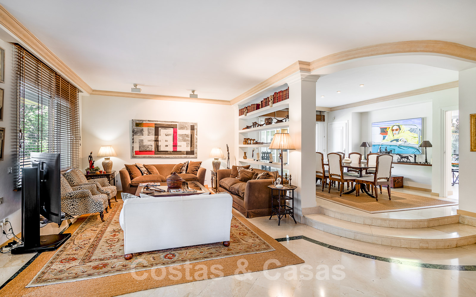 La salle de séjour comprend deux charmants salons et une salle à manger intégrée et surélevée.