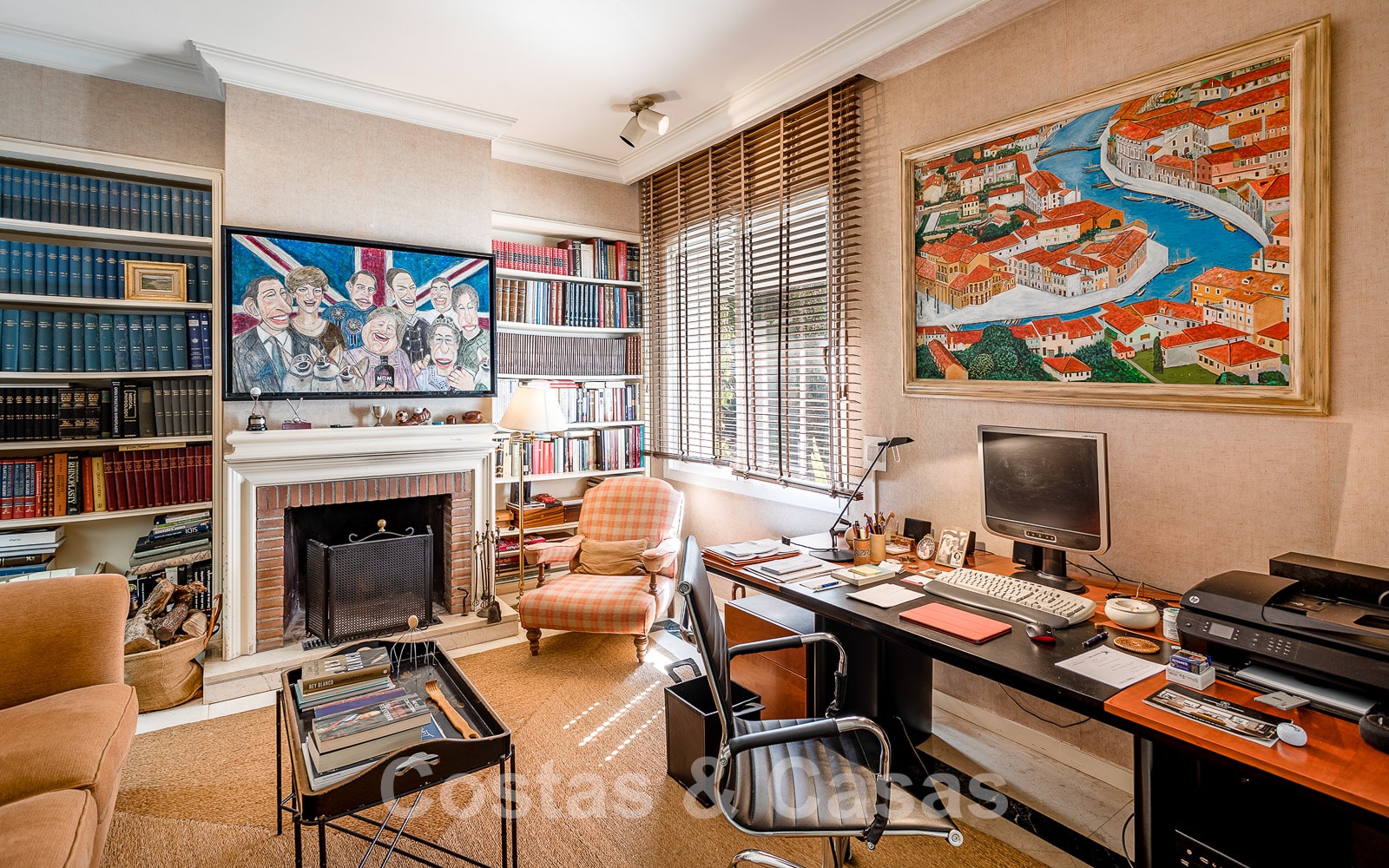 Une bibliothèque/bureau accueillante dotée d'une cheminée traditionnelle.