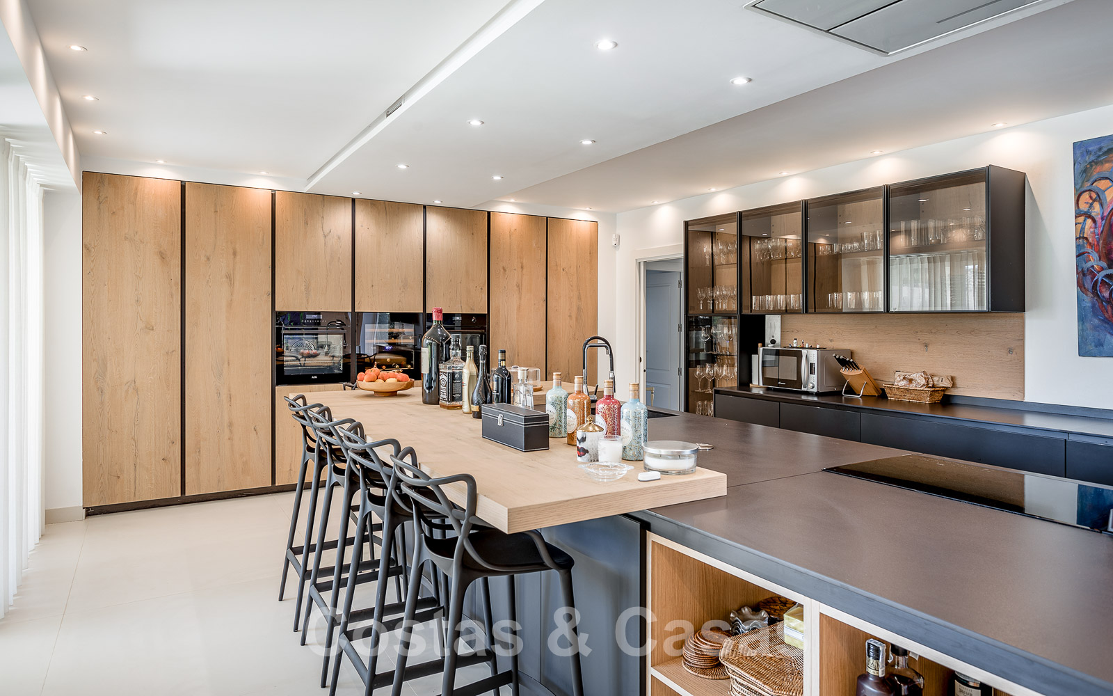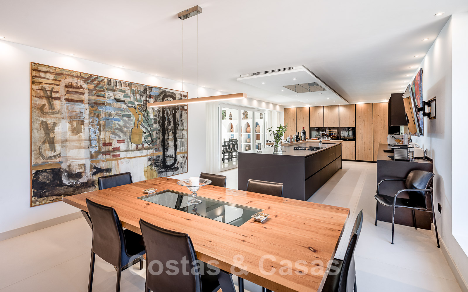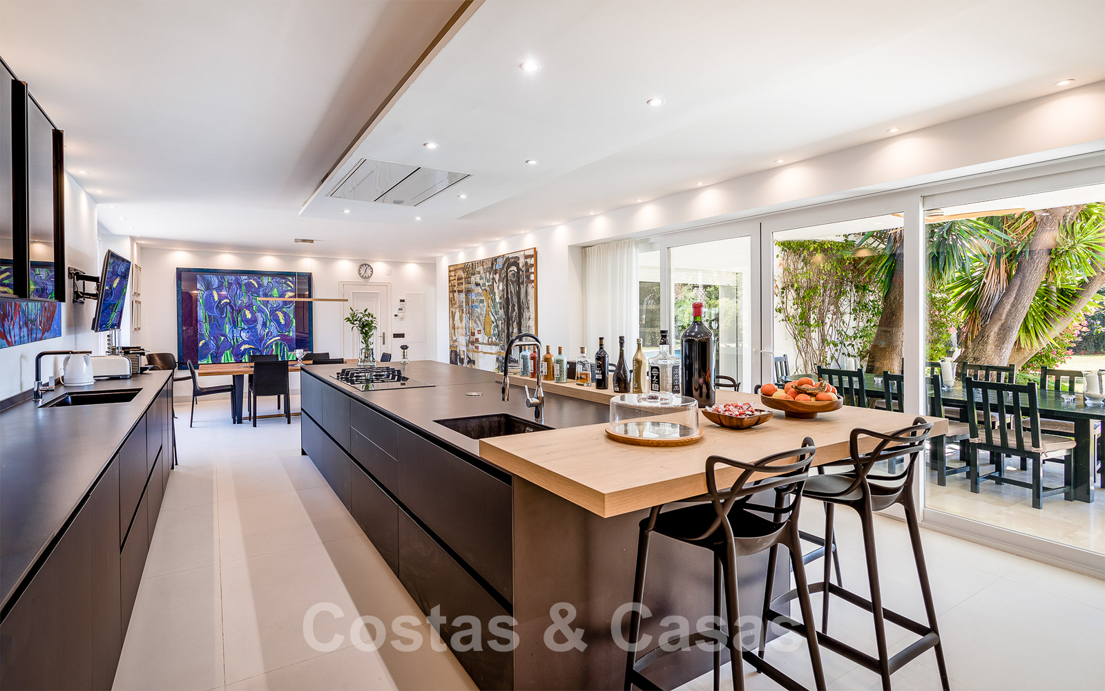Hauts plafonds. Climatisation pour le refroidissement et le chauffage. Cheminée traditionnelle. Auvents motorisés sur la terrasse.