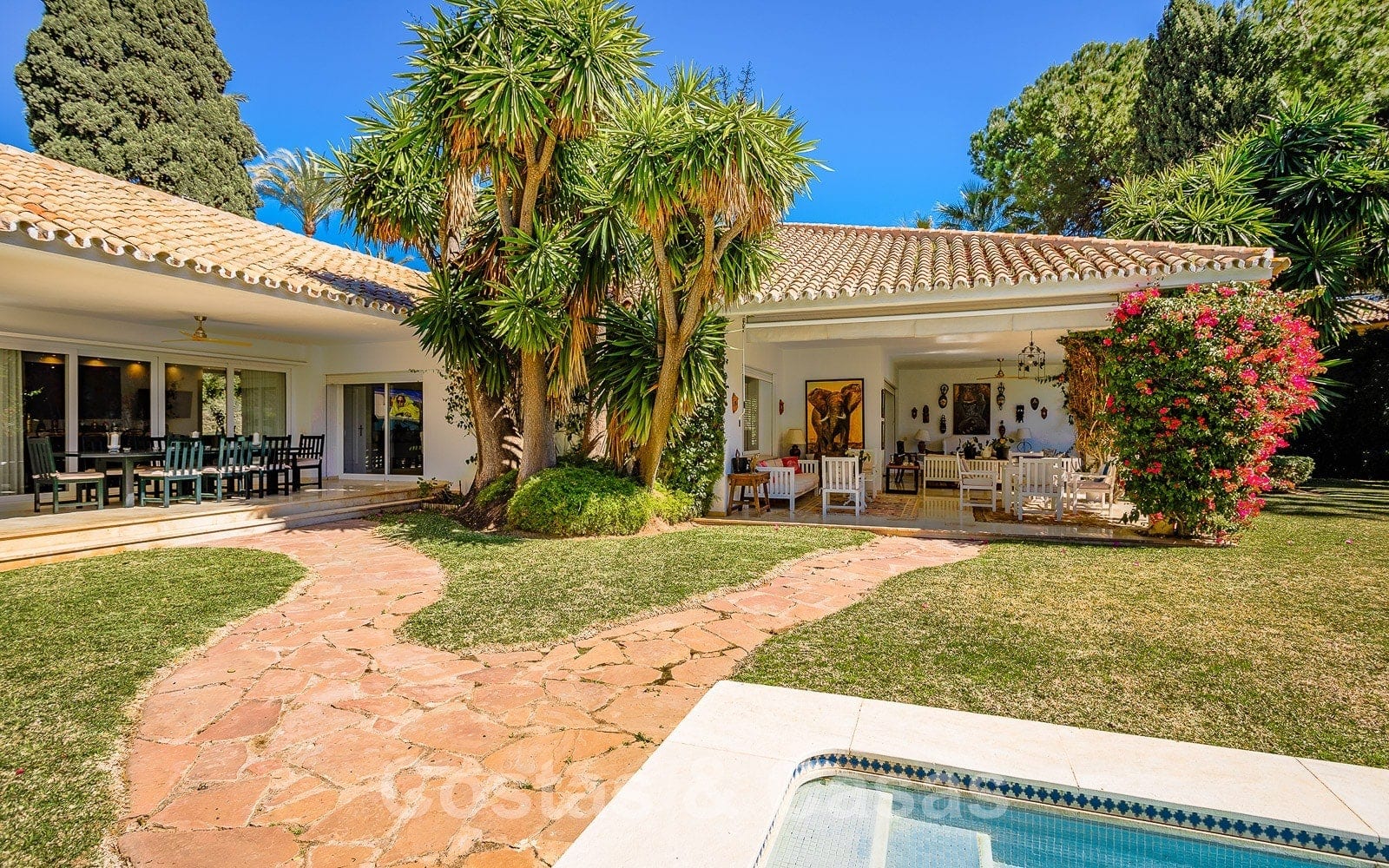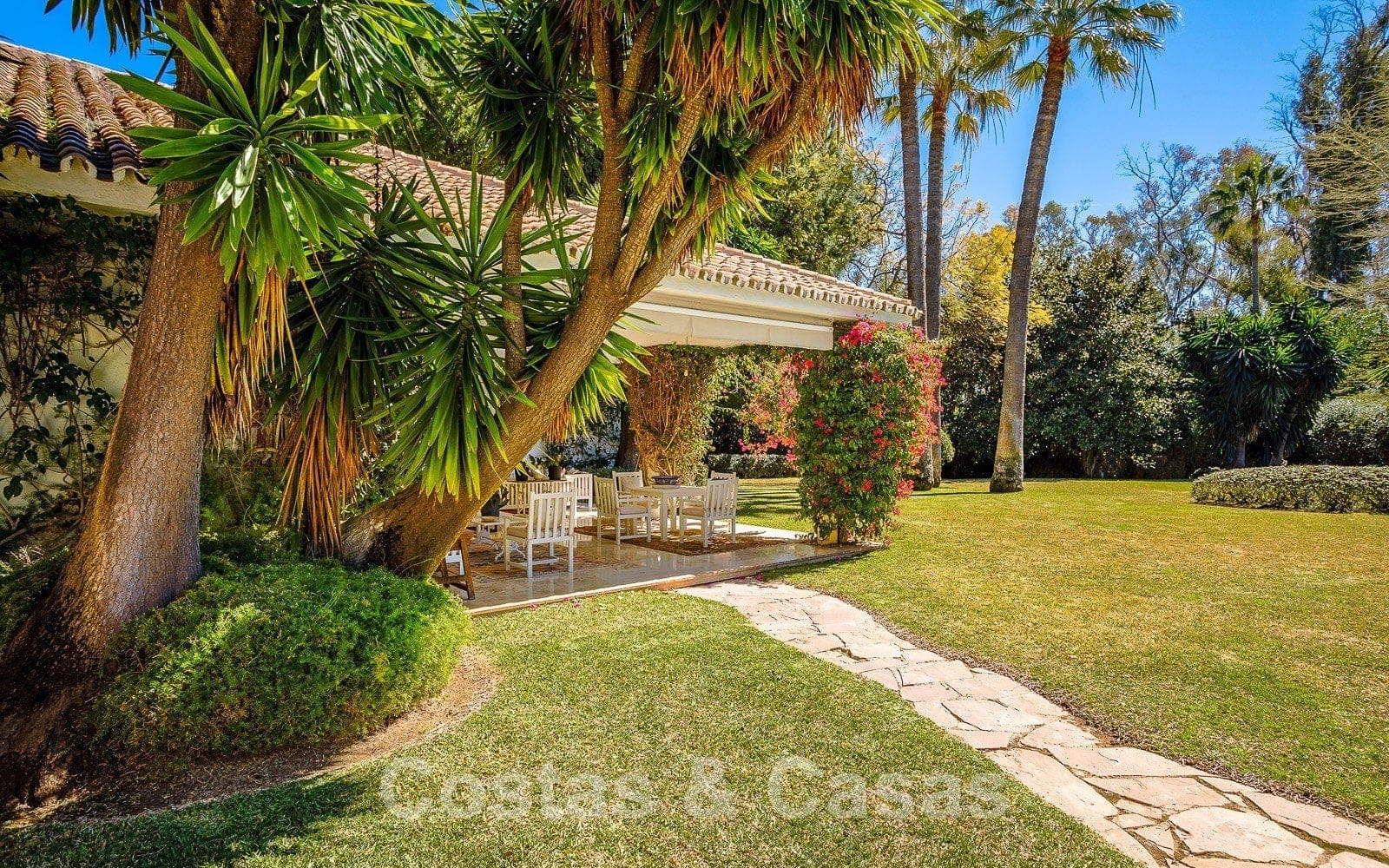 La villa est entourée de jardins et le terrain dispose d'un portail électrique.