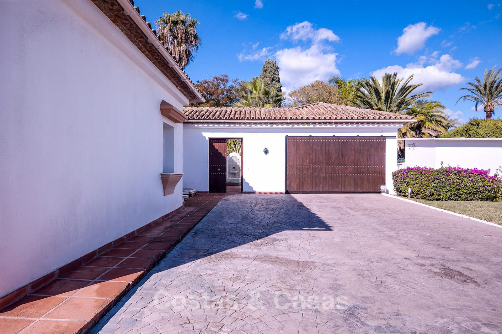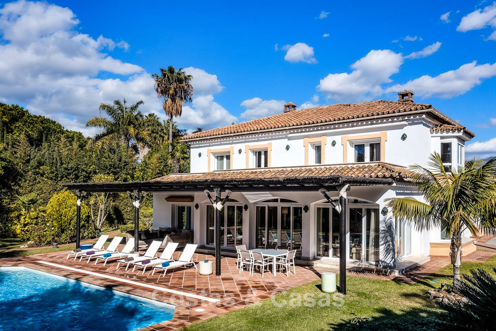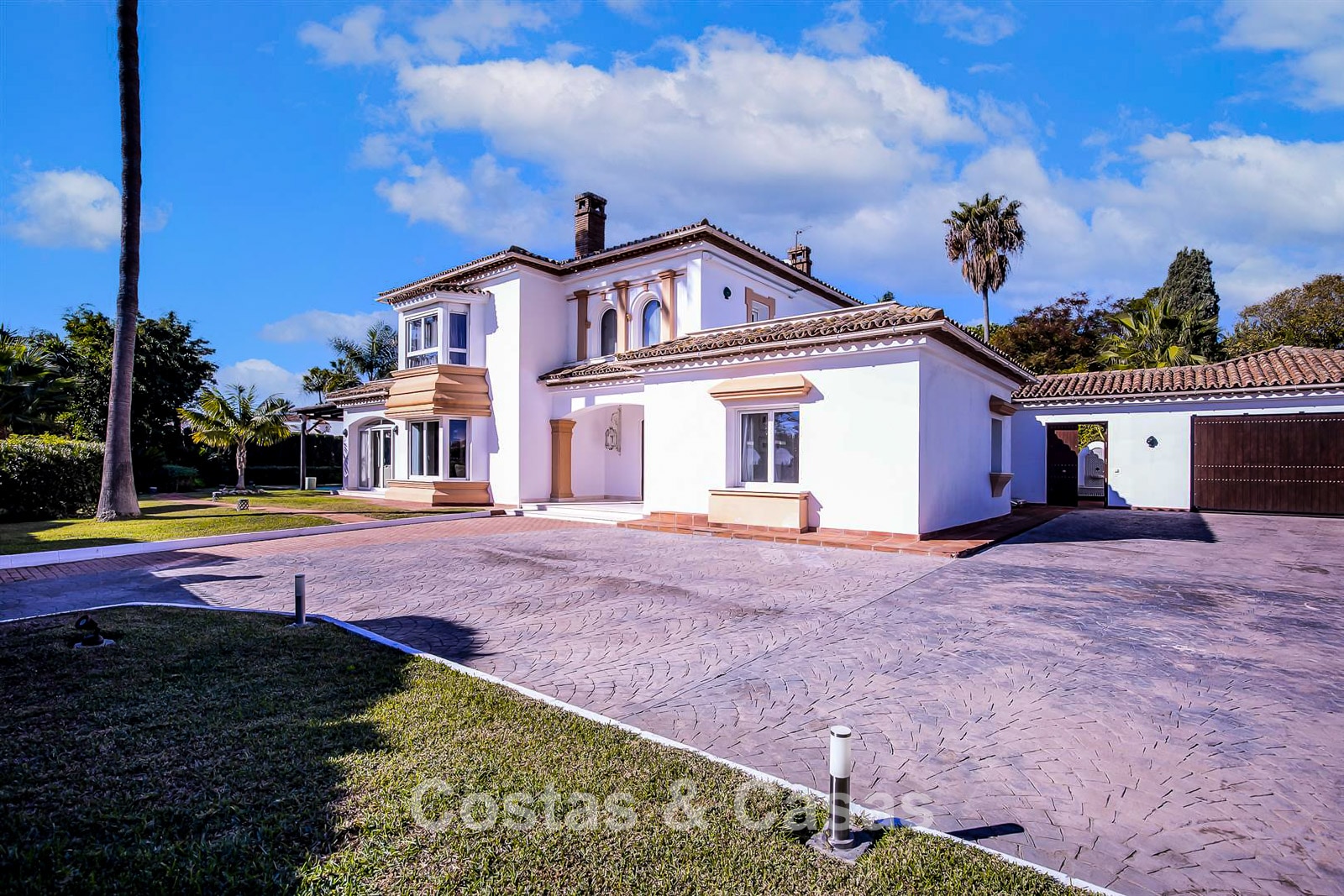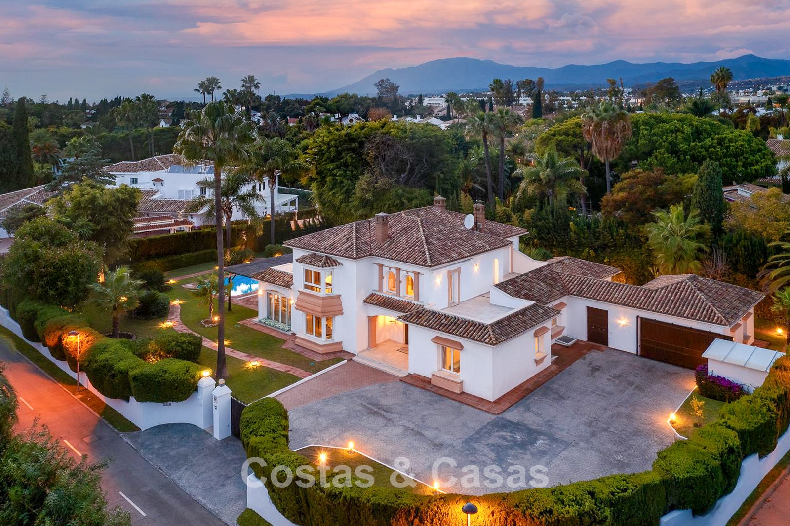 Villa individuelle, construite dans un style architectural espagnol traditionnel. Les matériaux et finitions utilisés sont de haute qualité. En entrant, vous accédez à un hall d’entrée à double hauteur qui s’ouvre sur un spacieux séjour. Grand séjour avec plusieurs coins salon. Les hautes fenêtres s’ouvrent sur l’extérieur et offrent une lumière naturelle abondante. Cuisine séparée, entièrement équipée avec des appareils électroménagers haut de gamme et une table à manger. 6 chambres, chacune avec sa propre salle de bain. Buanderie entièrement équipée avec appareils Bosch. Espace bureau. Deuxième salon TV à l’étage inférieur. Sols en marbre. Garage intégré pour deux voitures. Parking privé sur la propriété.