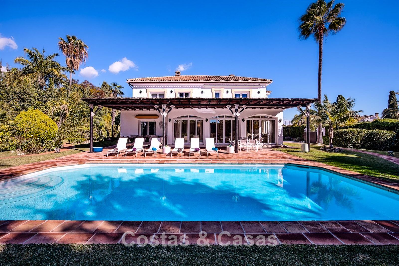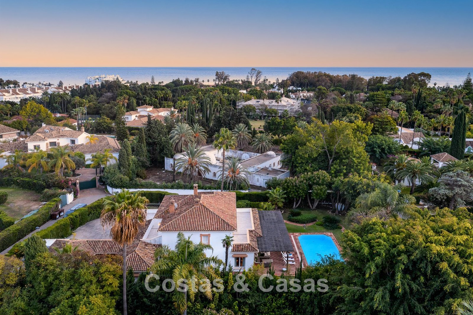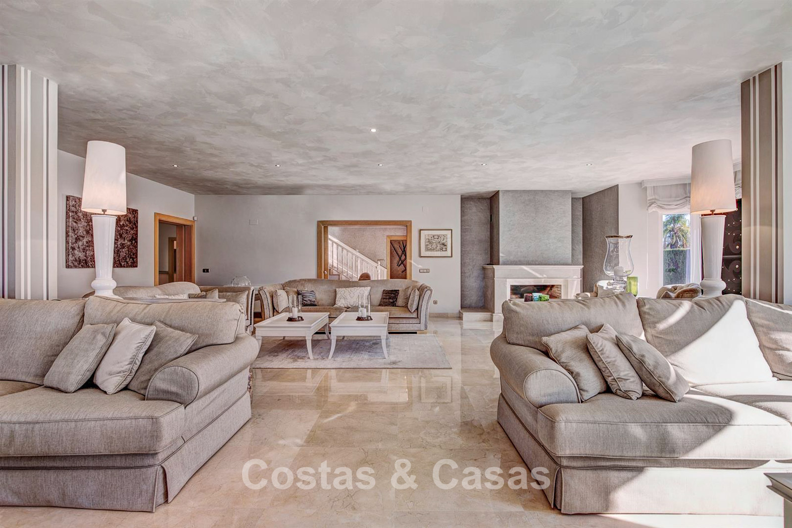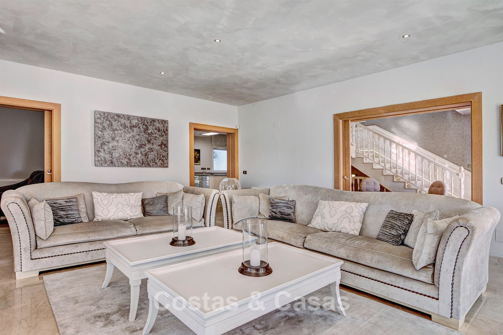 Villa individuelle, construite dans un style architectural espagnol traditionnel. Les matériaux et finitions utilisés sont de haute qualité. En entrant, vous accédez à un hall d’entrée à double hauteur qui s’ouvre sur un spacieux séjour. Grand séjour avec plusieurs coins salon. Les hautes fenêtres s’ouvrent sur l’extérieur et offrent une lumière naturelle abondante. Cuisine séparée, entièrement équipée avec des appareils électroménagers haut de gamme et une table à manger. 6 chambres, chacune avec sa propre salle de bain. Buanderie entièrement équipée avec appareils Bosch. Espace bureau. Deuxième salon TV à l’étage inférieur. Sols en marbre. Garage intégré pour deux voitures. Parking privé sur la propriété.