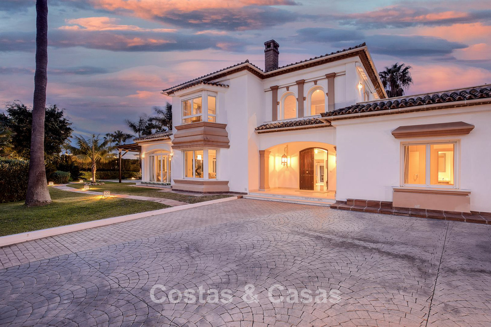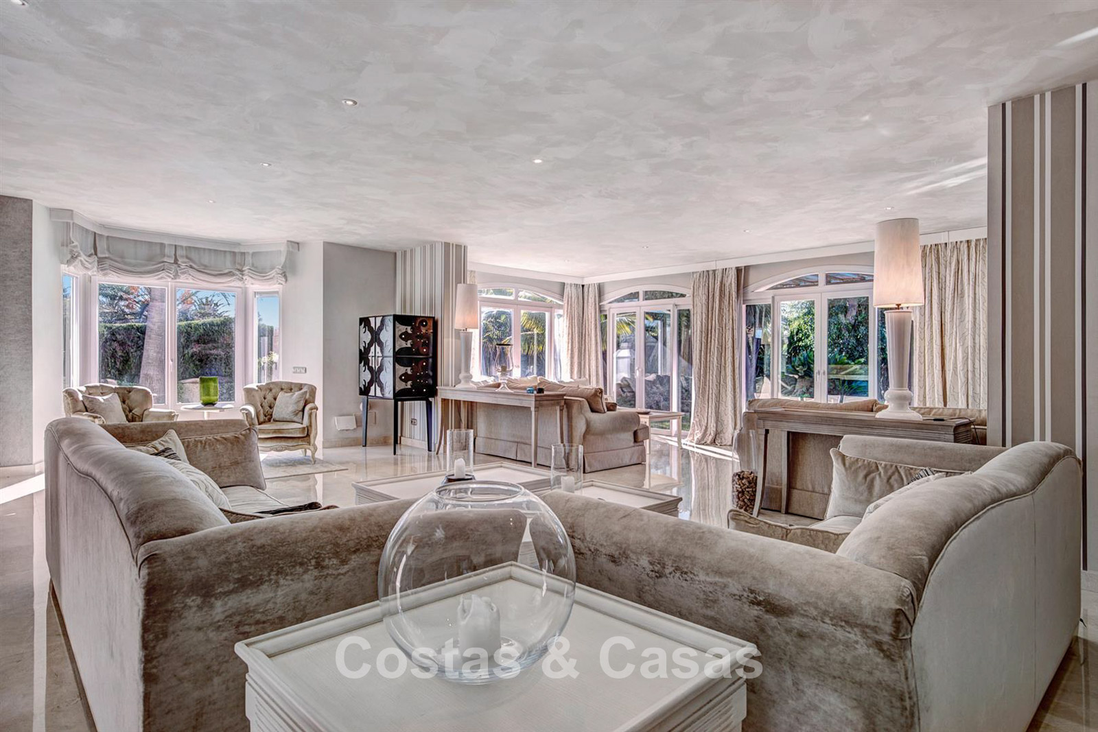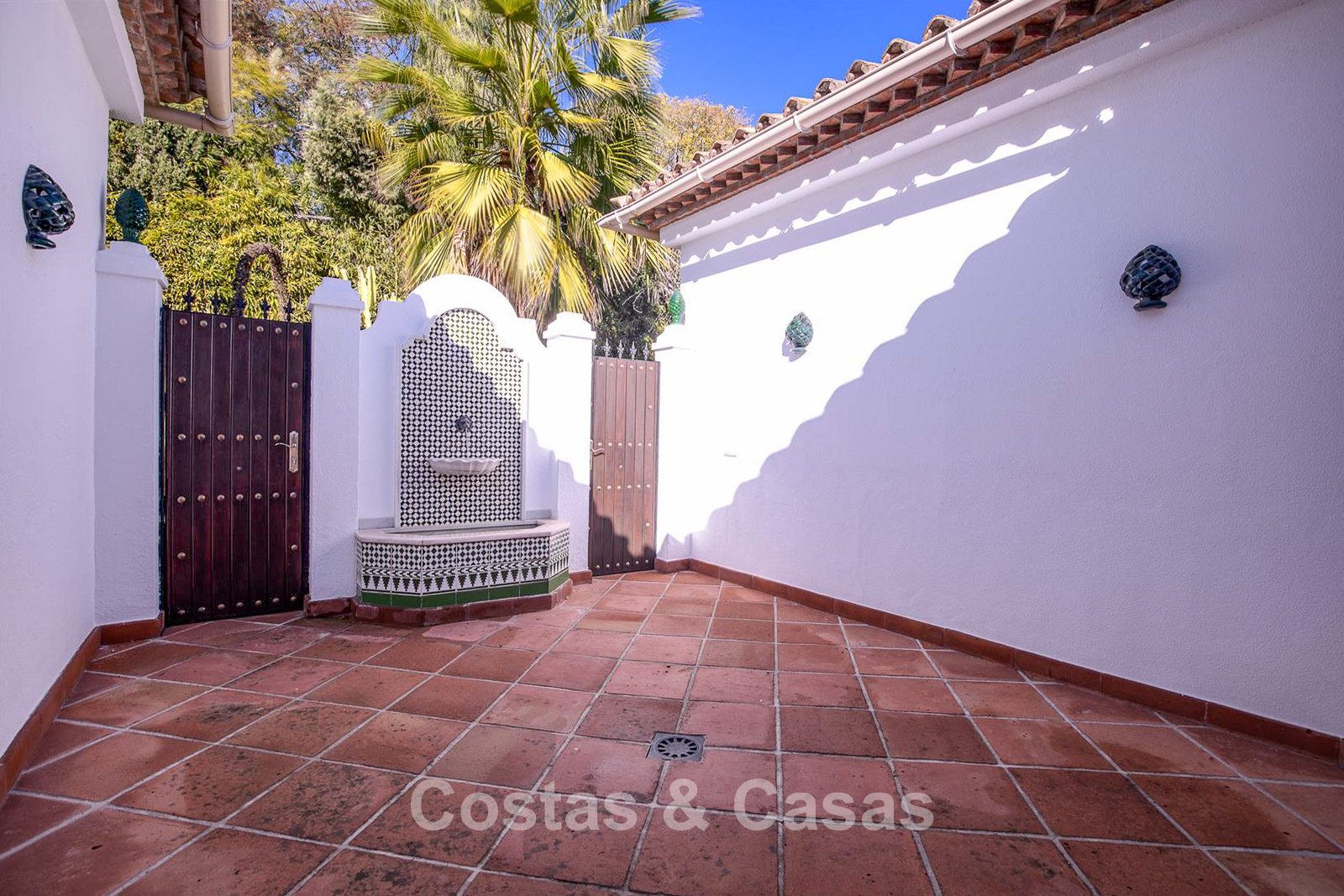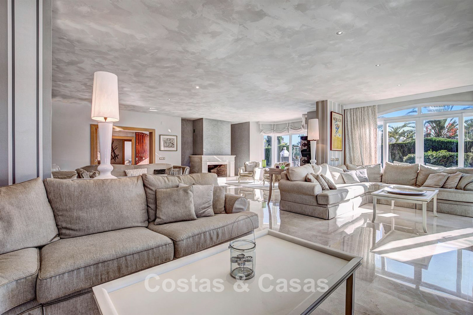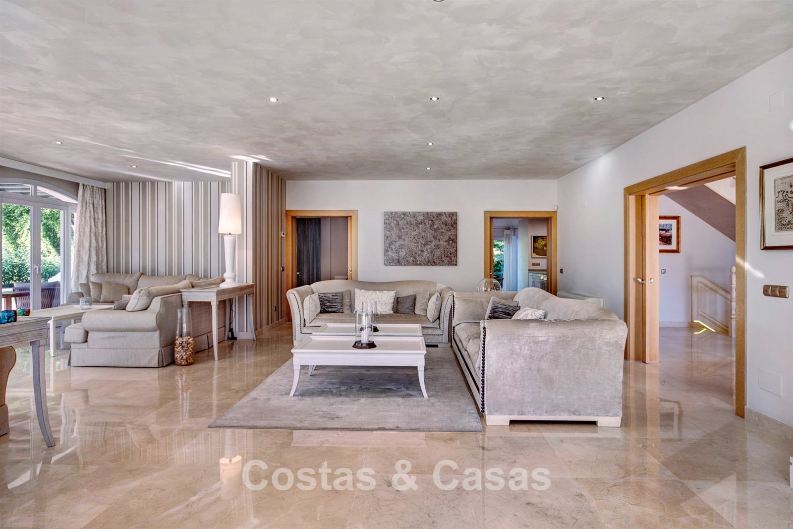 Villa individuelle, construite dans un style architectural espagnol traditionnel. Les matériaux et finitions utilisés sont de haute qualité. En entrant, vous accédez à un hall d’entrée à double hauteur qui s’ouvre sur un spacieux séjour. Grand séjour avec plusieurs coins salon. Les hautes fenêtres s’ouvrent sur l’extérieur et offrent une lumière naturelle abondante. Cuisine séparée, entièrement équipée avec des appareils électroménagers haut de gamme et une table à manger. 6 chambres, chacune avec sa propre salle de bain. Buanderie entièrement équipée avec appareils Bosch. Espace bureau. Deuxième salon TV à l’étage inférieur. Sols en marbre. Garage intégré pour deux voitures. Parking privé sur la propriété.