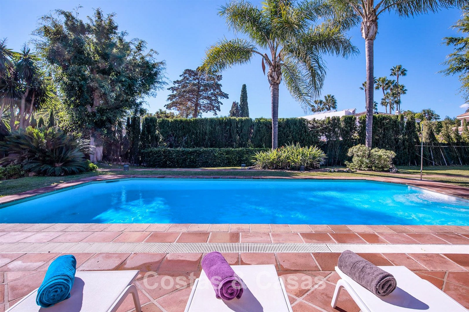 Terrain spacieux, entièrement clos de hautes plantations. Magnifique jardin arboré avec une végétation tropicale abondante. Piscine creusée avec terrasse ensoleillée adjacente et chaises longues confortables. Orientation sud-ouest. Vue paisible sur le jardin et la piscine.
