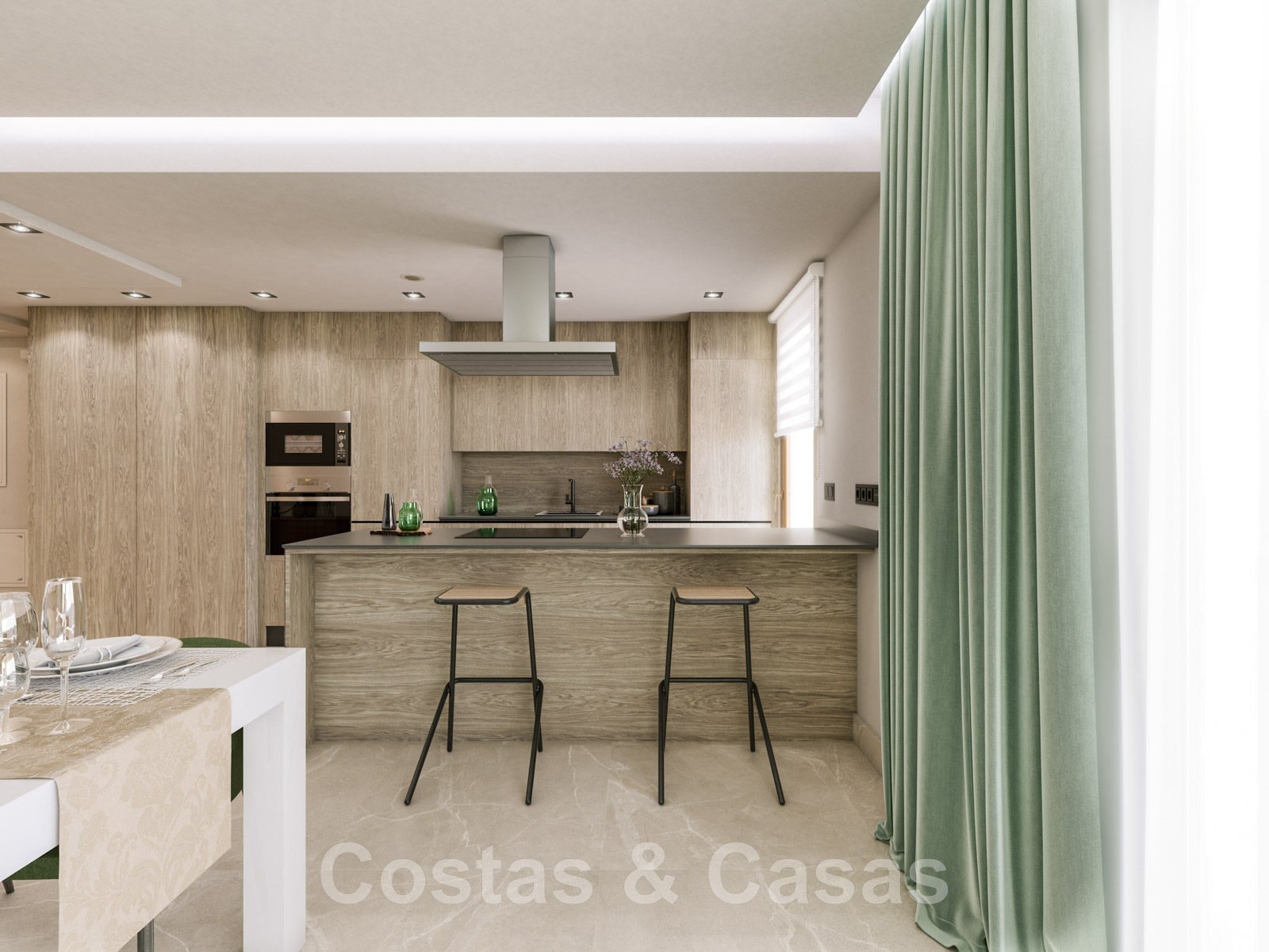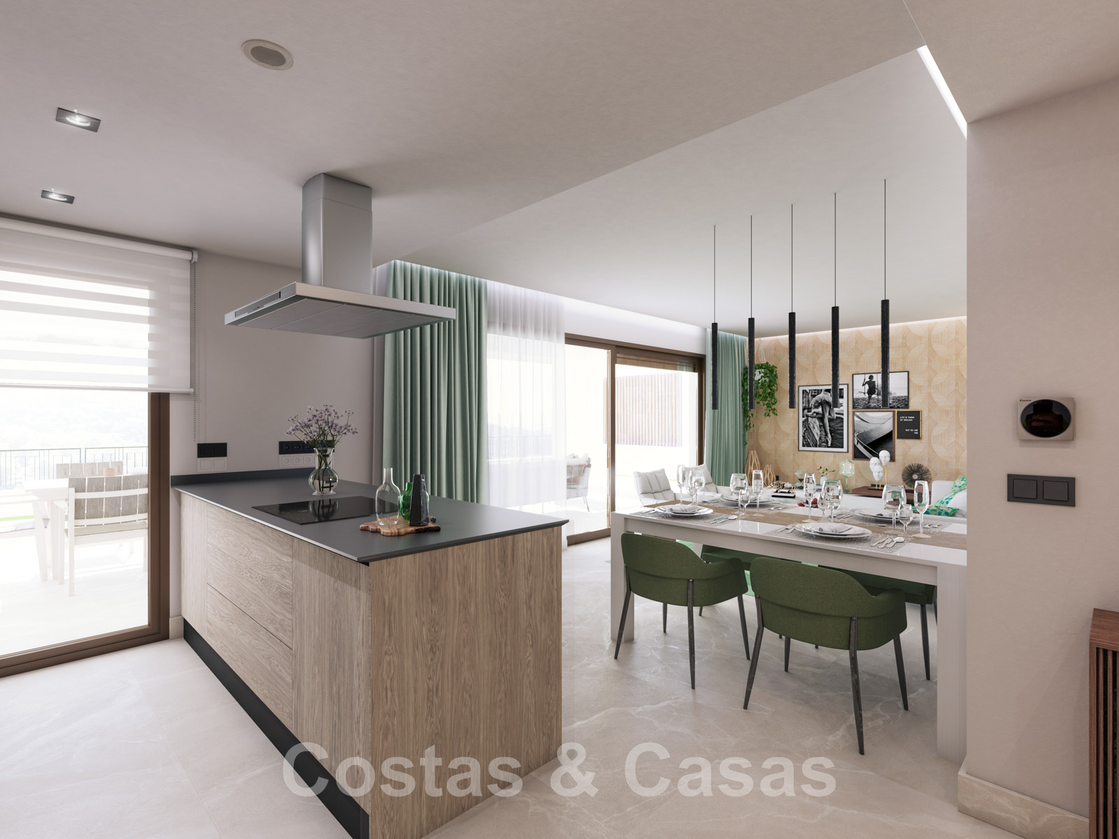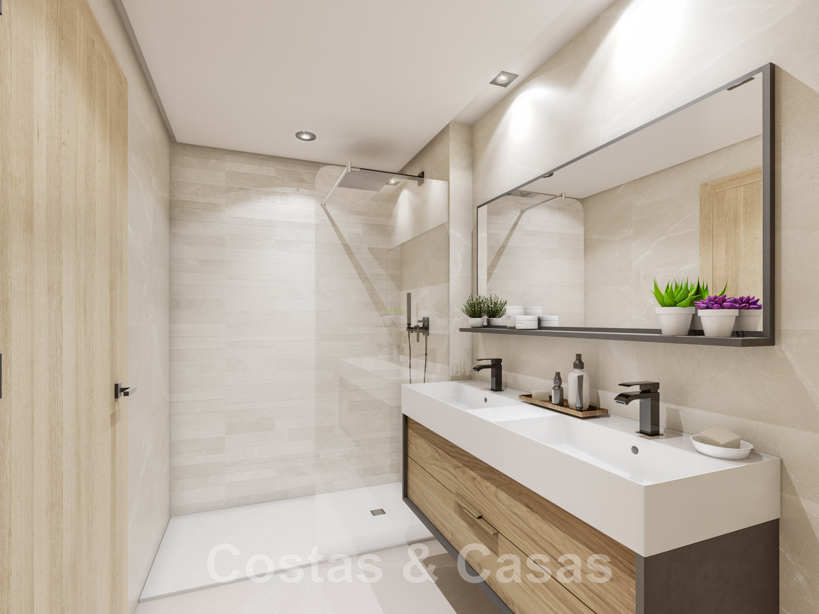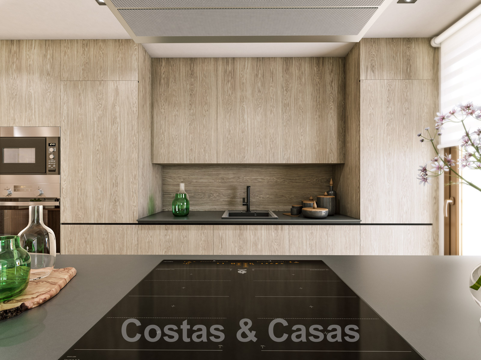 Balustrades en verre. Climatisation. Panneaux solaires. Double vitrage. Carreaux de sol "Saloni" 90x90cm. Salles de bains et cuisine équipées d'appareils sanitaires "Jacob Delafon". Domotique. Installation télécom.