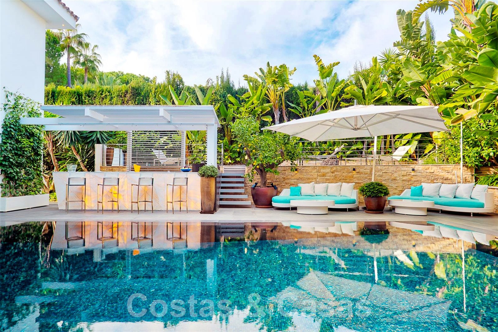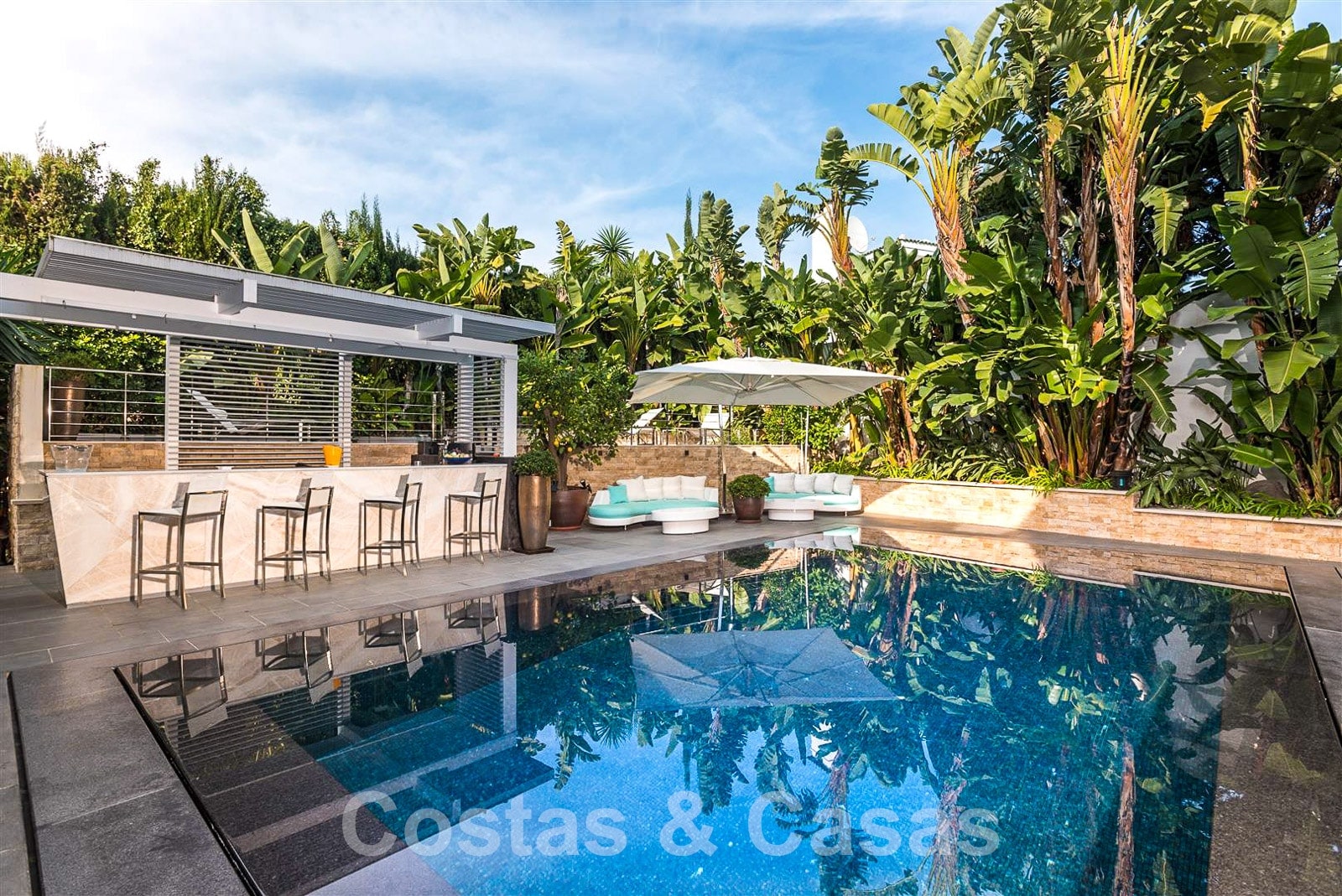 Piscine à débordement avec bar de piscine.