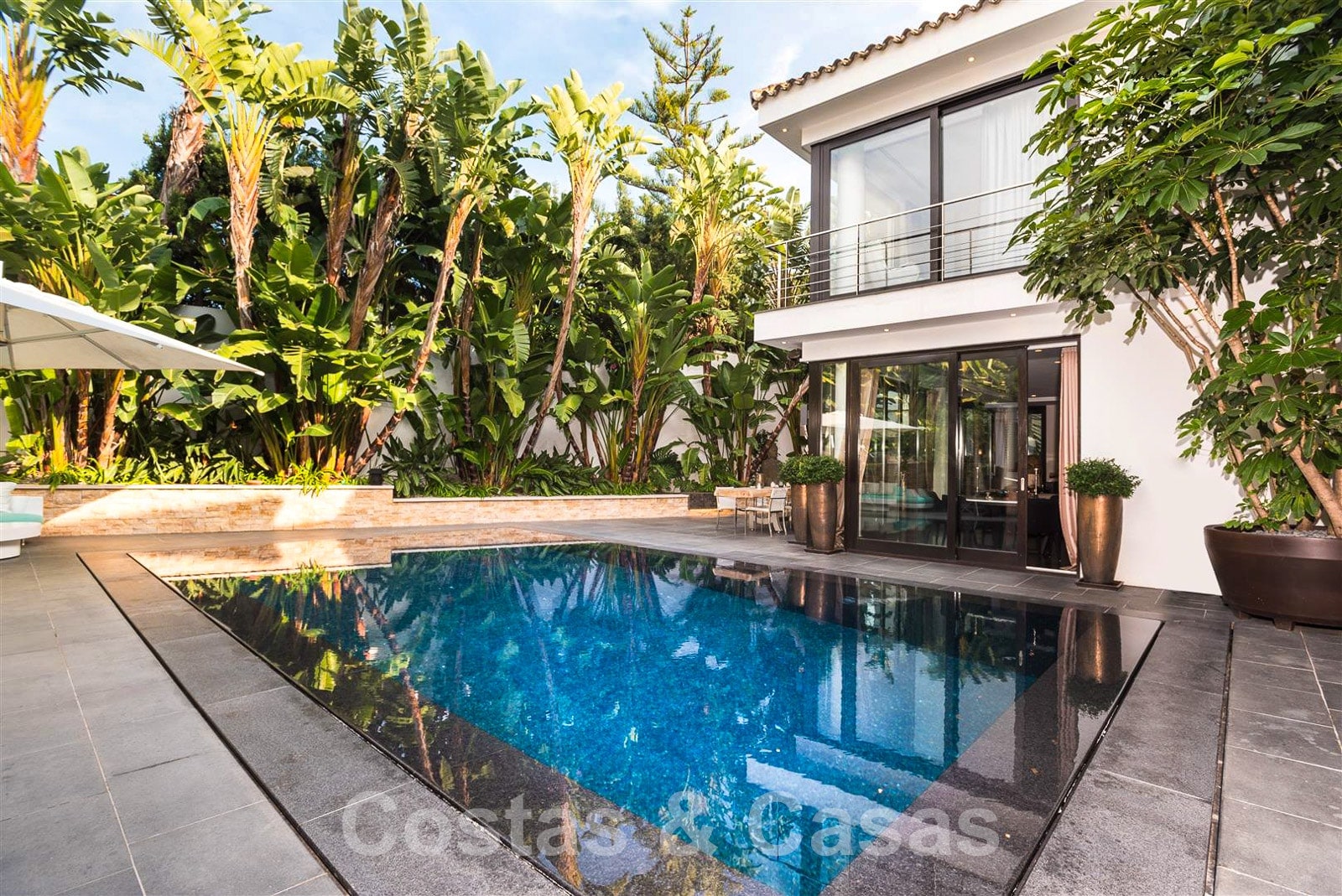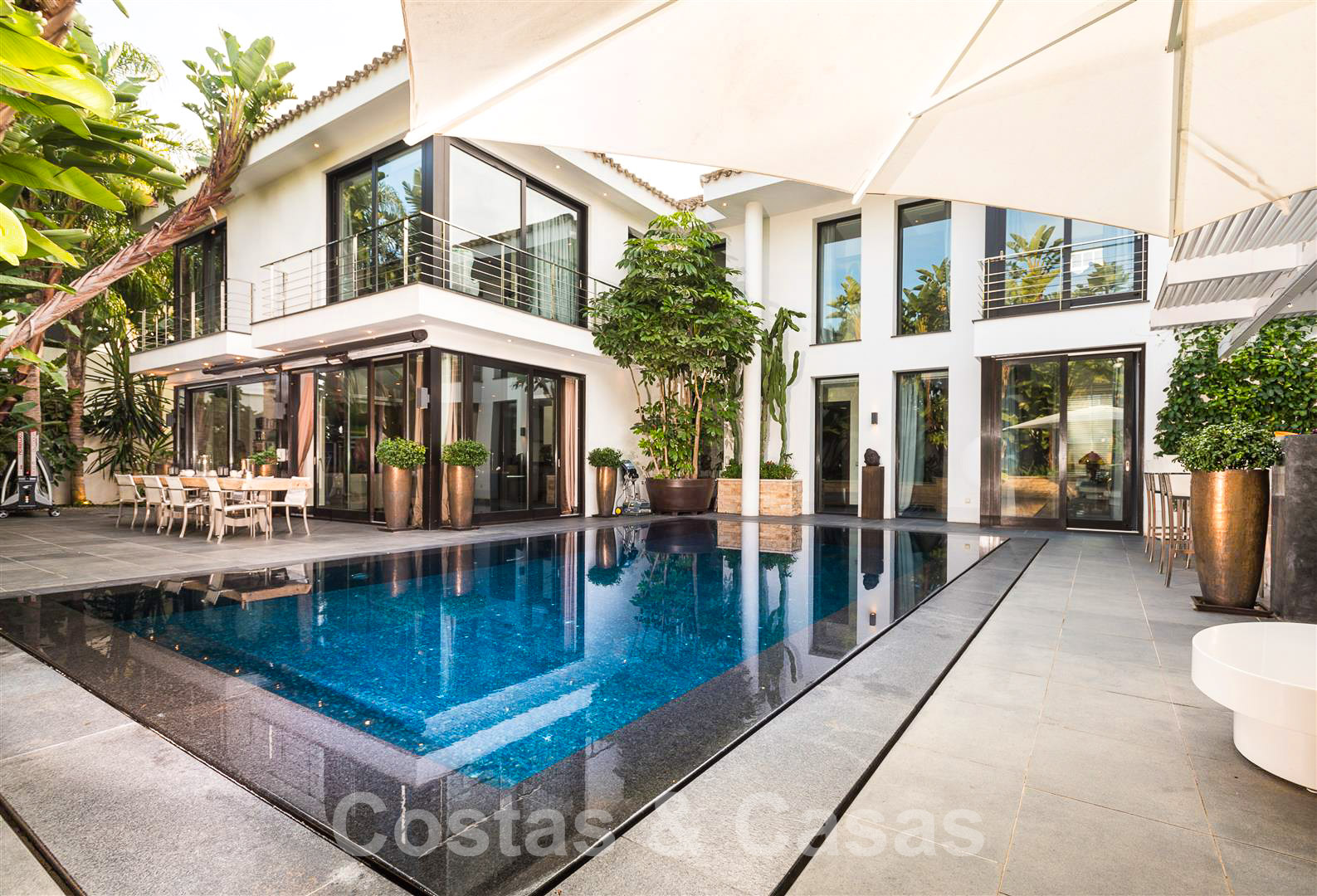 De grandes fenêtres à guillotine dans toute la villa apportent beaucoup de lumière naturelle et permettent d'accéder à l'espace extérieur.