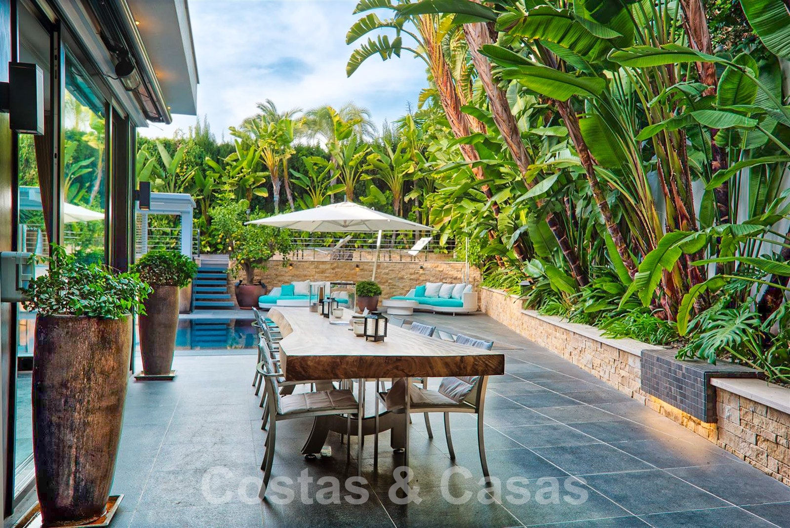 Vaste terrasse autour de la piscine avec beaucoup d'espace pour les chaises longues, les installations de salon et une salle à manger en plein air.