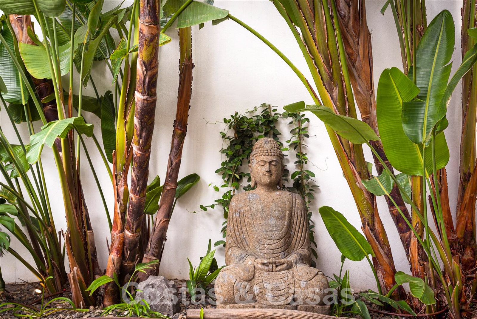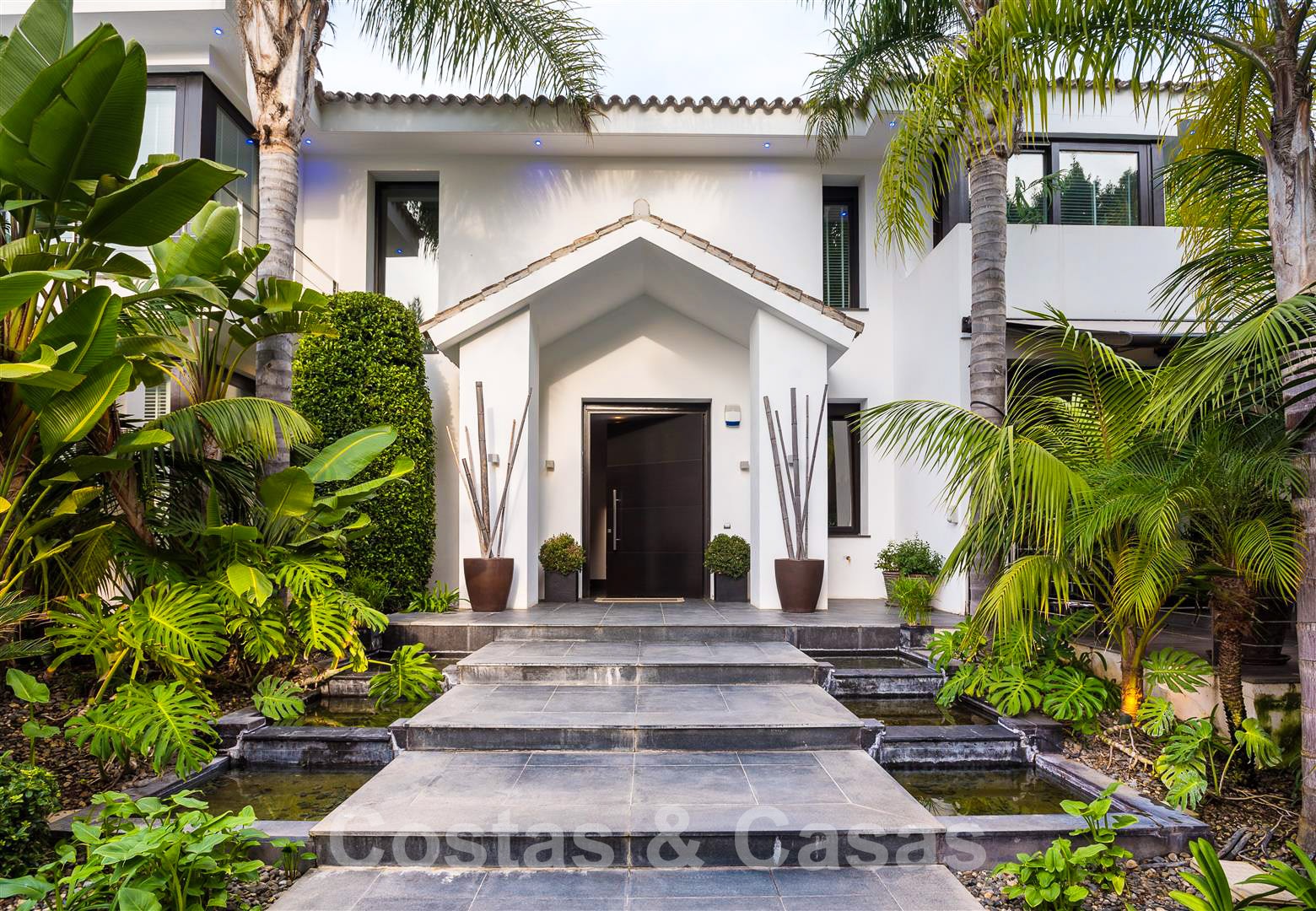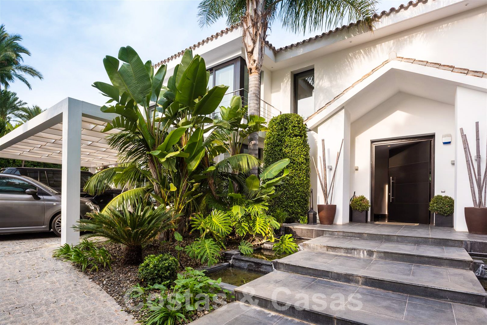 Une entrée élégante vous accueille avec une belle pièce d'eau.