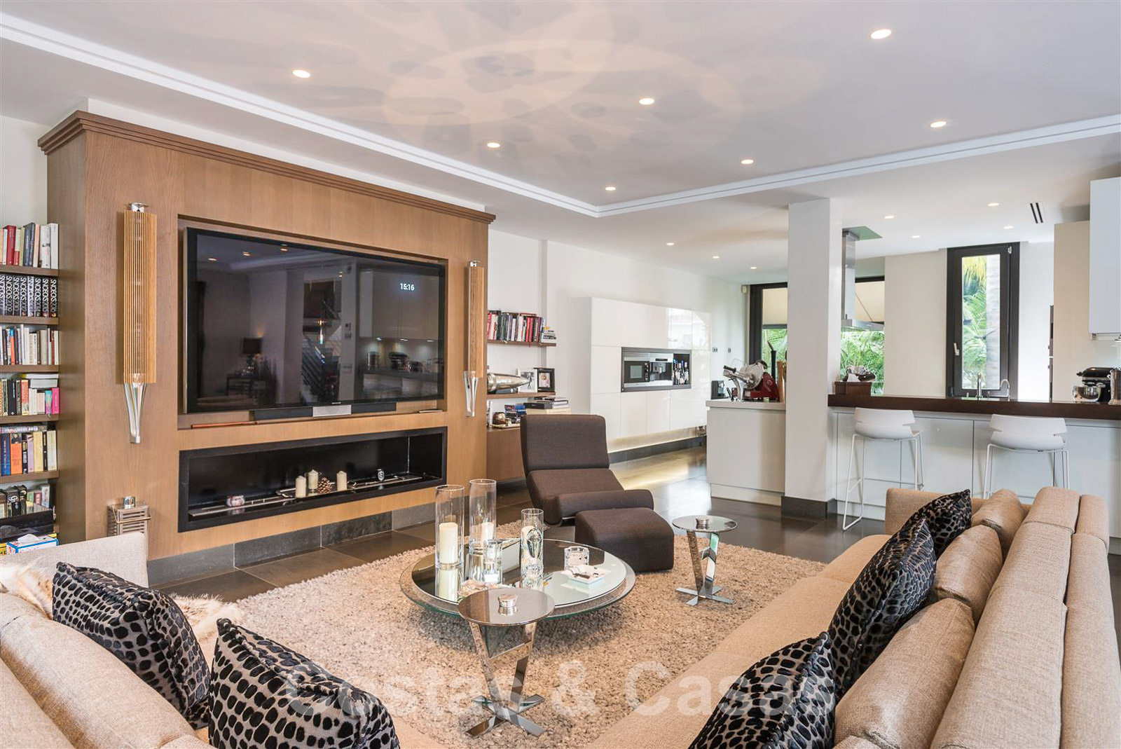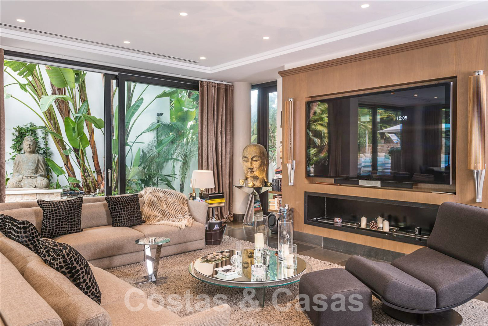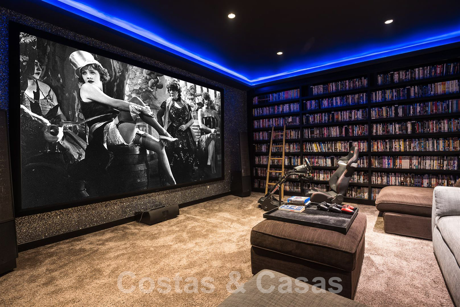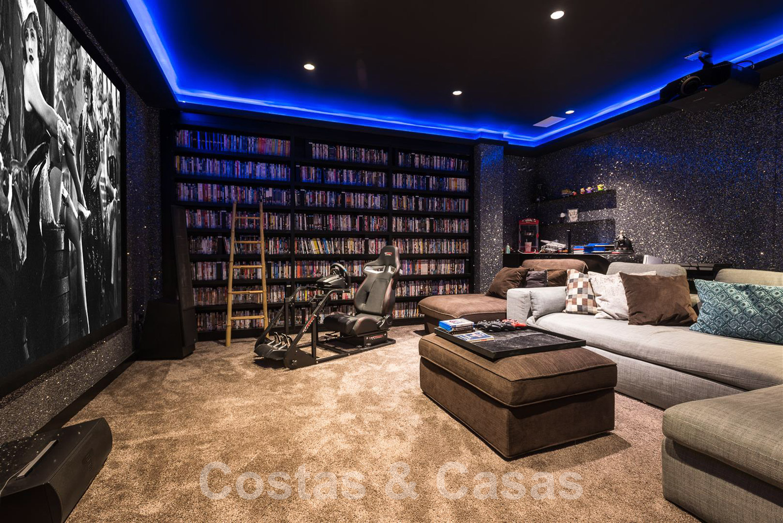 A l’étage inférier, un home cinéma, une salle de massage, un sauna et une buanderie.