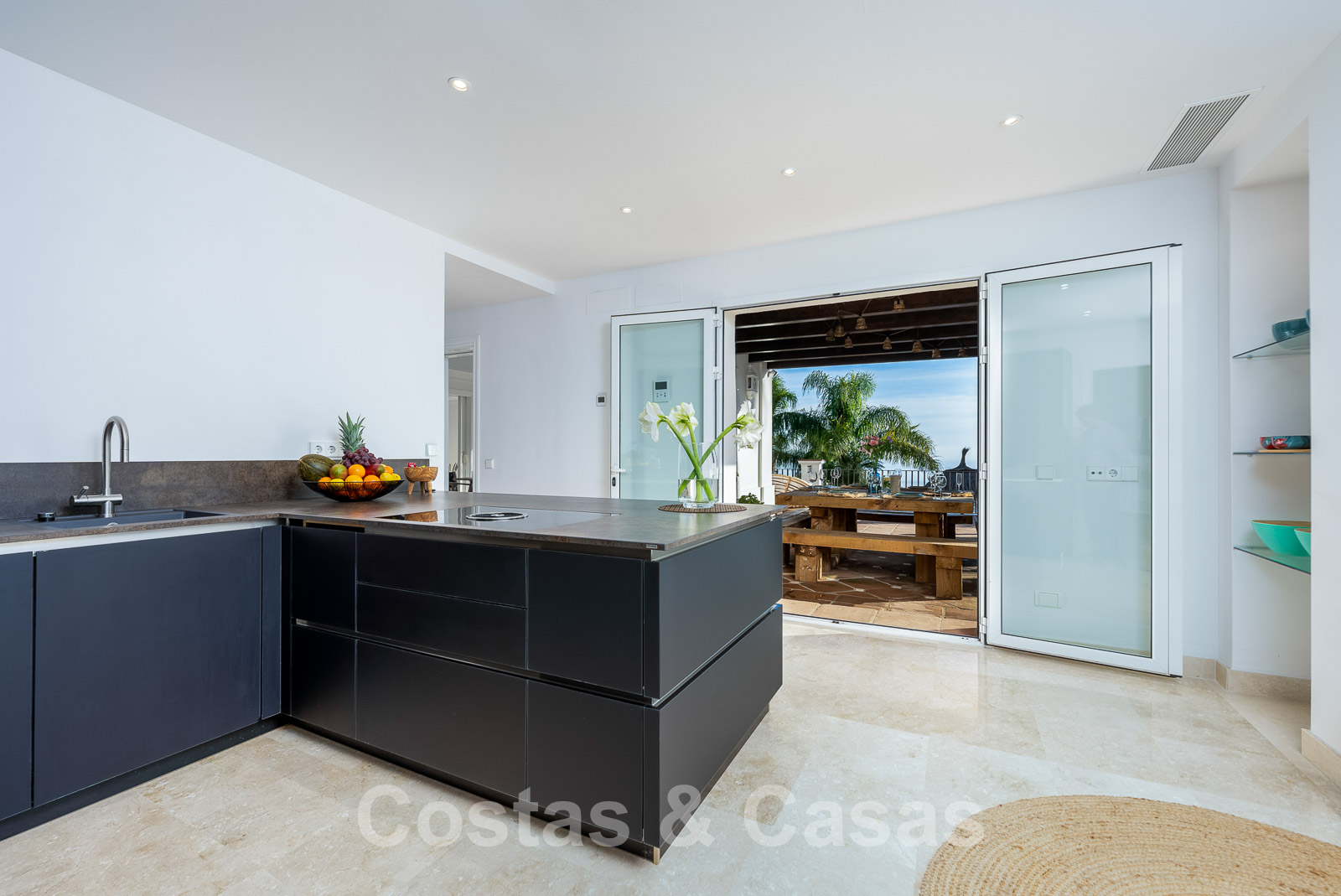 Cuisine moderne entièrement équipée avec des appareils Gaggenau et accès à un espace confortable pour les repas en plein air.