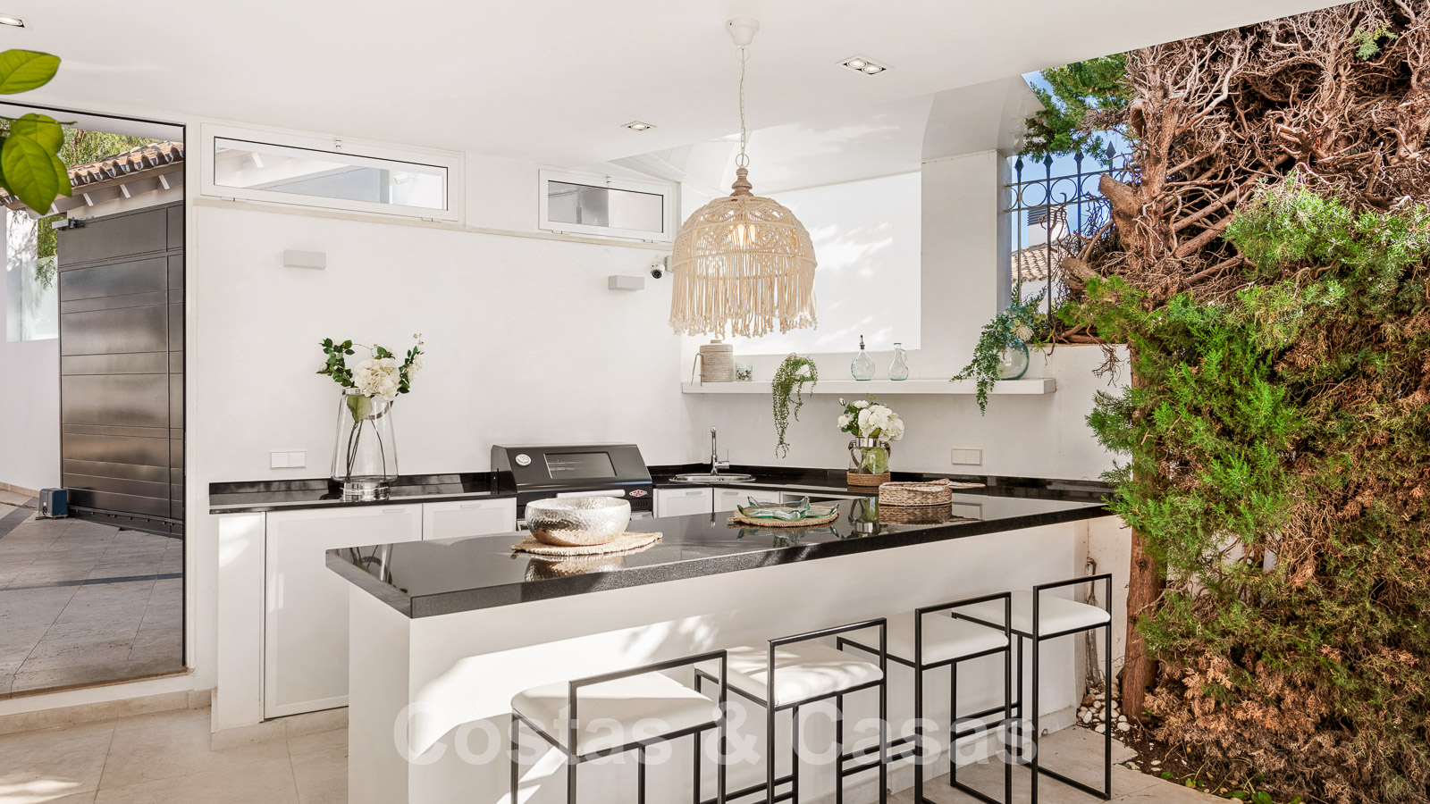 Une cuisine ouverte entièrement équipée suivie d'une terrasse couverte, équipée d'une cuisine extérieure et d'un coin repas.