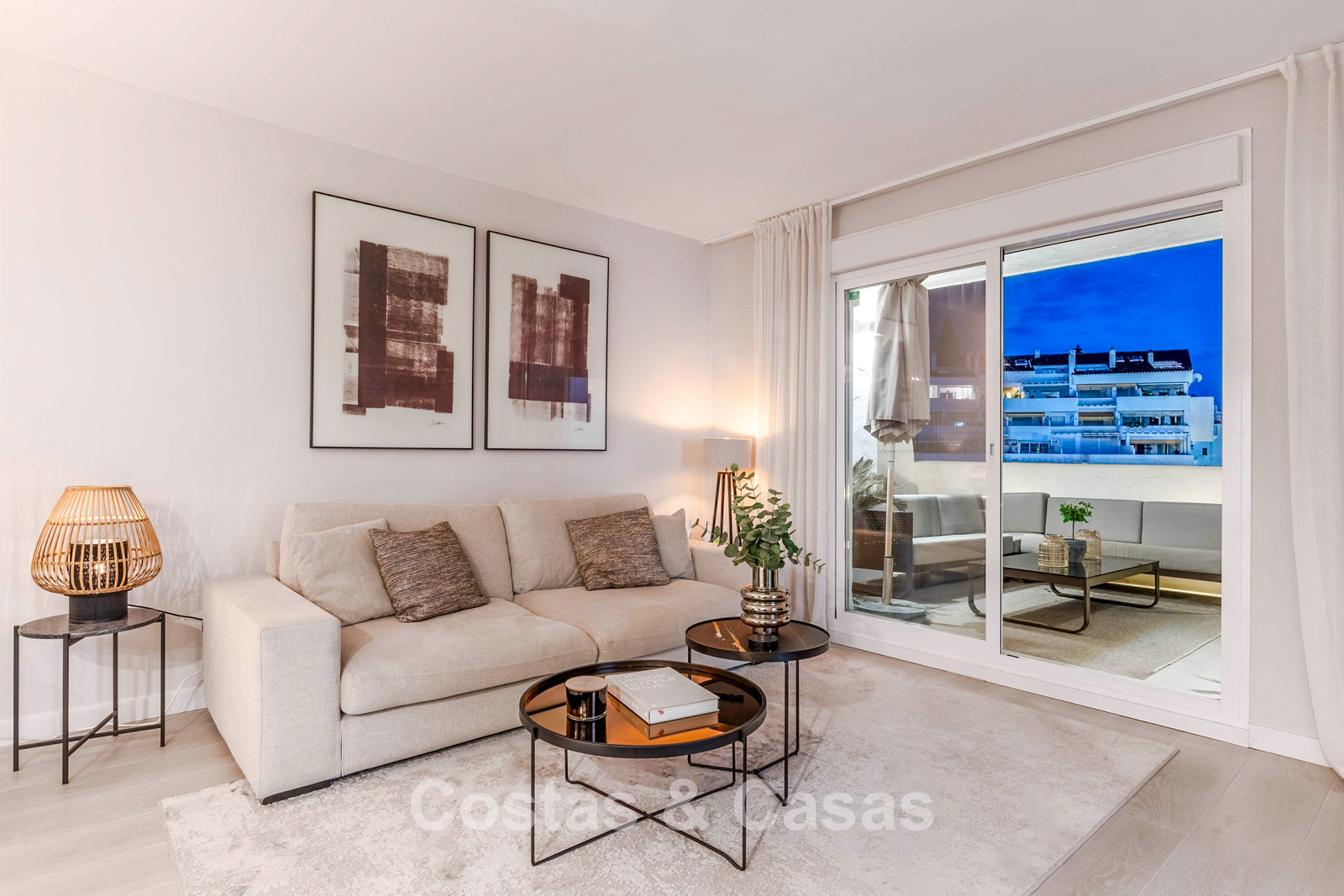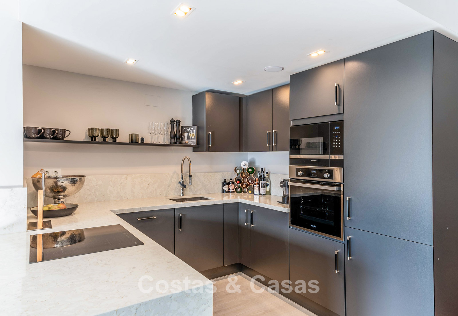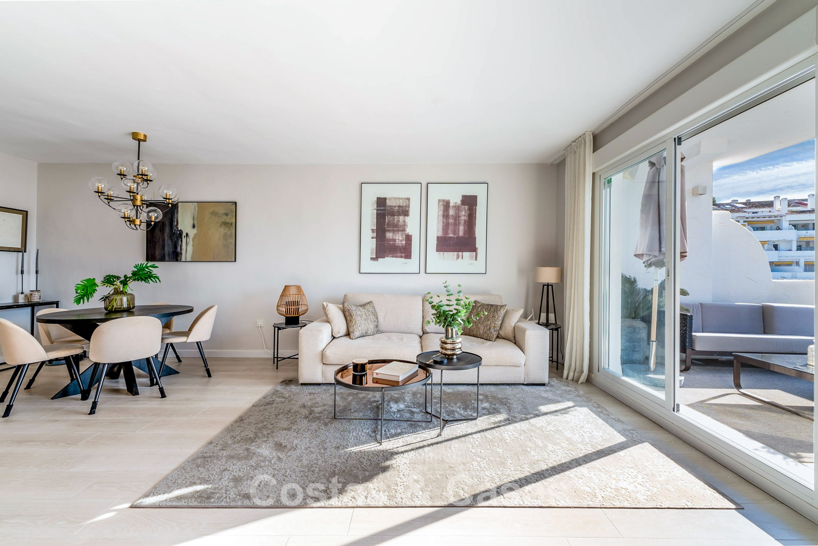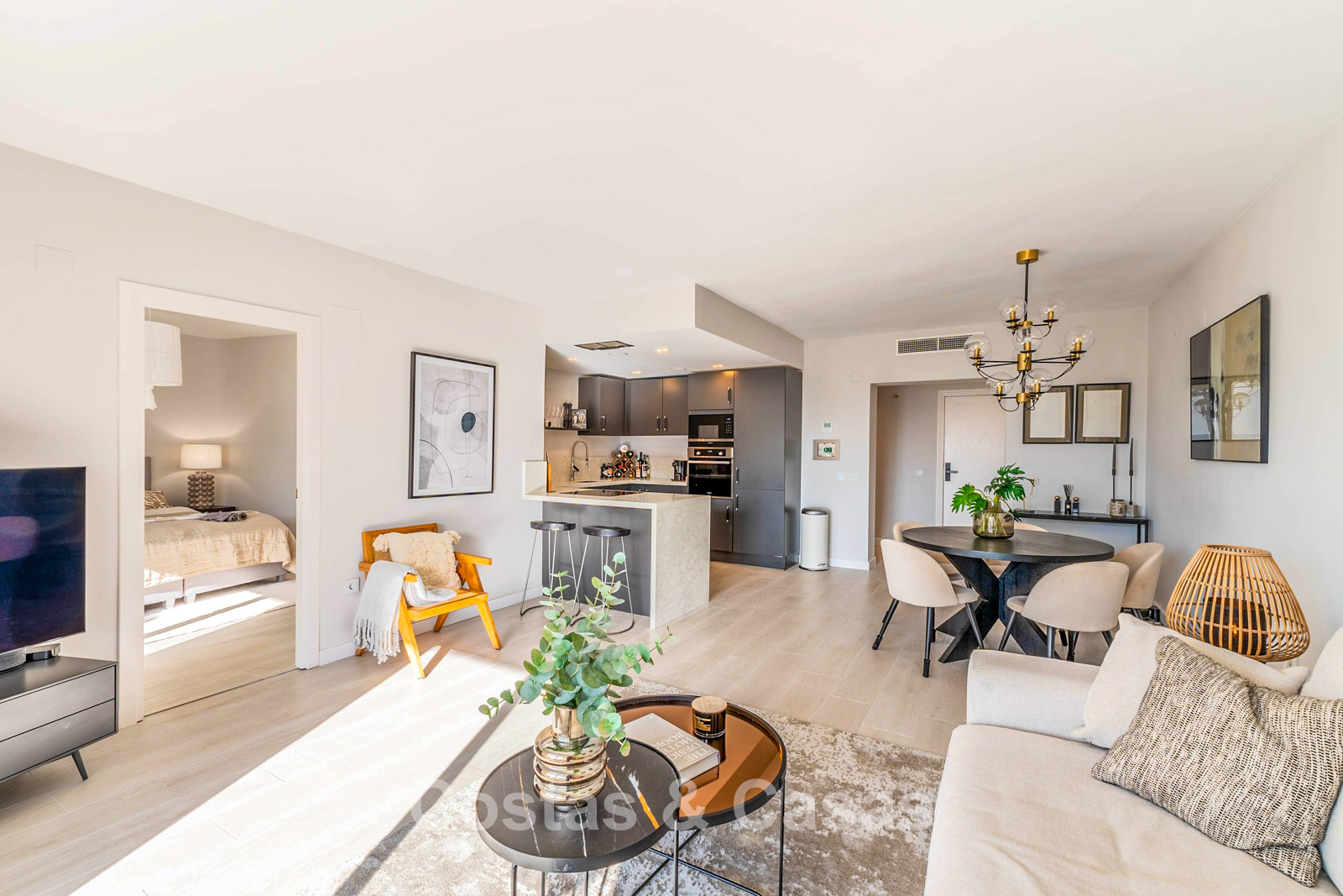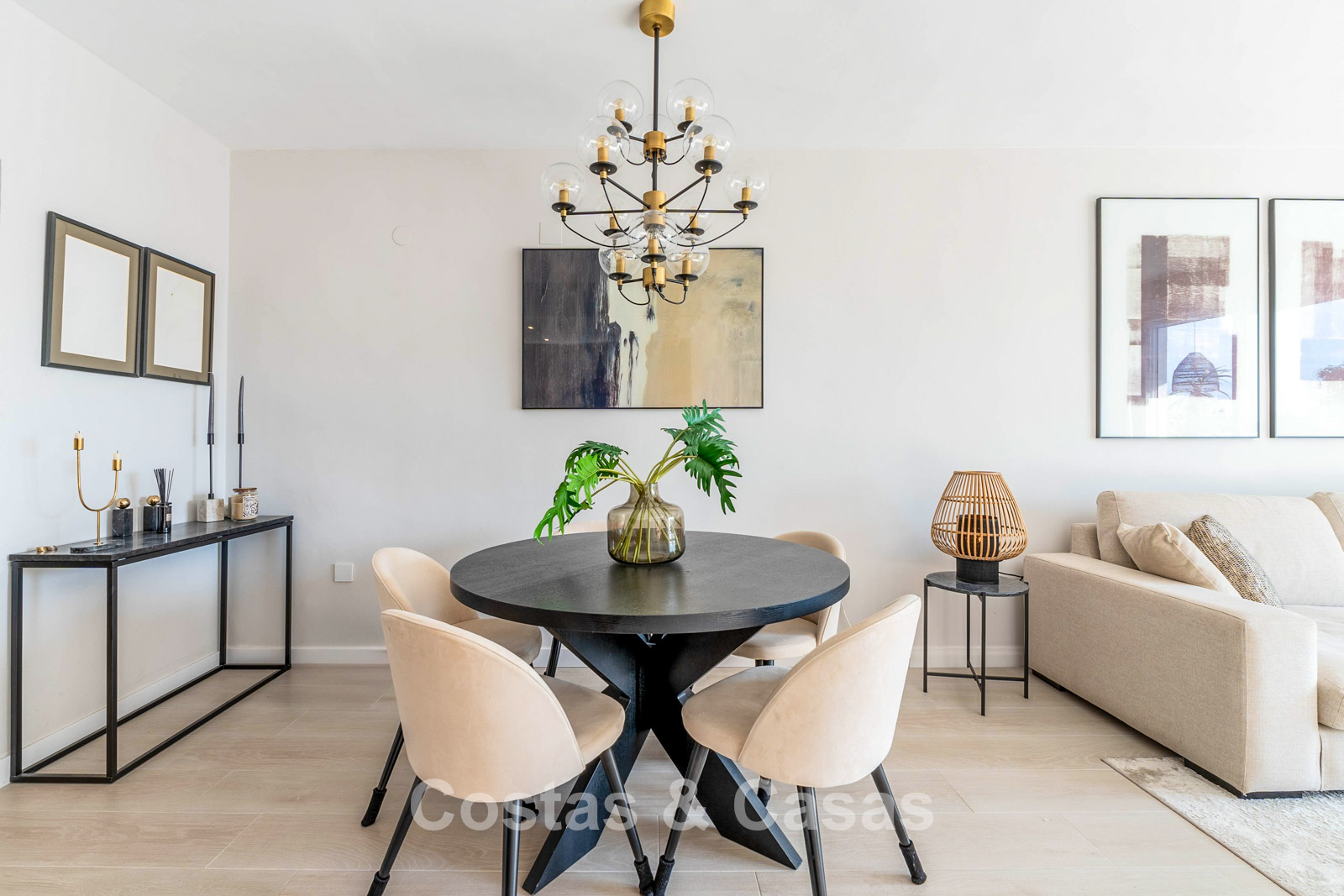 Appartement lumineux, élégamment rénové dans un style moderne. Finitions de haute qualité à un niveau élevé. Terrasse semi-ouverte avec espace chillout et espace ‘repas en plein air’. Orienté au sud. Vue partielle sur la mer Méditerranée. Intérieur contemporain avec un agencement moderne et ouvert et un style scandinave. Séjour ouvert avec salon et coin repas intégré. Cuisine/salle à manger pratique avec appareils Siemens de haute qualité et un bar pour le petit-déjeuner. De hautes fenêtres coulissantes dans le salon donnent accès à la terrasse et laissent également entrer beaucoup de lumière naturelle. 3 chambres, 2 salles de bains. Garage intérieur pour 1 voiture dans le garage commun.