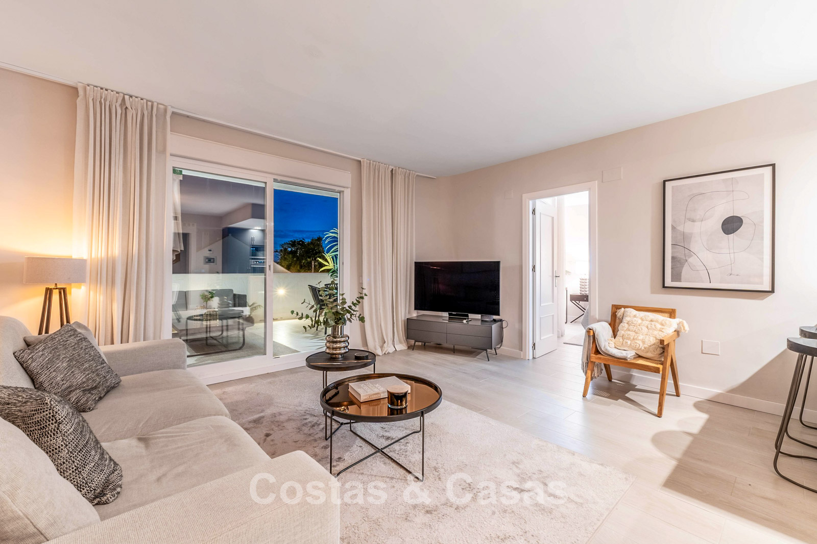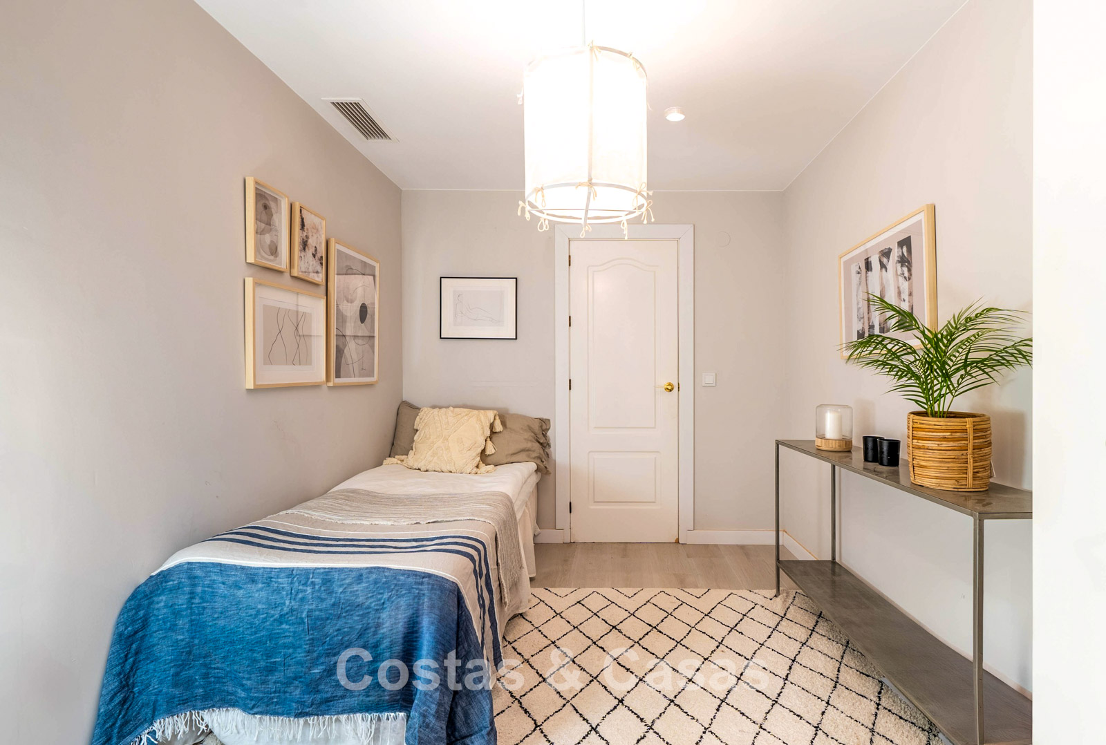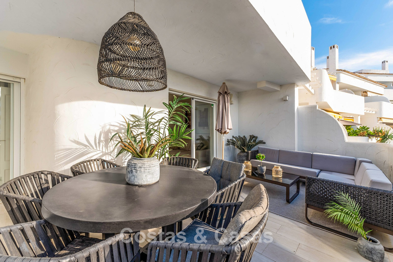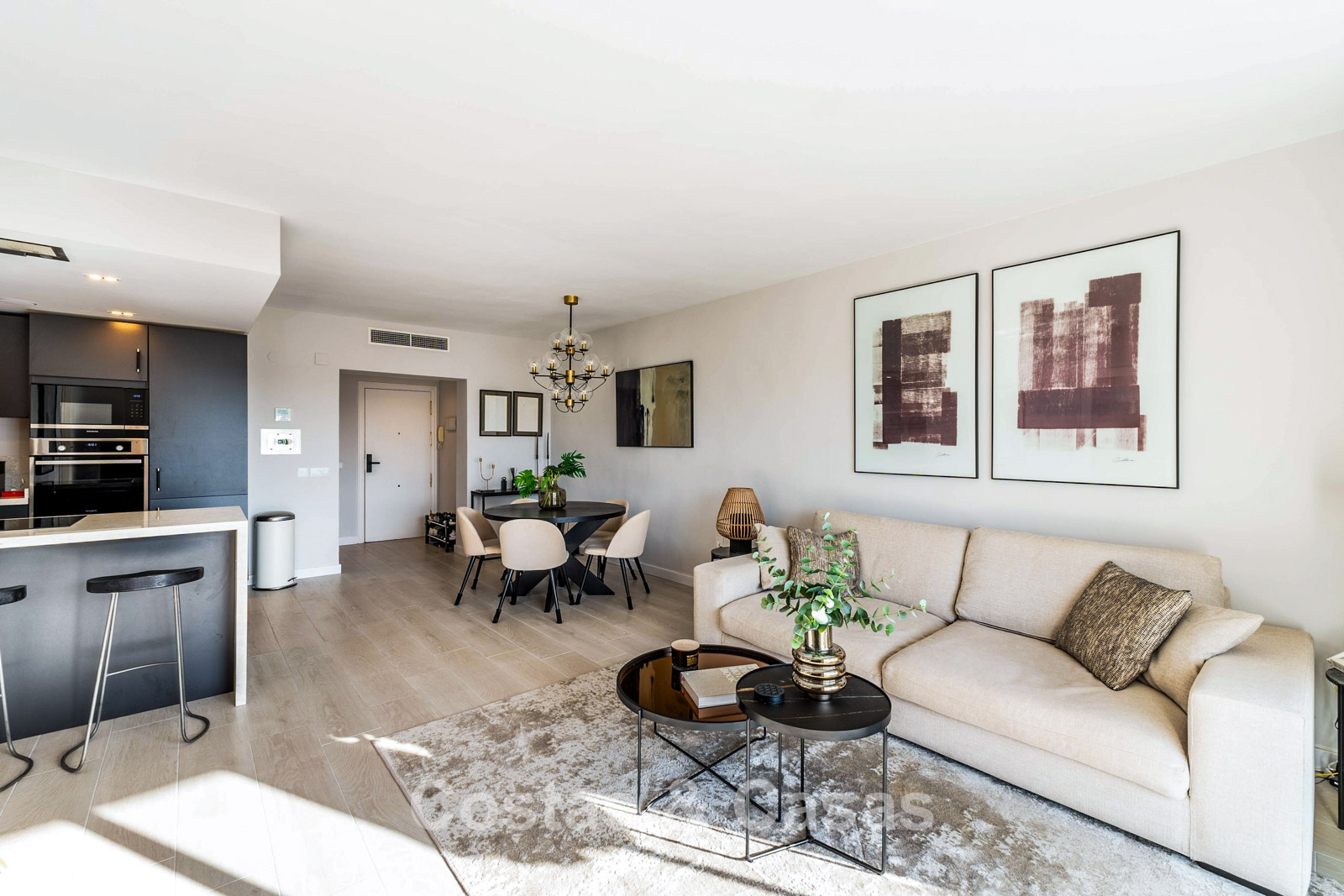 Appartement lumineux, élégamment rénové dans un style moderne. Finitions de haute qualité à un niveau élevé. Terrasse semi-ouverte avec espace chillout et espace ‘repas en plein air’. Orienté au sud. Vue partielle sur la mer Méditerranée. Intérieur contemporain avec un agencement moderne et ouvert et un style scandinave. Séjour ouvert avec salon et coin repas intégré. Cuisine/salle à manger pratique avec appareils Siemens de haute qualité et un bar pour le petit-déjeuner. De hautes fenêtres coulissantes dans le salon donnent accès à la terrasse et laissent également entrer beaucoup de lumière naturelle. 3 chambres, 2 salles de bains. Garage intérieur pour 1 voiture dans le garage commun.