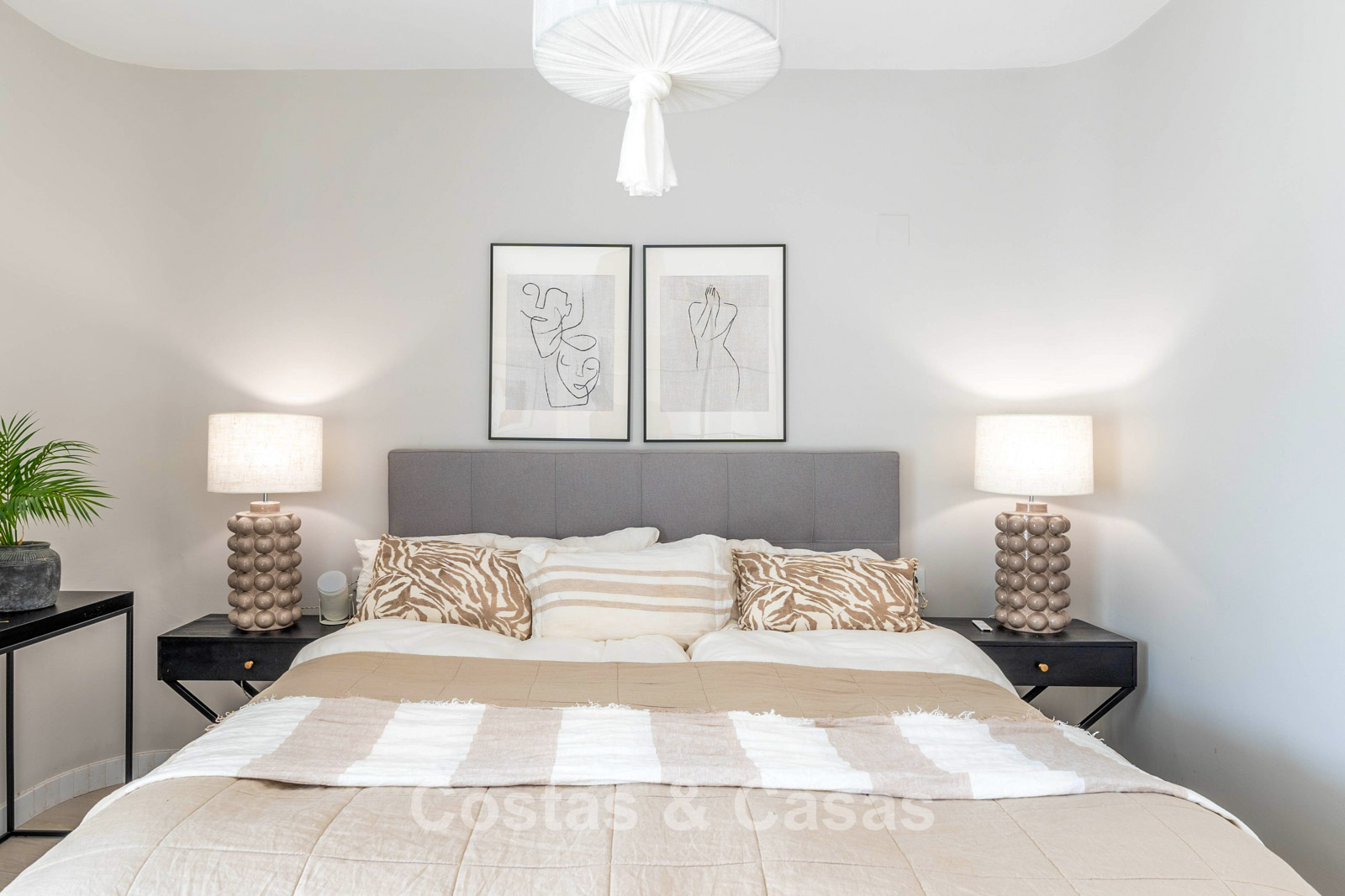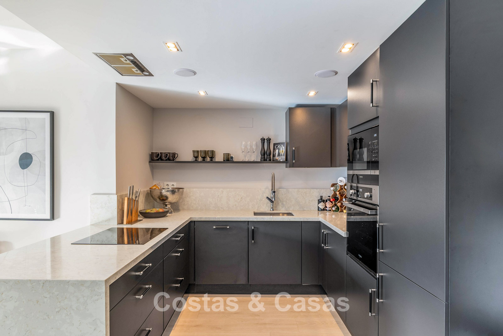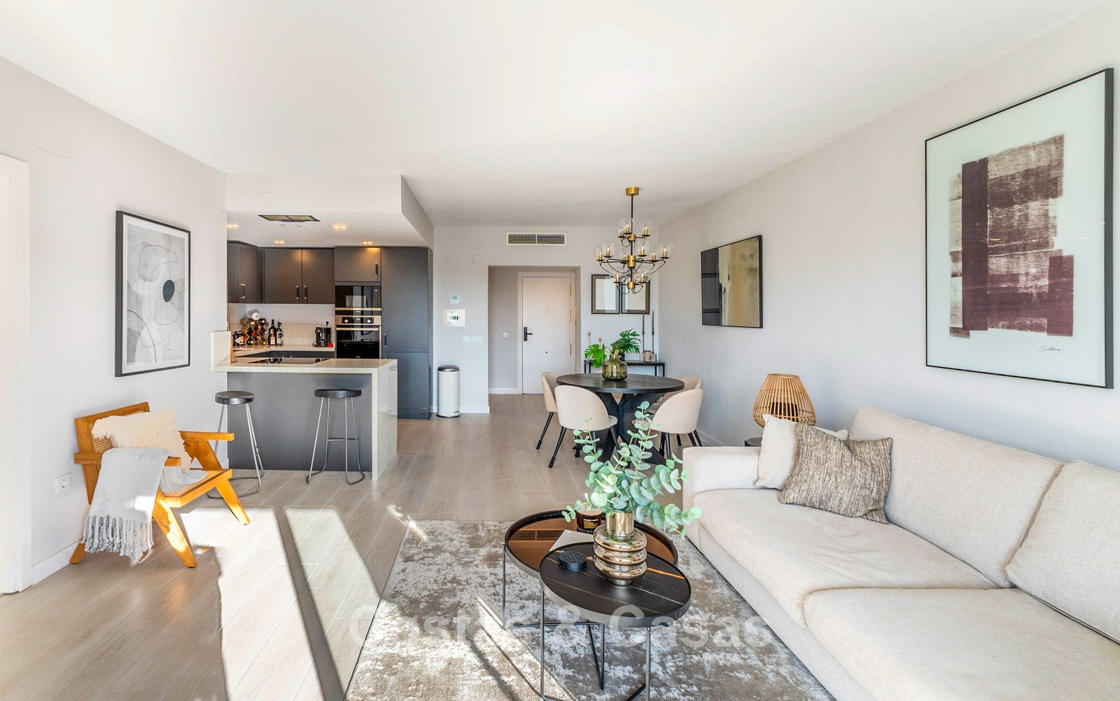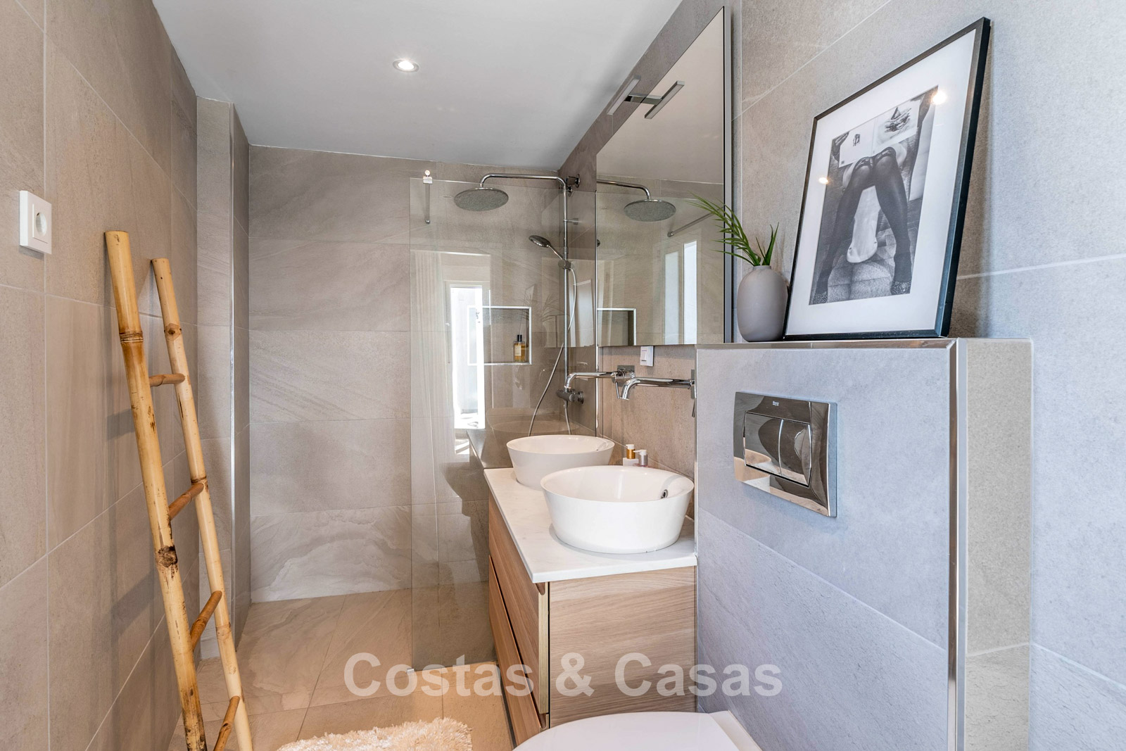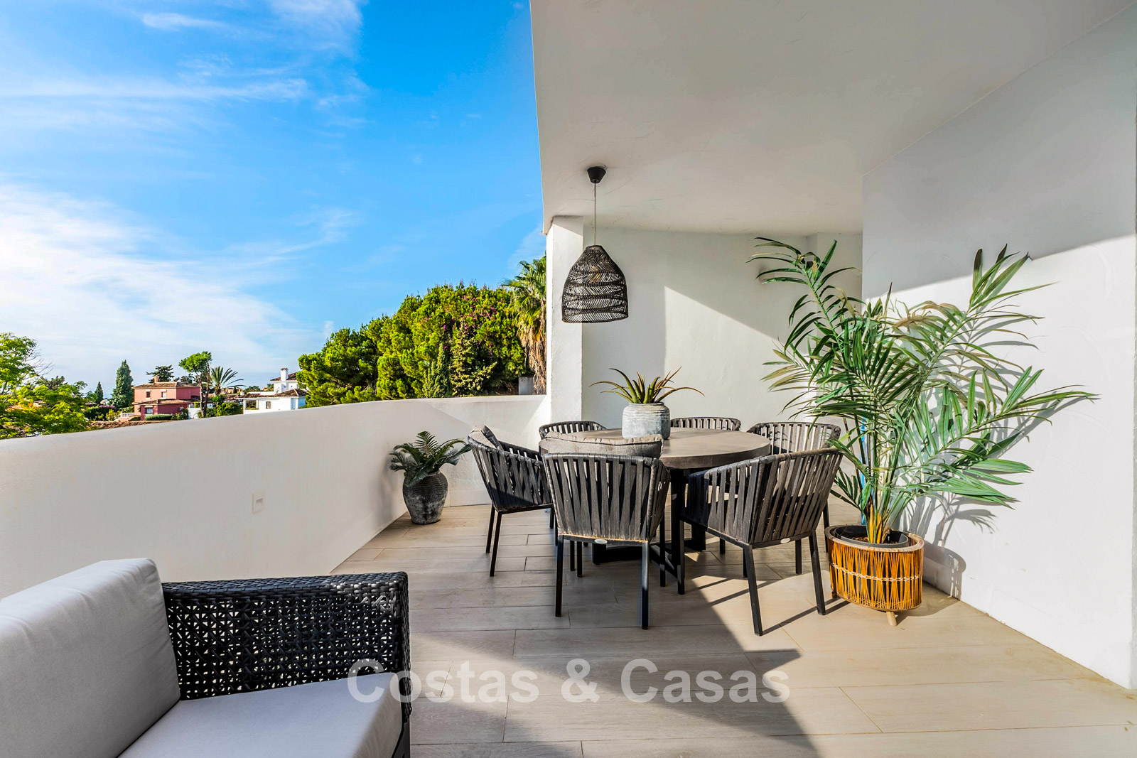 Appartement lumineux, élégamment rénové dans un style moderne. Finitions de haute qualité à un niveau élevé. Terrasse semi-ouverte avec espace chillout et espace ‘repas en plein air’. Orienté au sud. Vue partielle sur la mer Méditerranée. Intérieur contemporain avec un agencement moderne et ouvert et un style scandinave. Séjour ouvert avec salon et coin repas intégré. Cuisine/salle à manger pratique avec appareils Siemens de haute qualité et un bar pour le petit-déjeuner. De hautes fenêtres coulissantes dans le salon donnent accès à la terrasse et laissent également entrer beaucoup de lumière naturelle. 3 chambres, 2 salles de bains. Garage intérieur pour 1 voiture dans le garage commun.