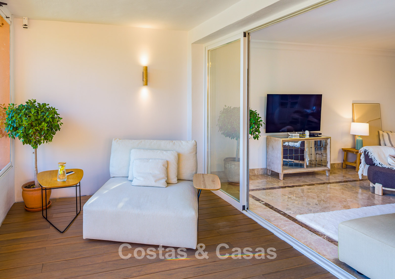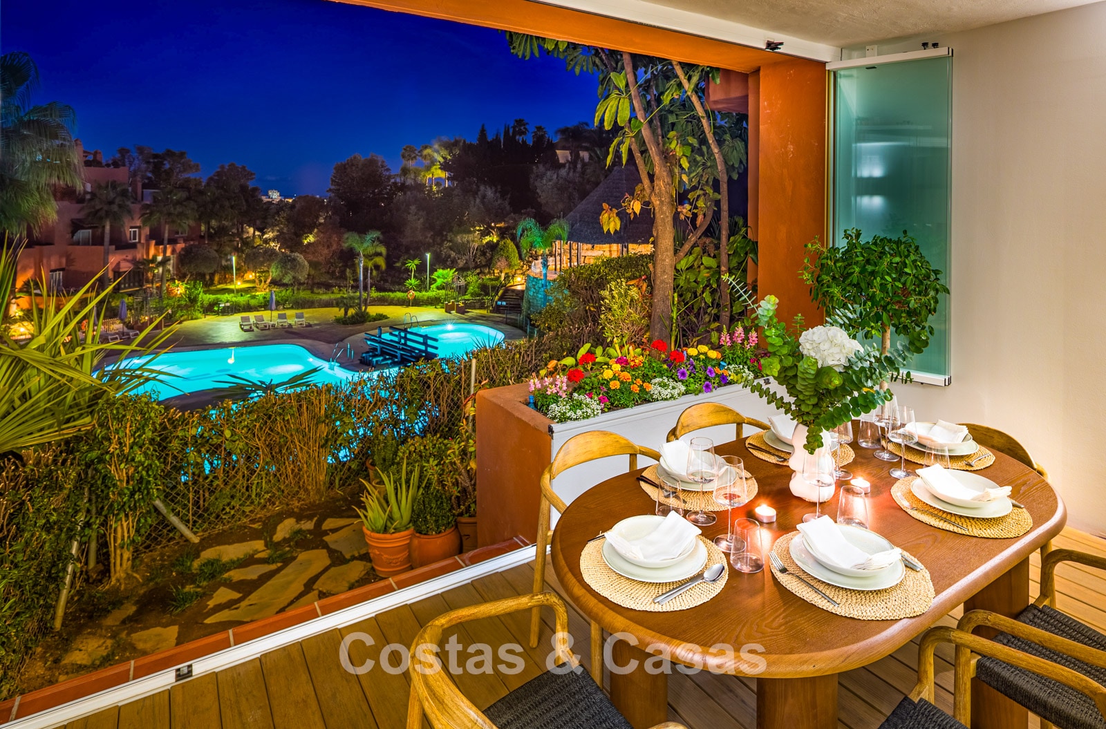 Terrasse couverte avec rideaux en verre pouvant être entièrement ouverts ou fermés, prolongeant l’espace de vie.