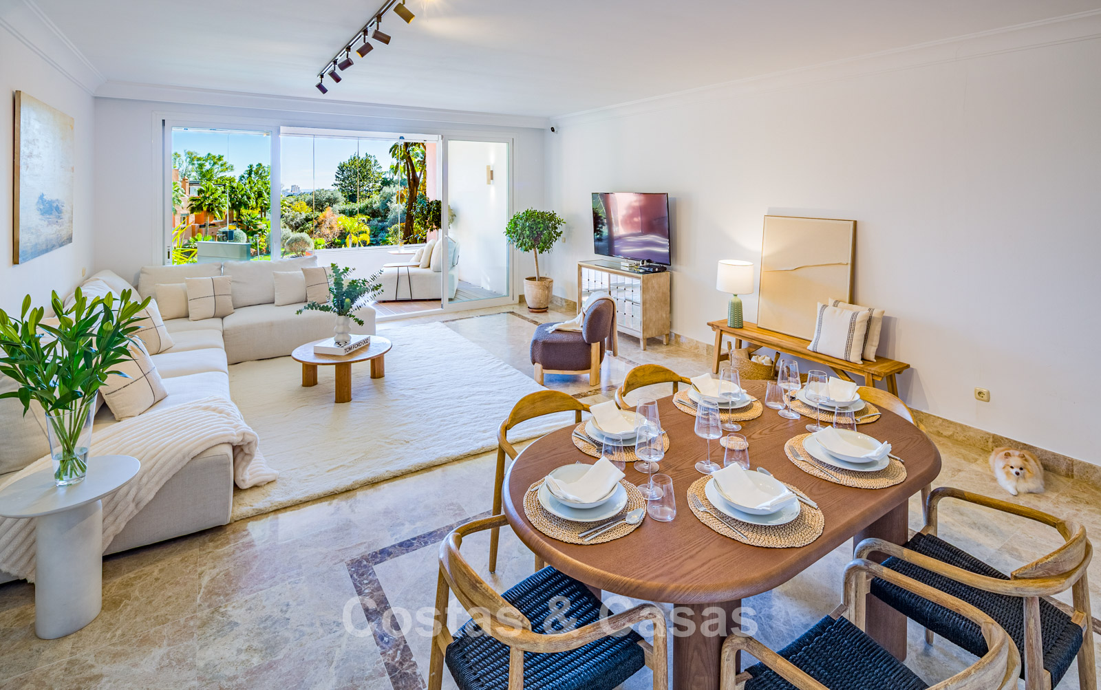 Salon spacieux avec coin TV et salle à manger.