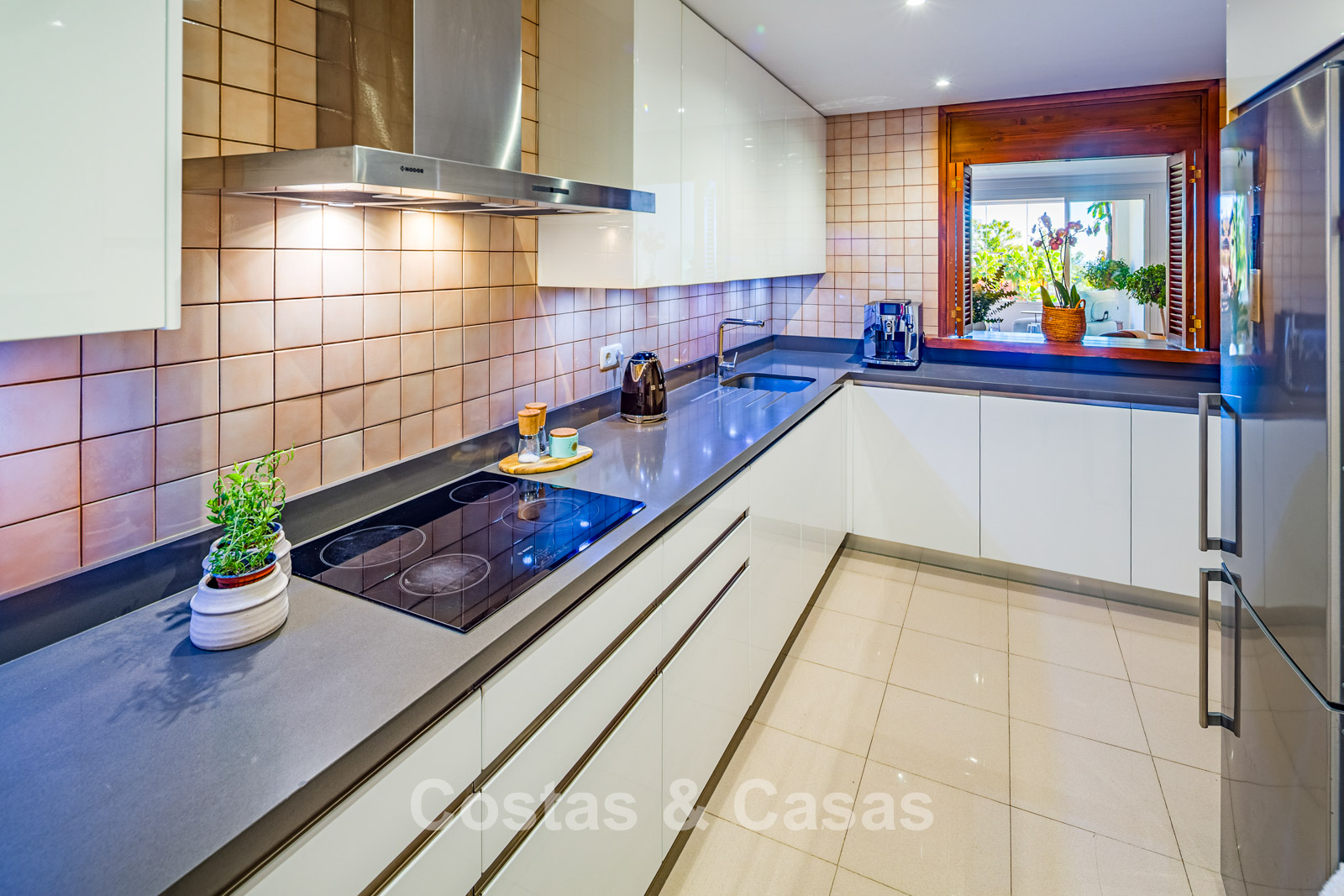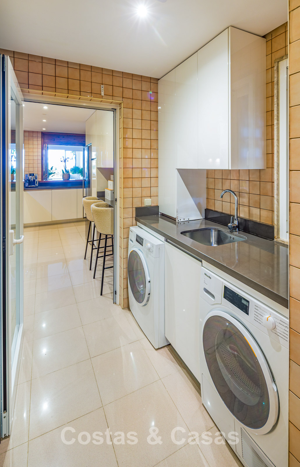 La cuisine est actuellement fonctionnelle, avec possibilité d’une transformation complète en cuisine ouverte avec appareils Miele.