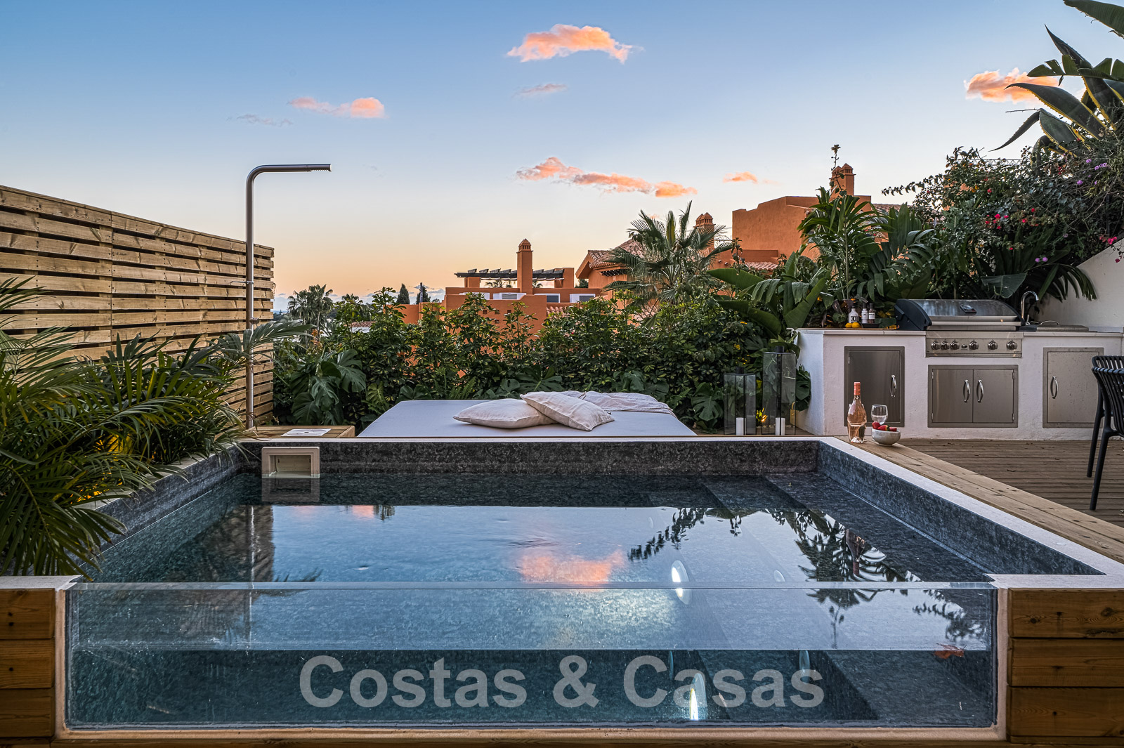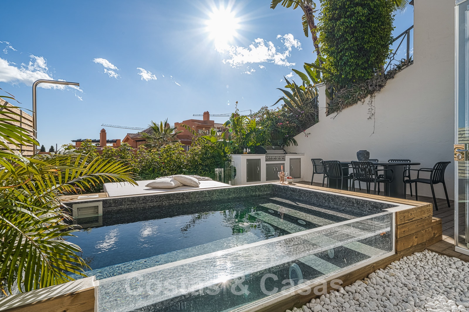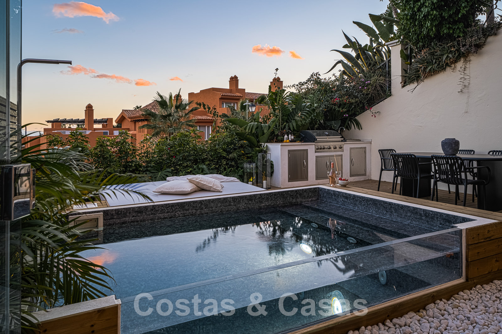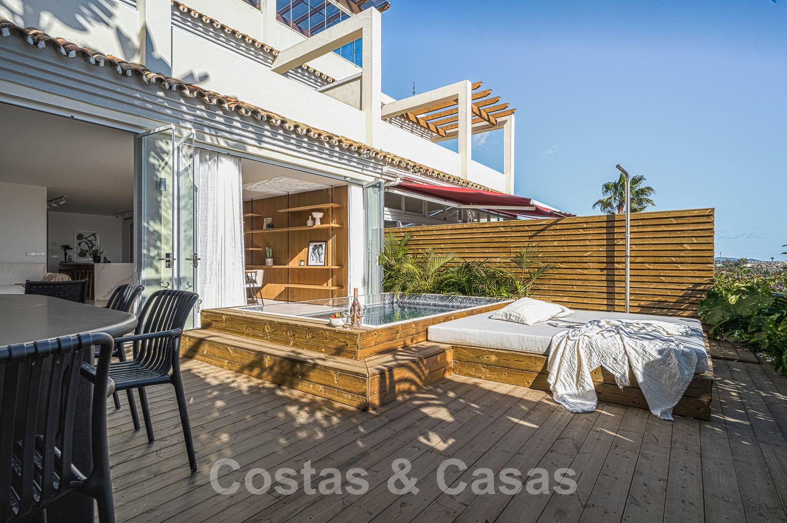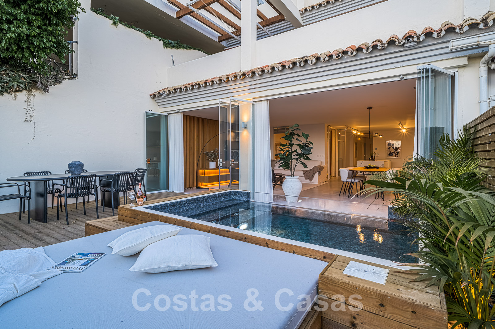 Les deux appartements bénéficient d'une piscine privée avec un salon et un espace de relaxation adjacents.