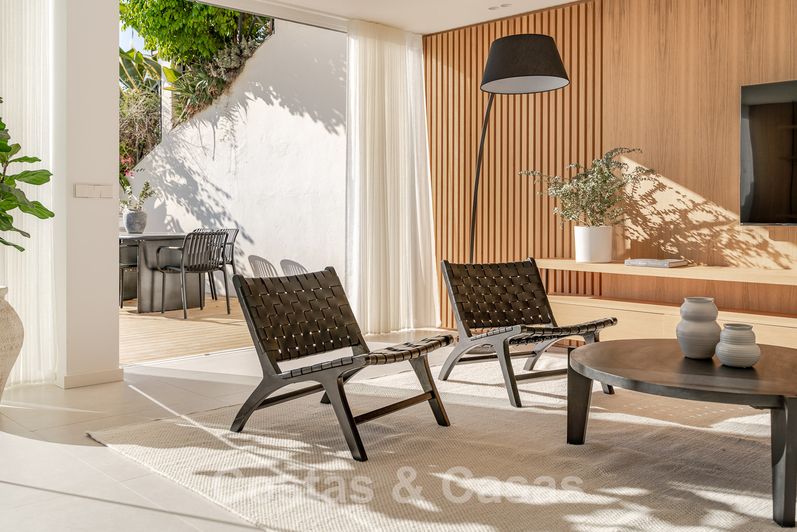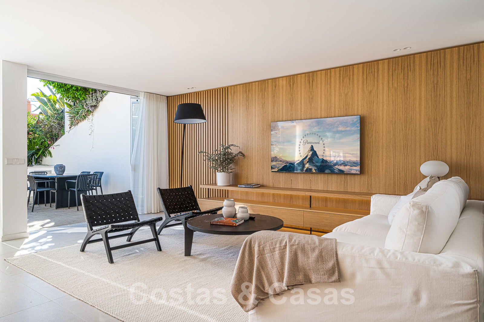 L'espace de vie et la terrasse sont séparés par des baies vitrées coulissantes.