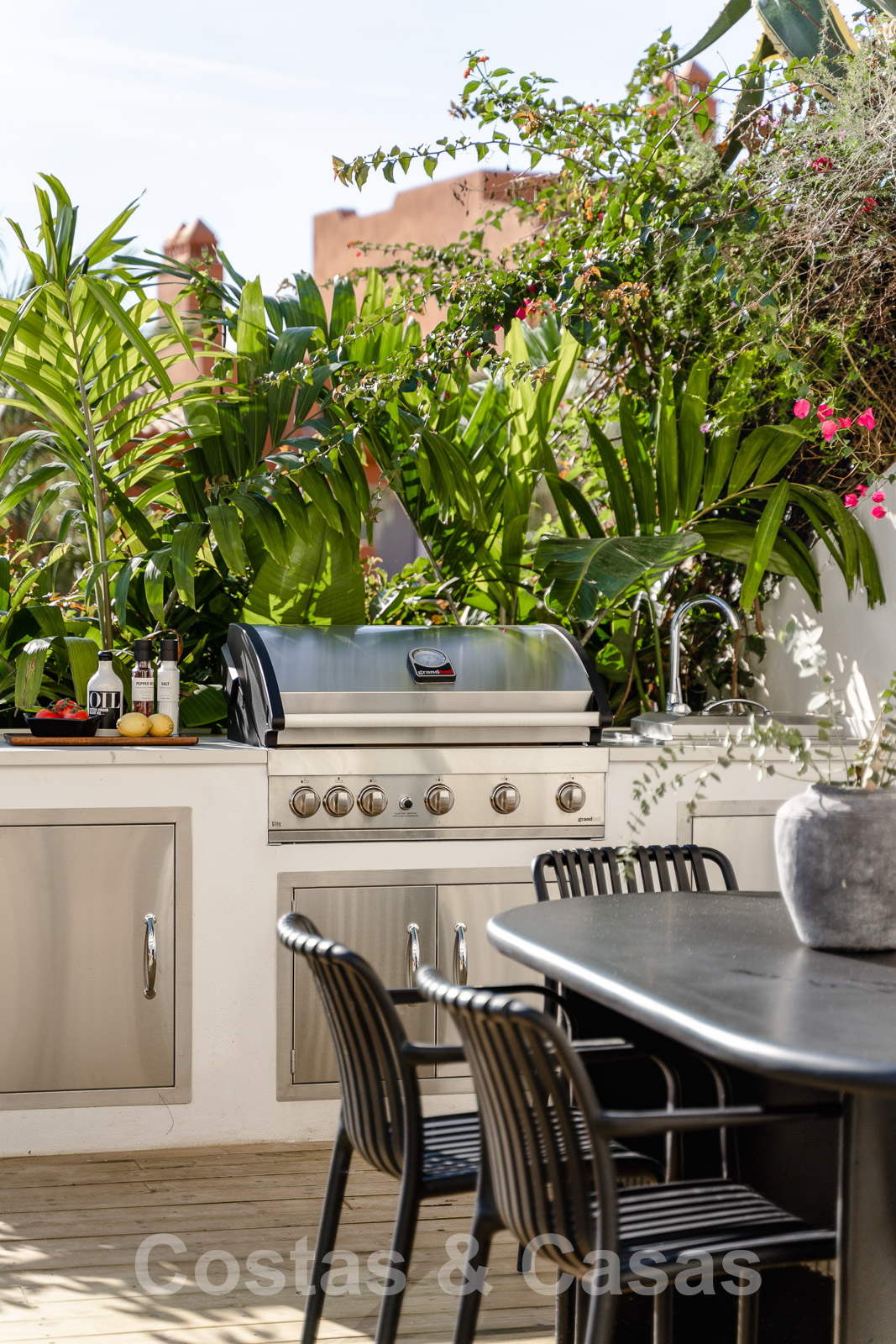 Vaste terrasse en bois avec cuisine extérieure et coin repas en plein air.
