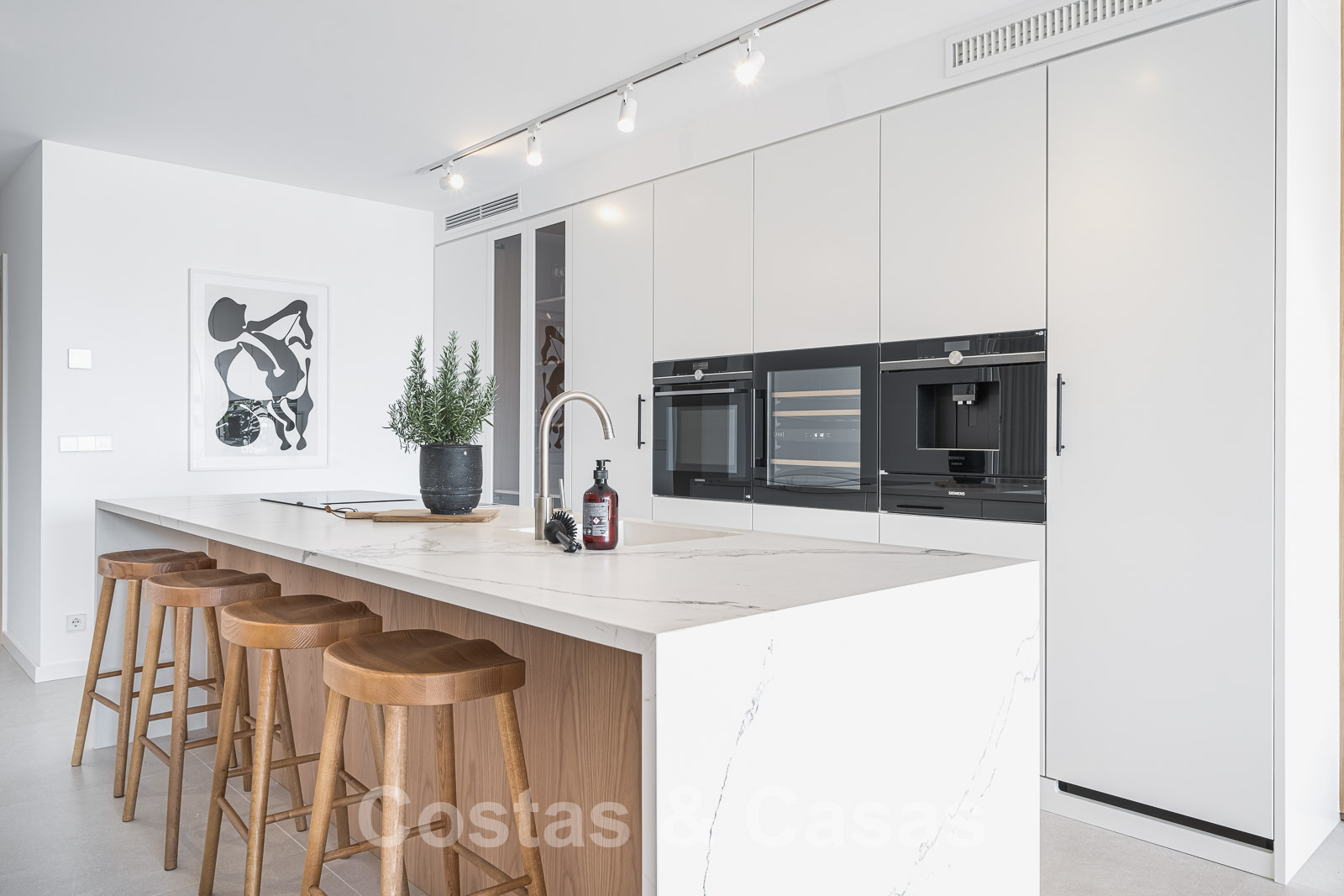 Cuisine moderne ouverte avec un îlot de cuisson en marbre et un bar pour le petit déjeuner.