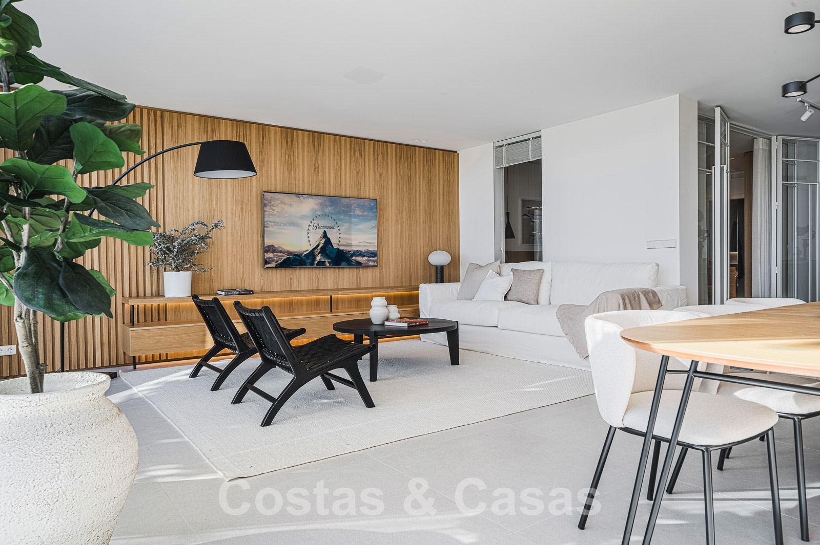 En entrant, vous entrez dans l'espace de vie ouvert avec un salon TV et une salle à manger.