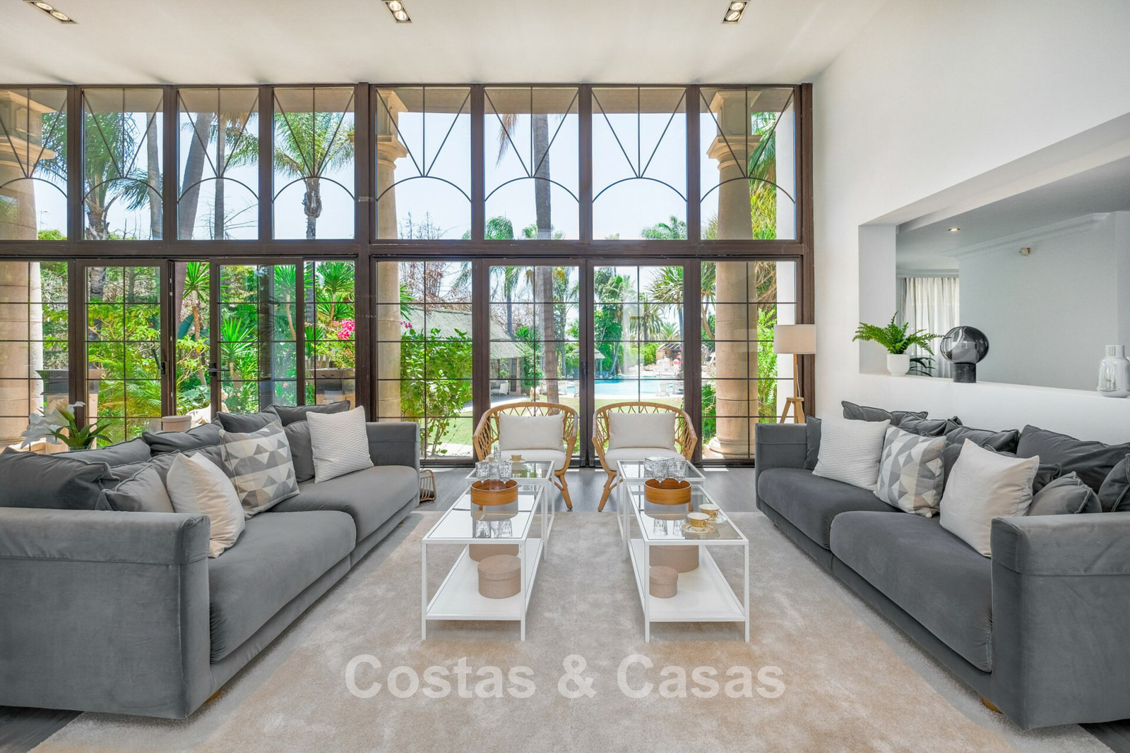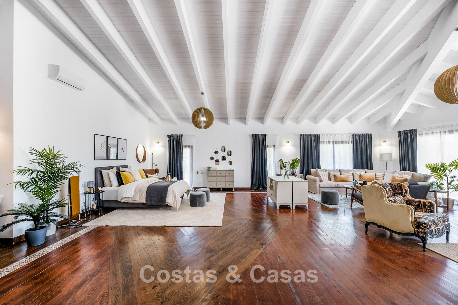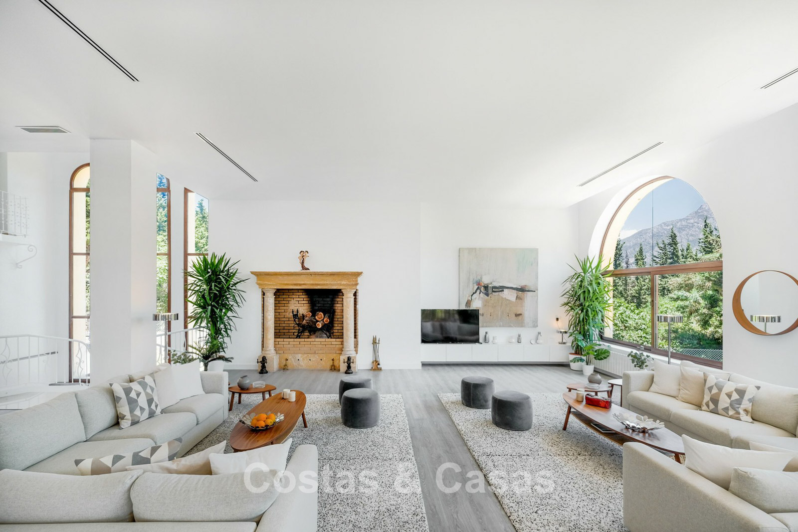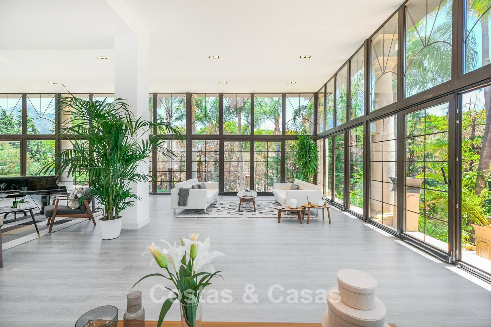 Une superbe villa de charme individuelle qui combine des caractéristiques traditionnelles et modernes. Rénovée et transformée en style loft new-yorkais. De nombreuses portes-fenêtres offrent une abondance de lumière naturelle, créant des espaces aérés et accueillants. Le salon et la salle à manger sont un espace impressionnant avec une double hauteur sous plafond, comprenant plusieurs coins salon, un piano, du parquet et une abondance de portes-fenêtres du sol au plafond donnant sur les magnifiques jardins paysagers. Une cuisine ultra-moderne équipée du matériel nécessaire de haute qualité. 10 chambres élégamment meublées, chacune avec sa propre salle de bain. La chambre principale a une superficie de plus de 200m², un lit king size, plusieurs coins salon, une grande salle de bain avec bain à remous et une terrasse privée. Parking pour plusieurs voitures.