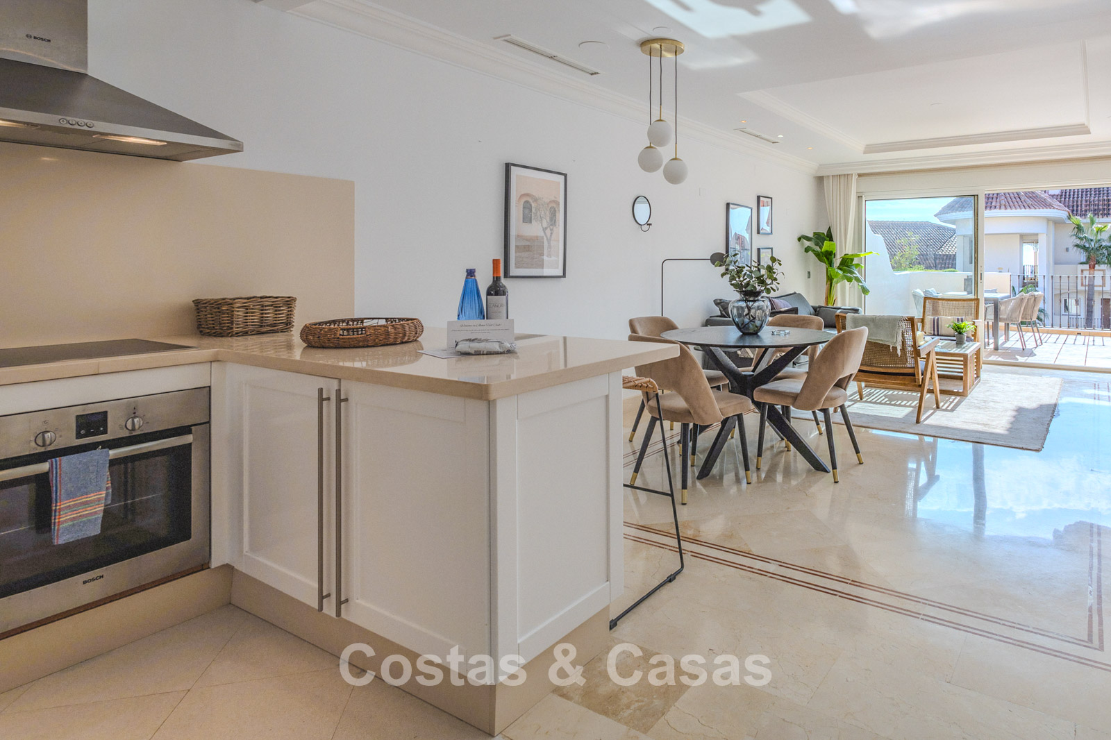 Appartement spacieux en excellent état. Utilisation de matériaux de qualité. Situé au sud. Vue sur la mer et le paysage de montagne. Terrasse ensoleillée où vous pourrez profiter de l'agréable climat méditerranéen toute l'année. Intérieur lumineux et aéré avec un aménagement ouvert. Séjour ouvert avec un salon cosy et un coin repas intégré. De hautes fenêtres coulissantes s'ouvrent sur la terrasse et offrent beaucoup de lumière naturelle. Cuisine ouverte en L entièrement équipée avec appareils Bosch et bar à petit-déjeuner. 2 chambres, 2 salles de bain. Sols en marbre. Débarras. Garage intérieur pour 1 voiture.