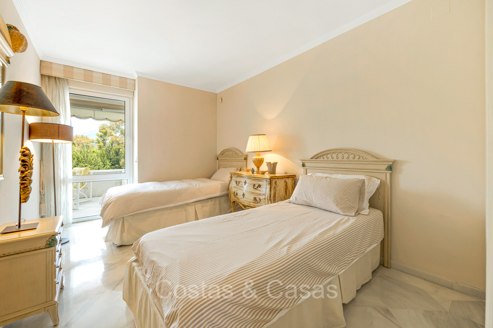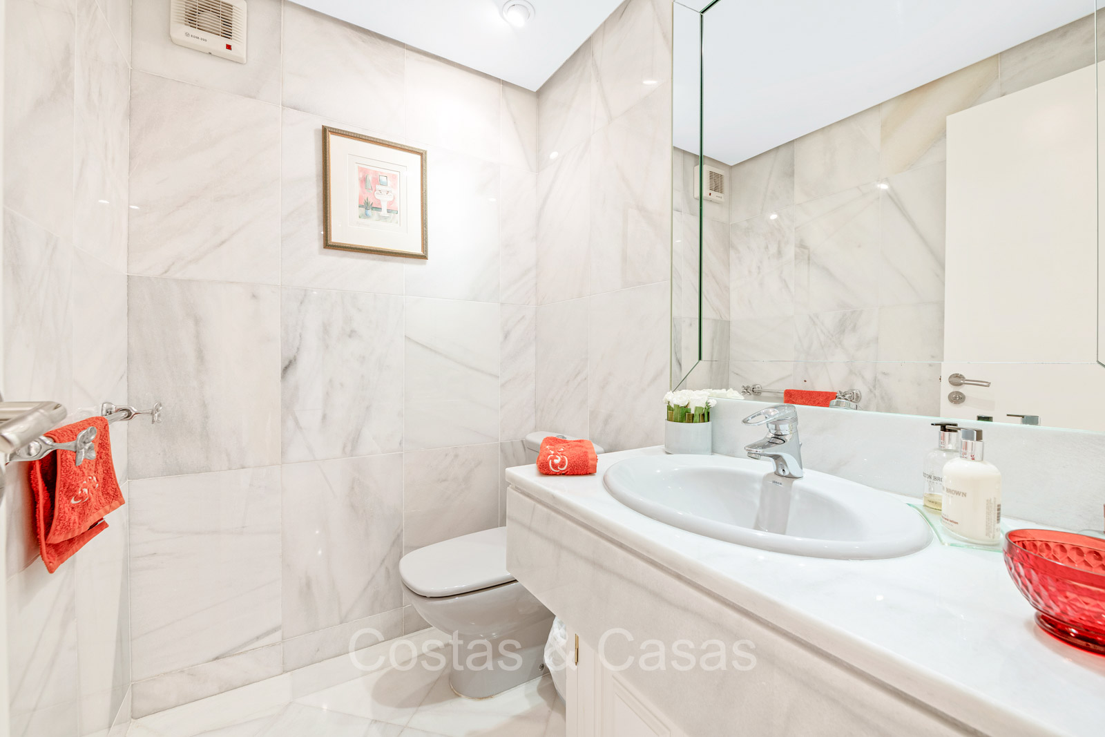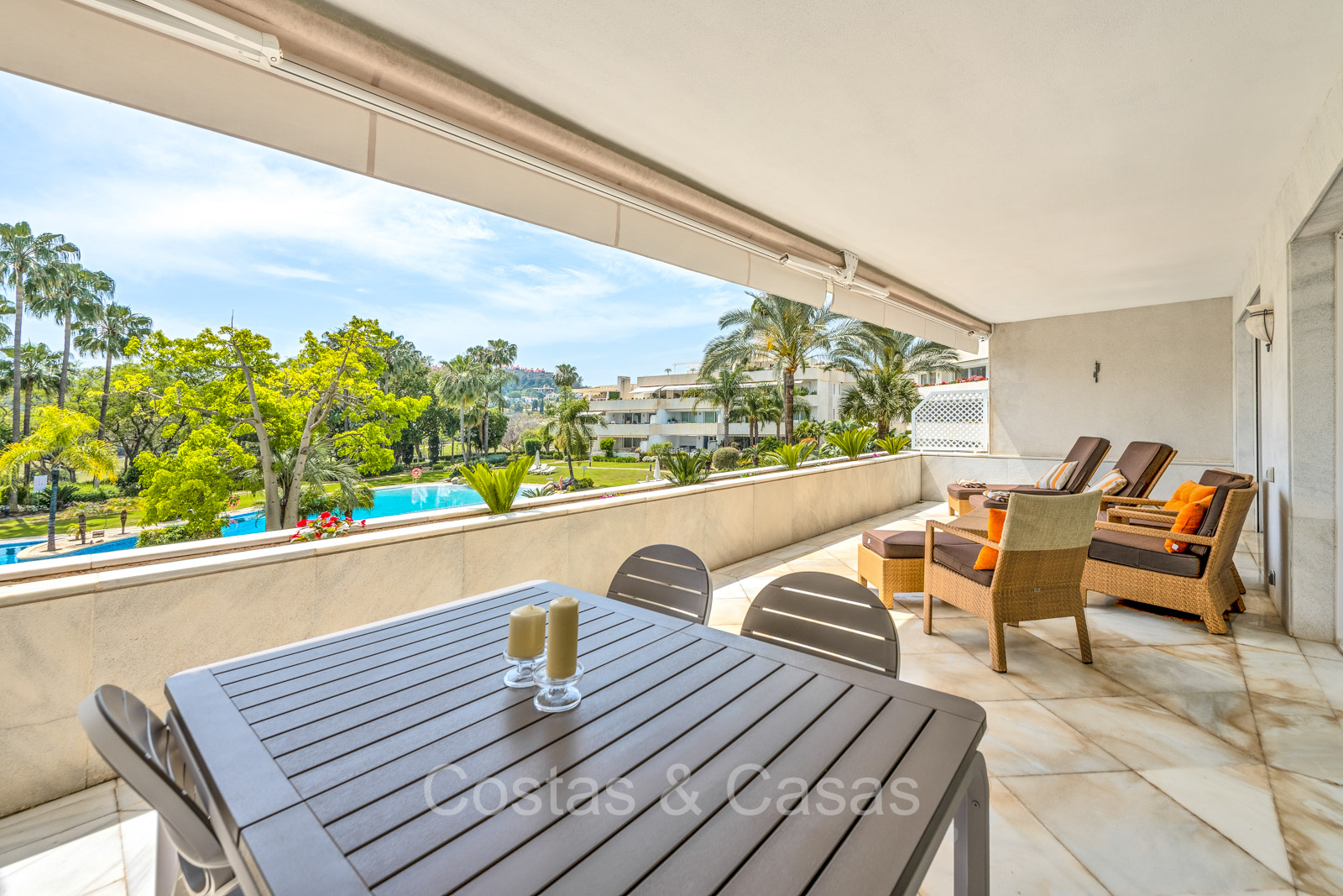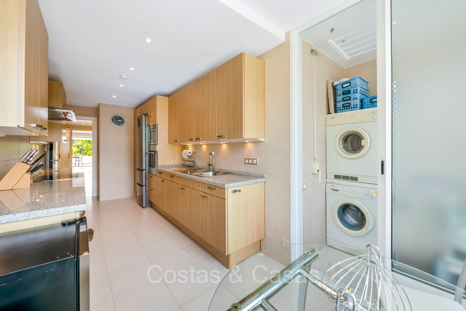 Appartement spacieux au premier étage. Situé au sud-ouest. Spacieuse terrasse couverte donnant sur les jardins. De hautes fenêtres coulissantes s'ouvrent sur la terrasse spacieuse. Séjour ouvert avec un salon TV cosy. Coin repas intégré. Cuisine séparée entièrement équipée avec une buanderie adjacente. 3 chambres, 3 salles de bains et une toilette séparée. Sols en marbre de qualité. Débarras. Garage double et local buggy.