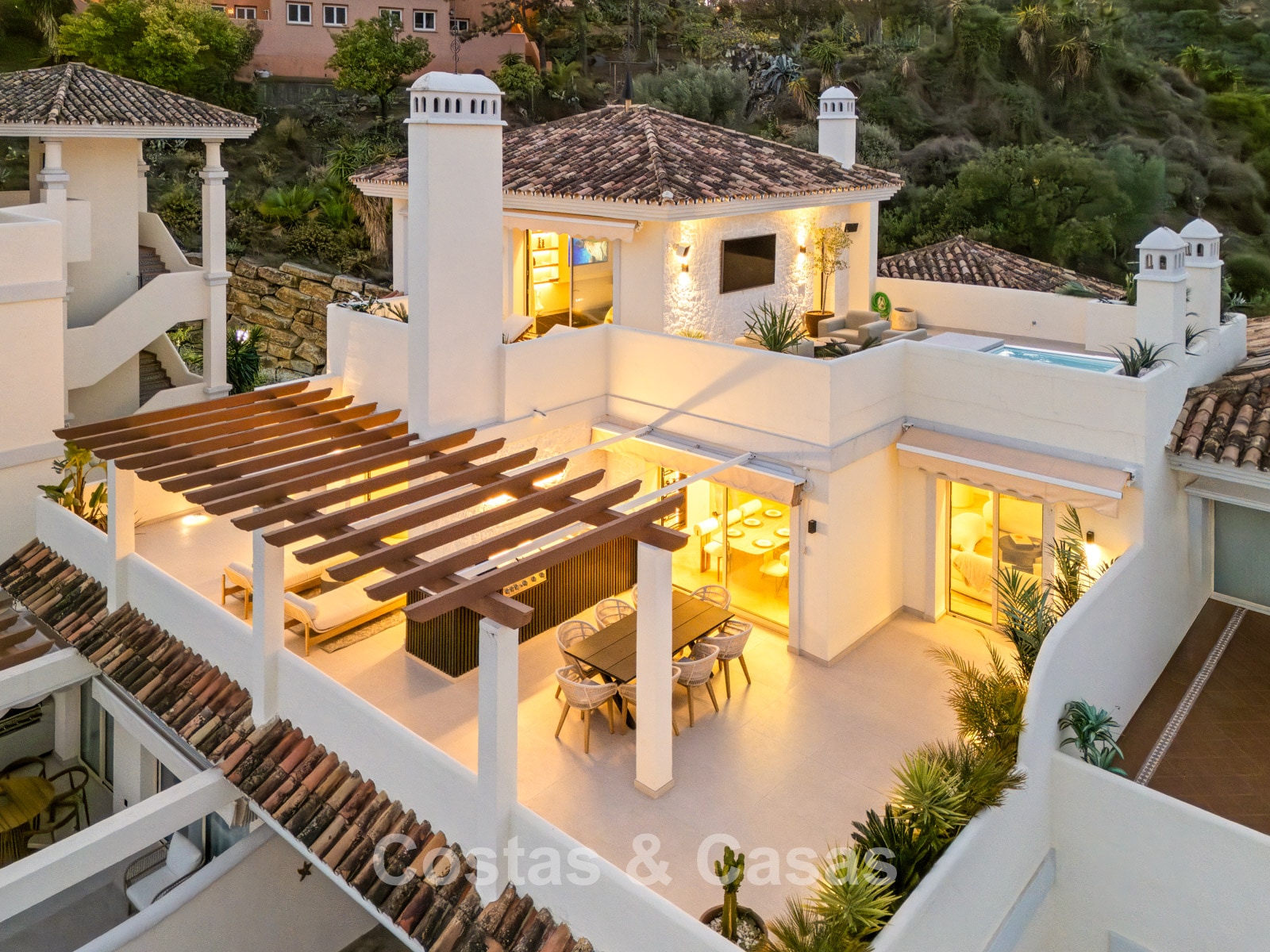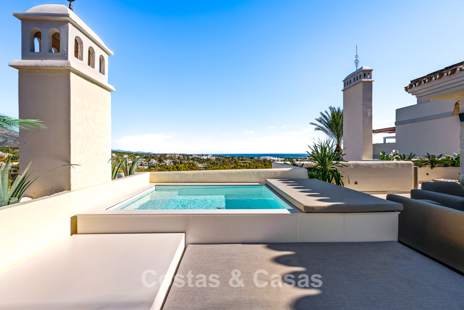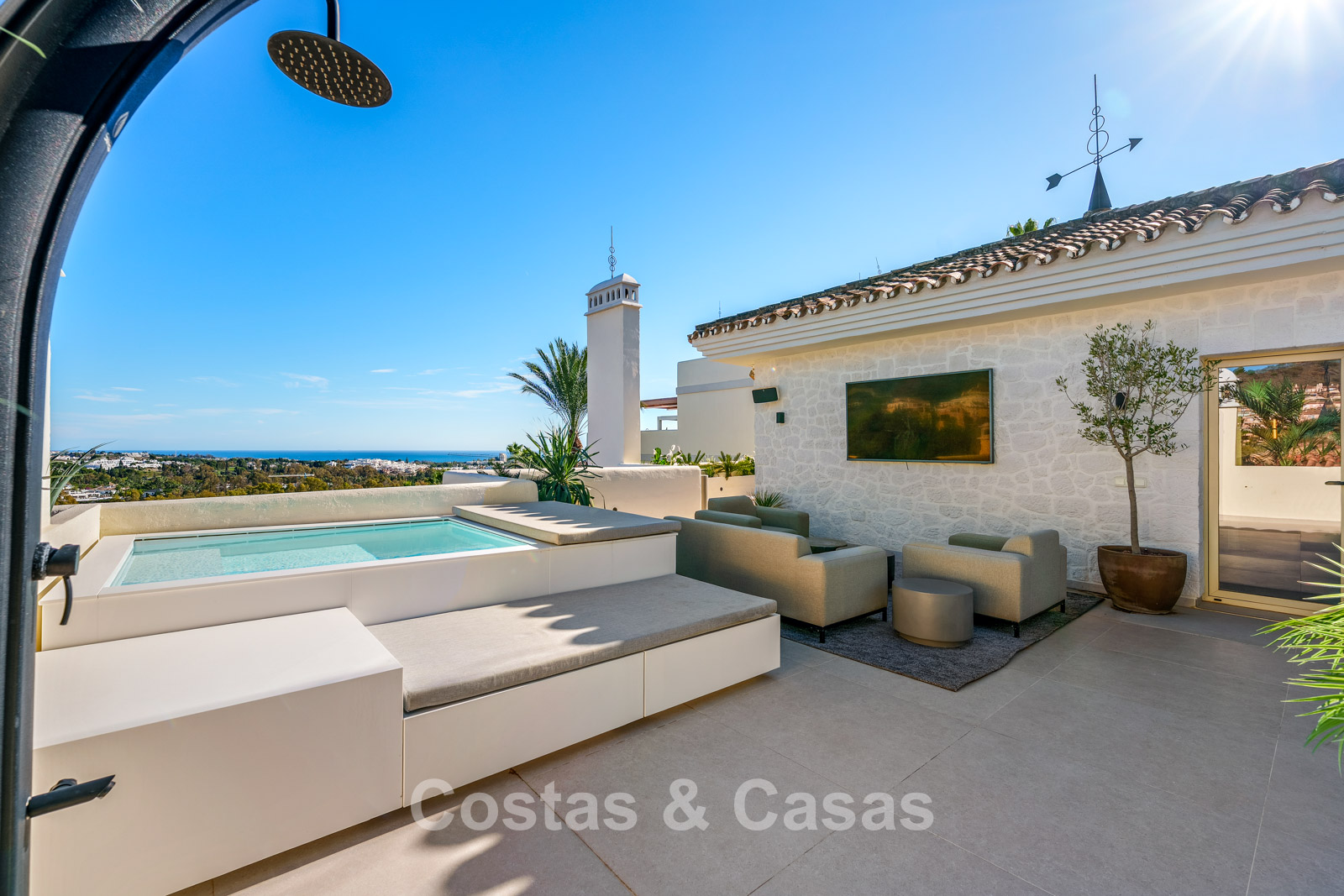 Terrasse sur le toit avec piscine privée.